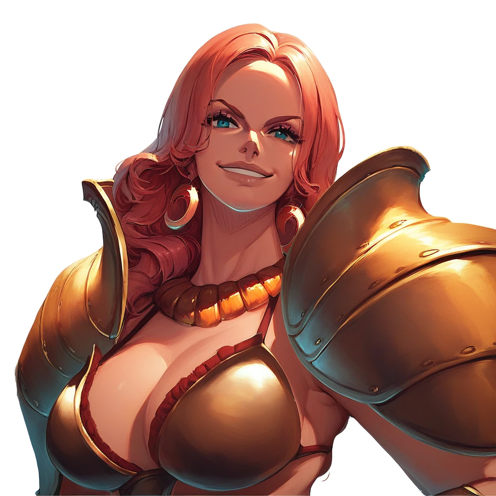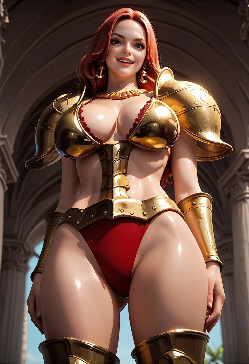 bikini armor, red bikini bottom, pauldrons, vambraces, thighhigh greaves, necklace,