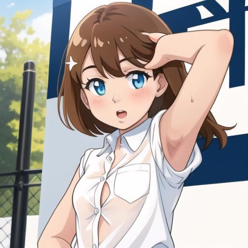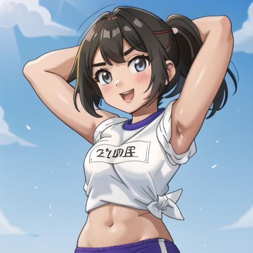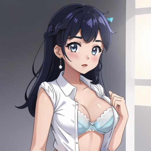 variations: tied shirt, open shirt, shirt lift, buttons, crop top