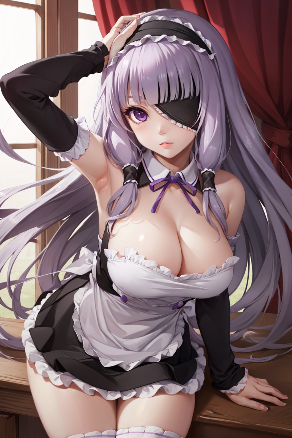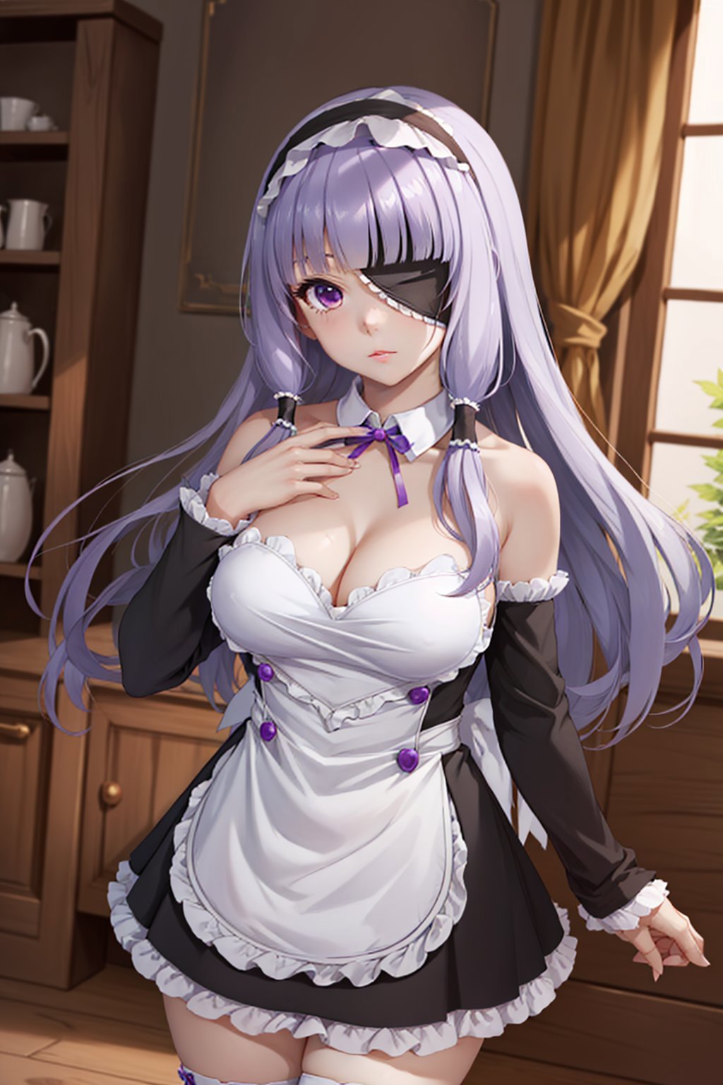 Default Outfit: hairband, eyepatch, maid, apron, detached sleeves, white thighhighs, bare shoulders, cleavage