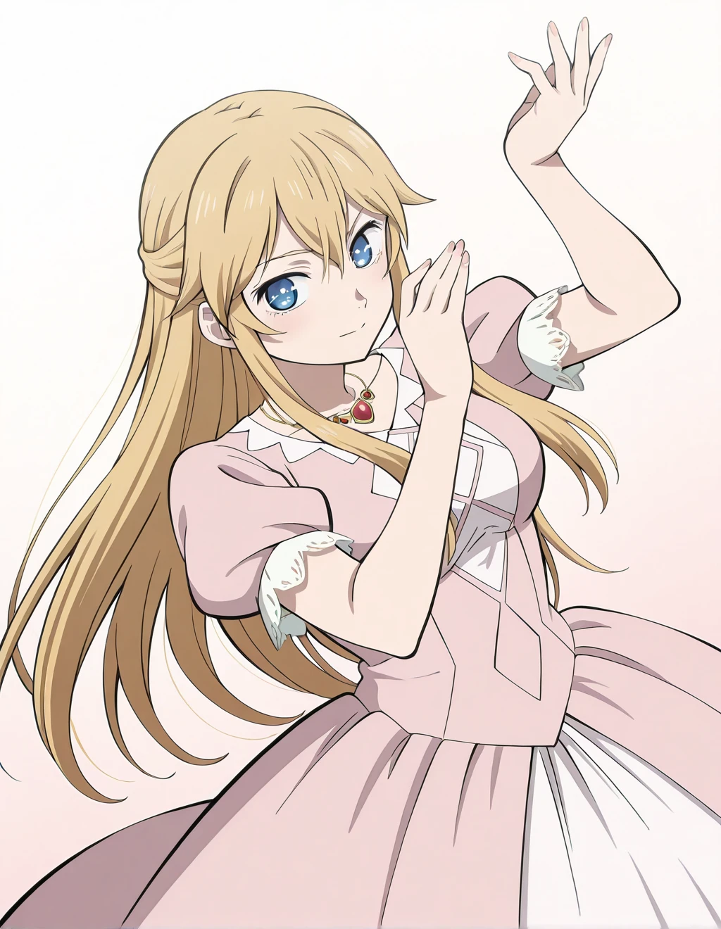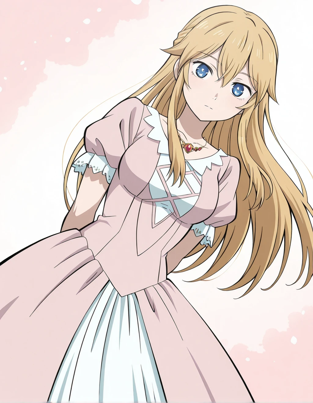delicate gemstone necklace with red jewels, elegant pastel pink dress with white inner panel, puffed short sleeves with lace cuffs, fitted waist and flowing skirt