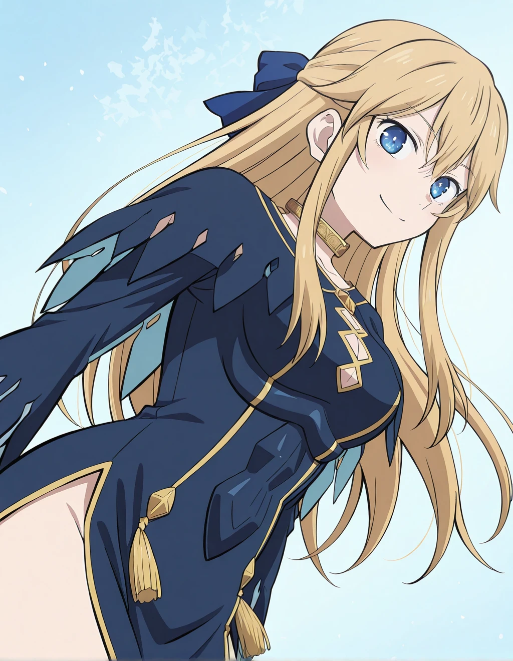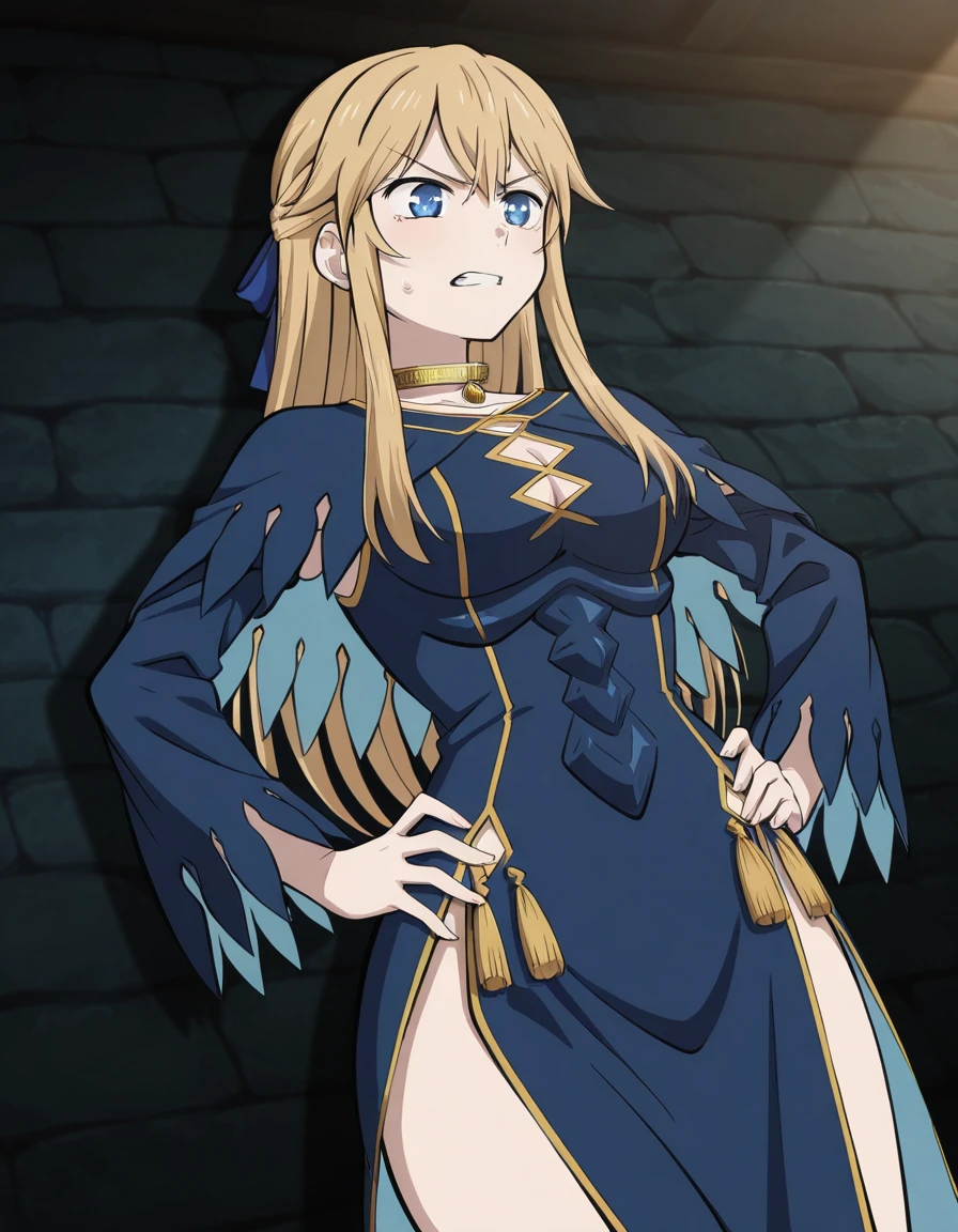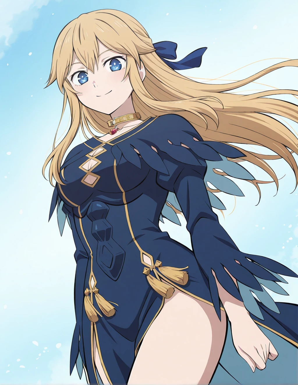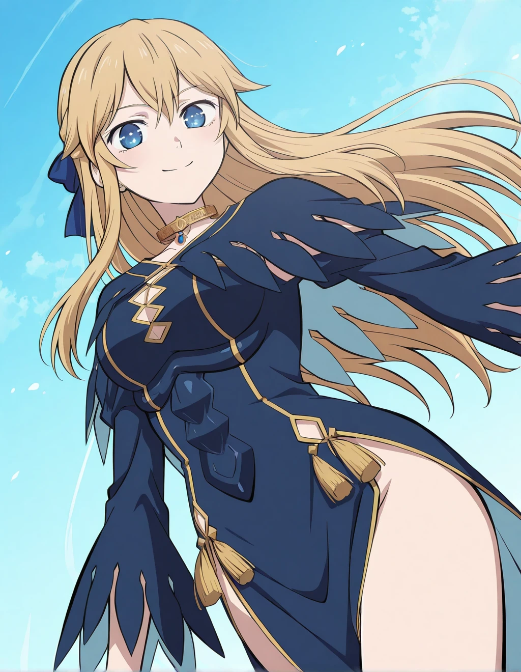 Serafina de Lavillant, slim silhouette, gold choker necklace, elegant dark navy blue long dress with gold trim and geometric cutouts, fitted bodice with structured panels, long sleeves with feather-like torn edges and light blue inner lining, high side slit exposing thigh, decorative gold tassels at waist, dark ankle boots with low heel