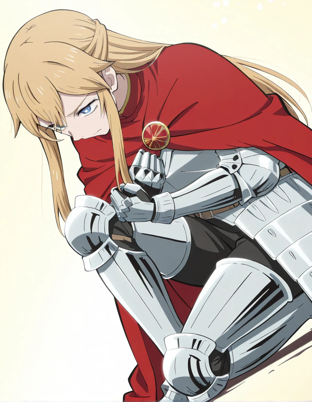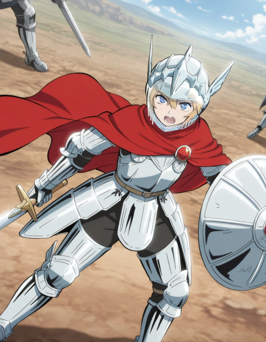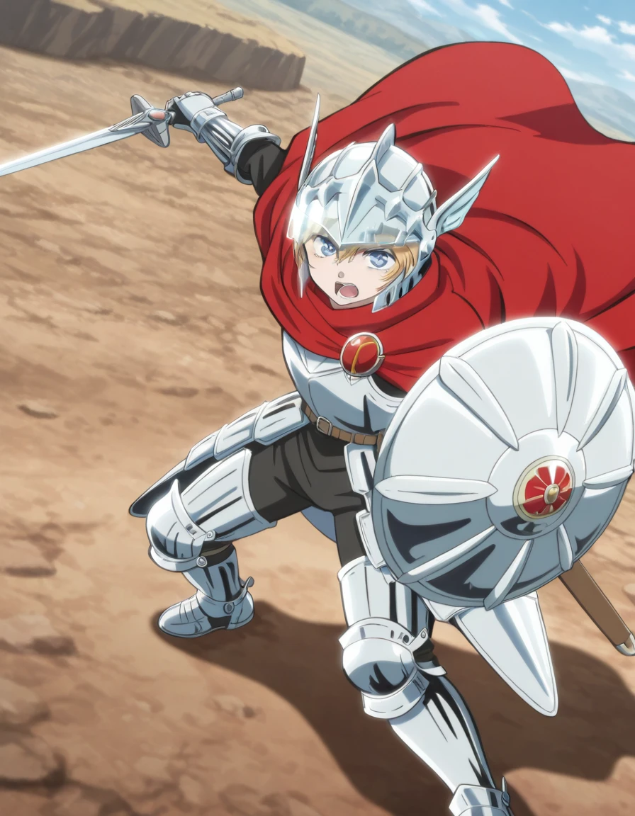 silver winged helmet with translucent visor, red cloak fastened with circular brooch, full-body polished silver armor with articulated plates, reinforced chestplate, shoulder guards, gauntlets and leg armor, brown belt, visible sword at waist, fitted armored silhouette, heavy armored boots, large round shield with emblem