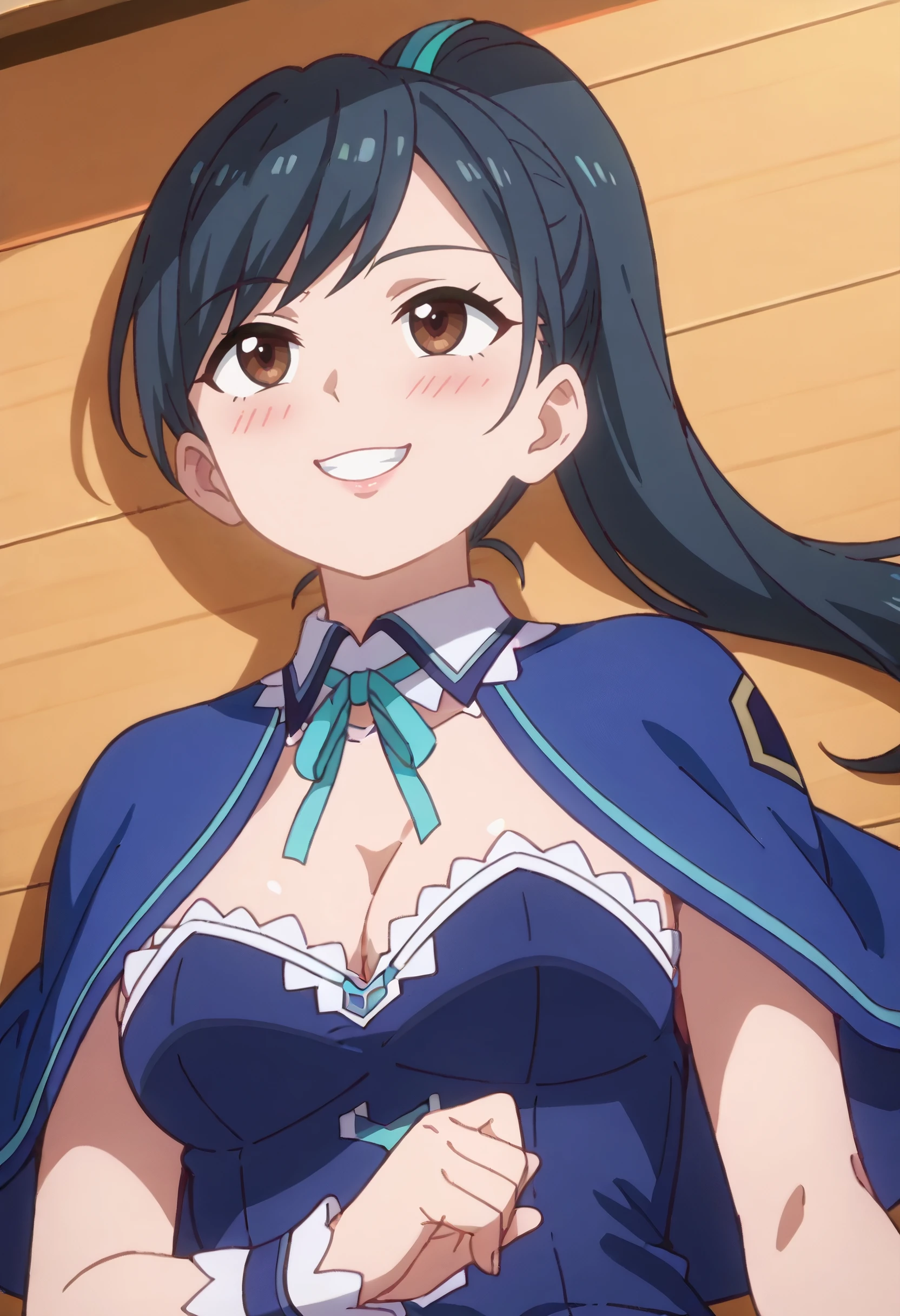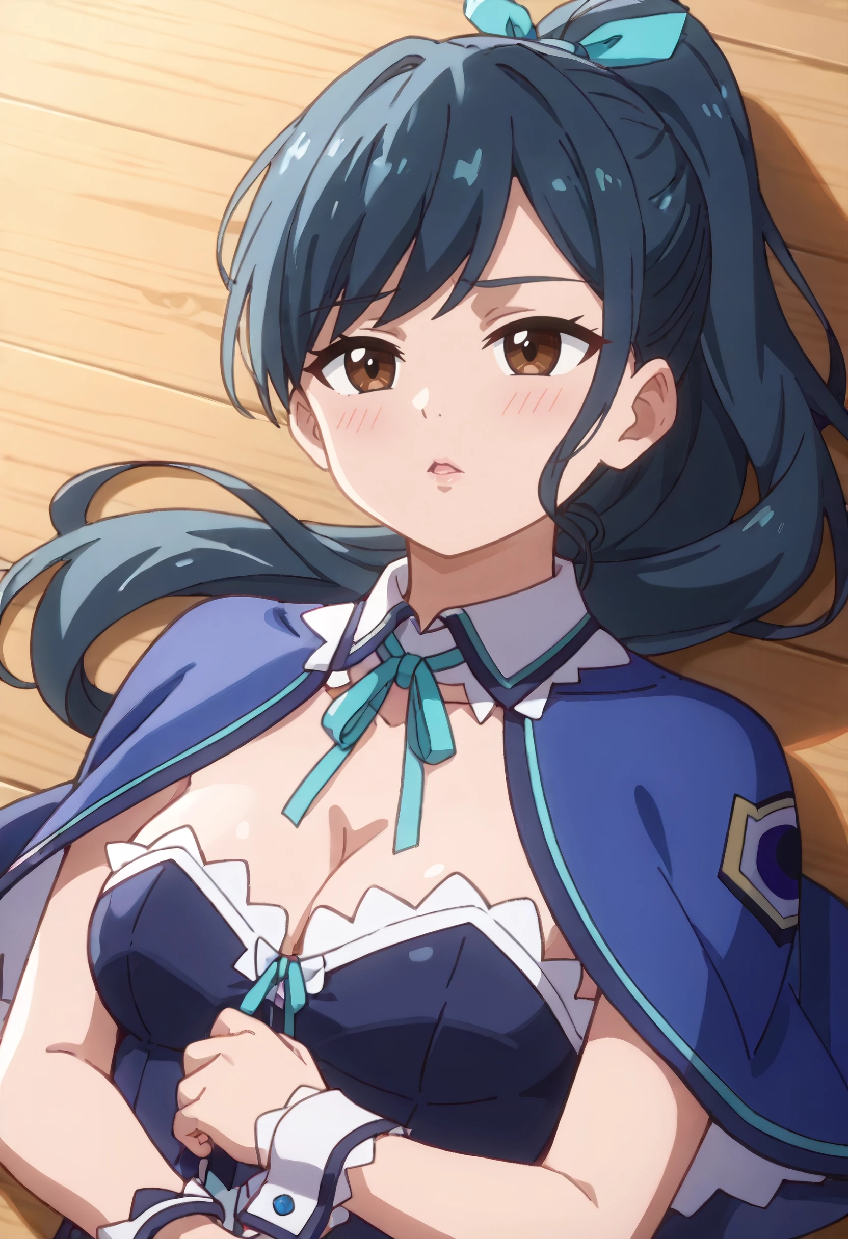 LemmingSchool, blue capelet, ribbon, aqua ribbon, cleavage, neck ribbon, detached collar, school uniform, strapless, blue dress, wrist cuffs, strapless dress, frills,