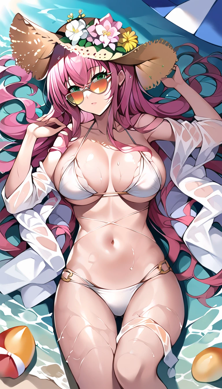 1girl,breasts,hat,large breasts,long hair,straw hat,sun hat,bikini,flower,green eyes,swimsuit,hat flower,white bikini,bangs,hair between eyes,sunglasses,orange-tinted eyewear,bare shoulders,wet,cleavage,navel,thighs,pink hair,very long hair,multiple straps,