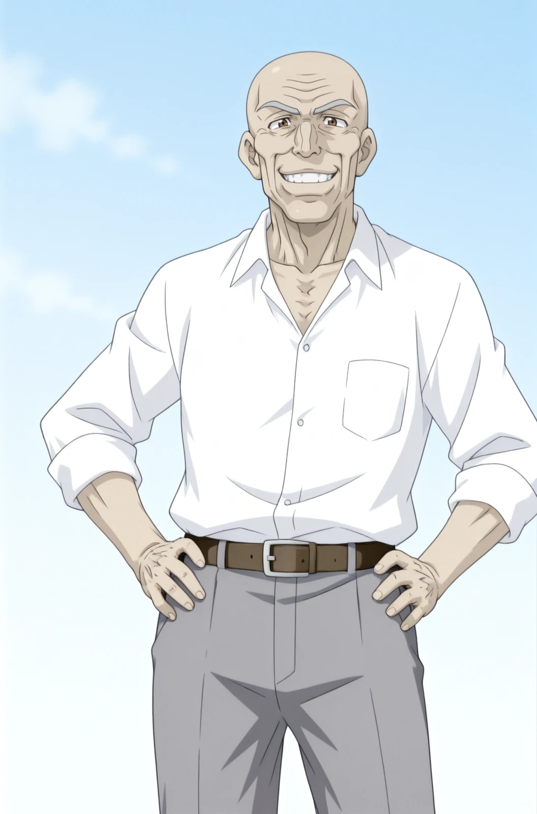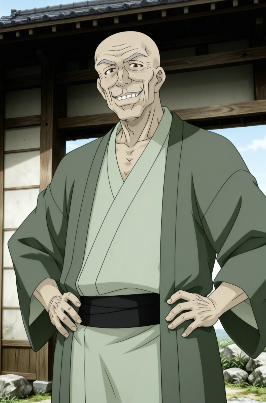 1boy, male focus, solo, tomizo_takayanagi, old, bald, japanese clothes, smile, old man, grin, brown eyes , looking at viewer, obi, hands oh hips