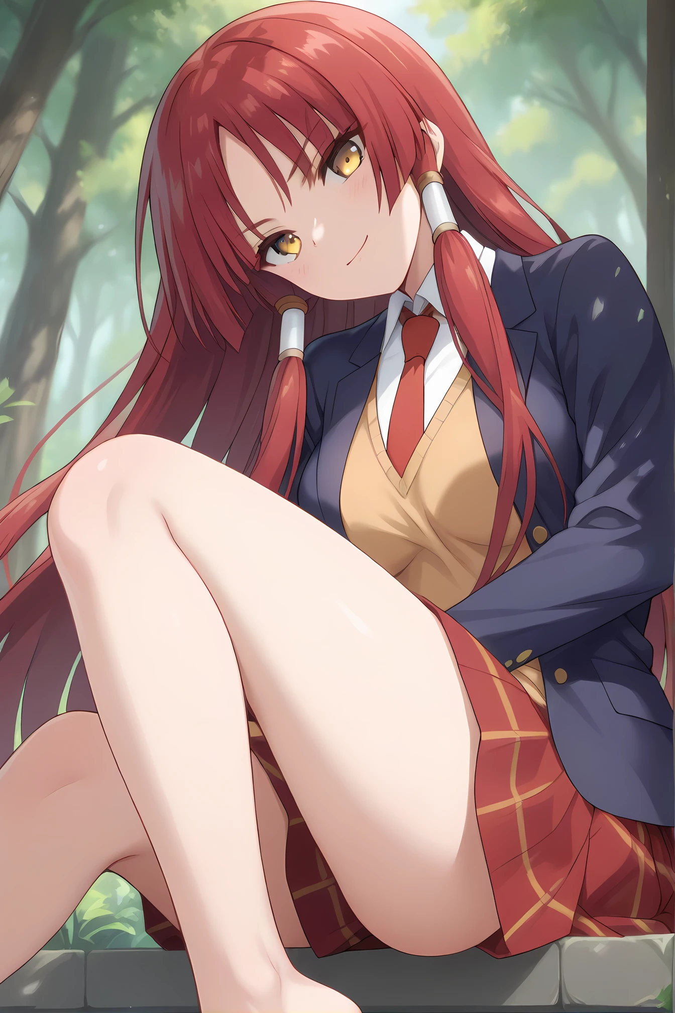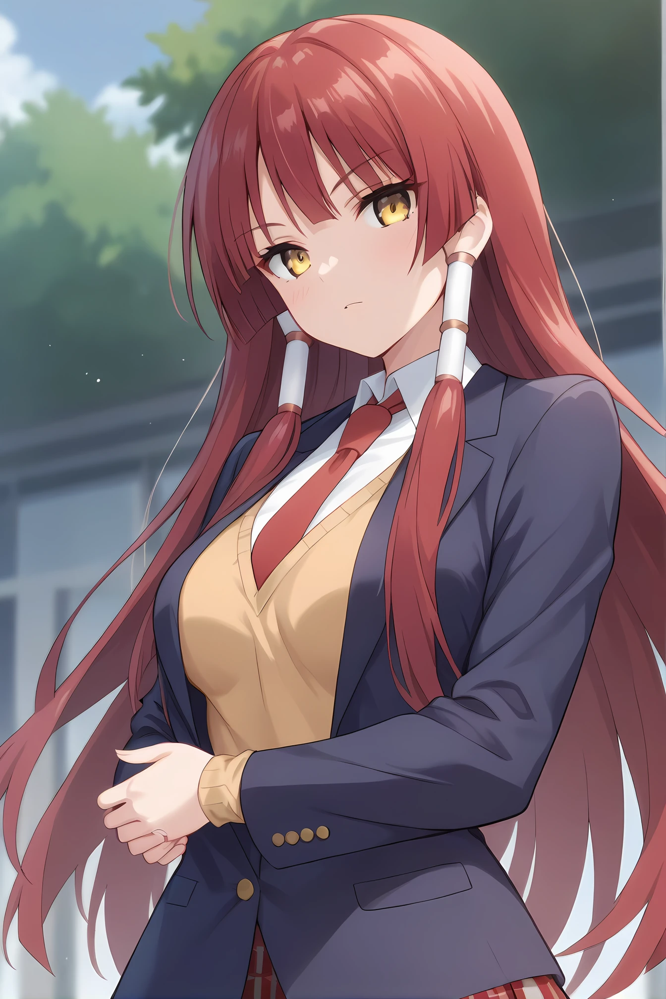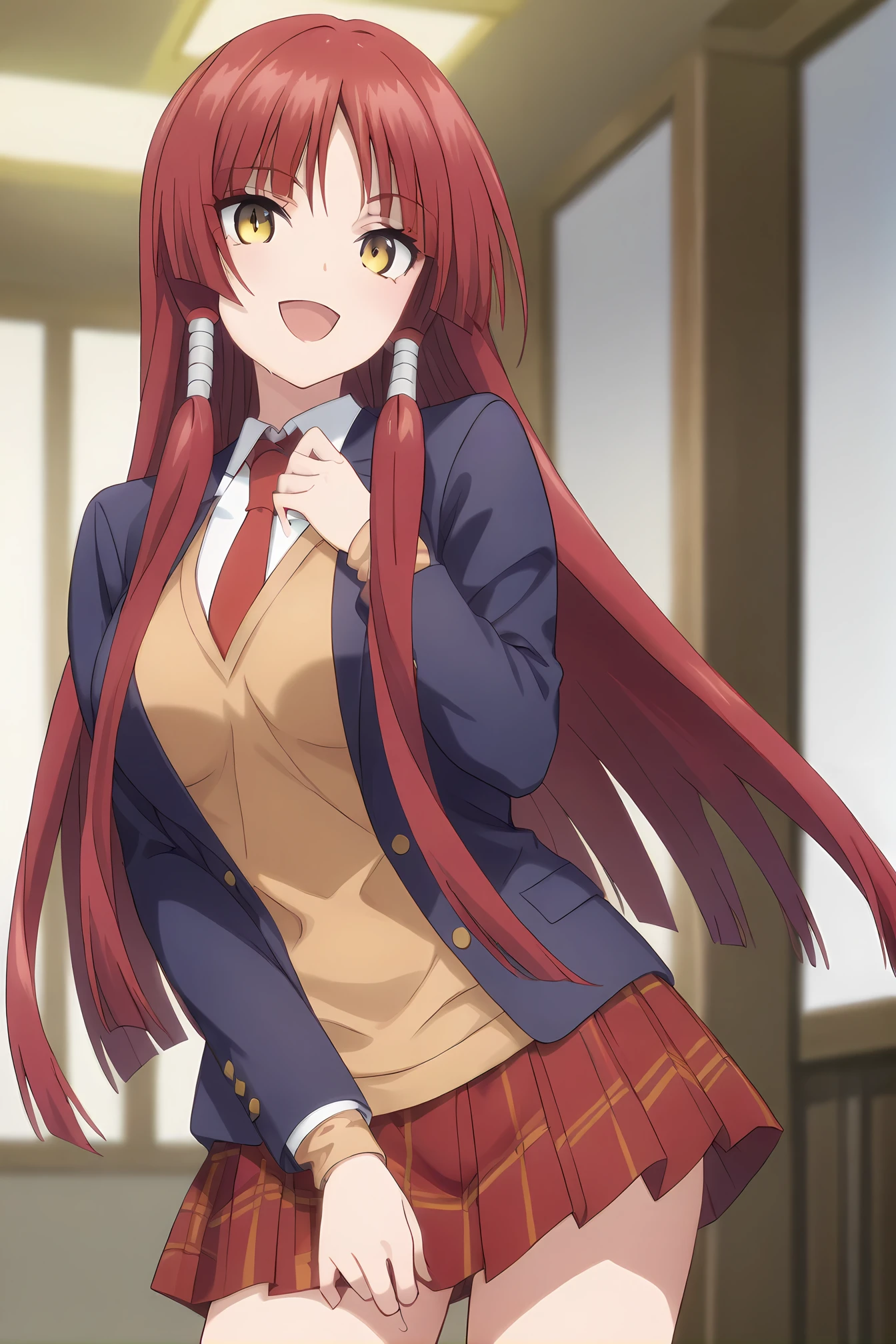 school uniform blazer white shirt yellow sweater red necktie red skirt