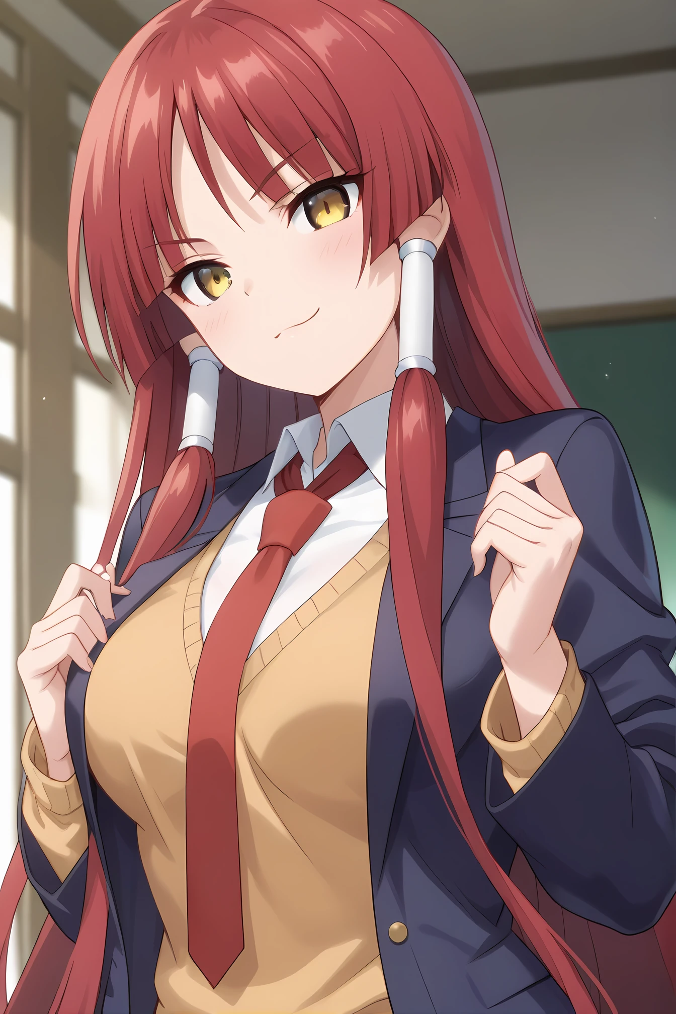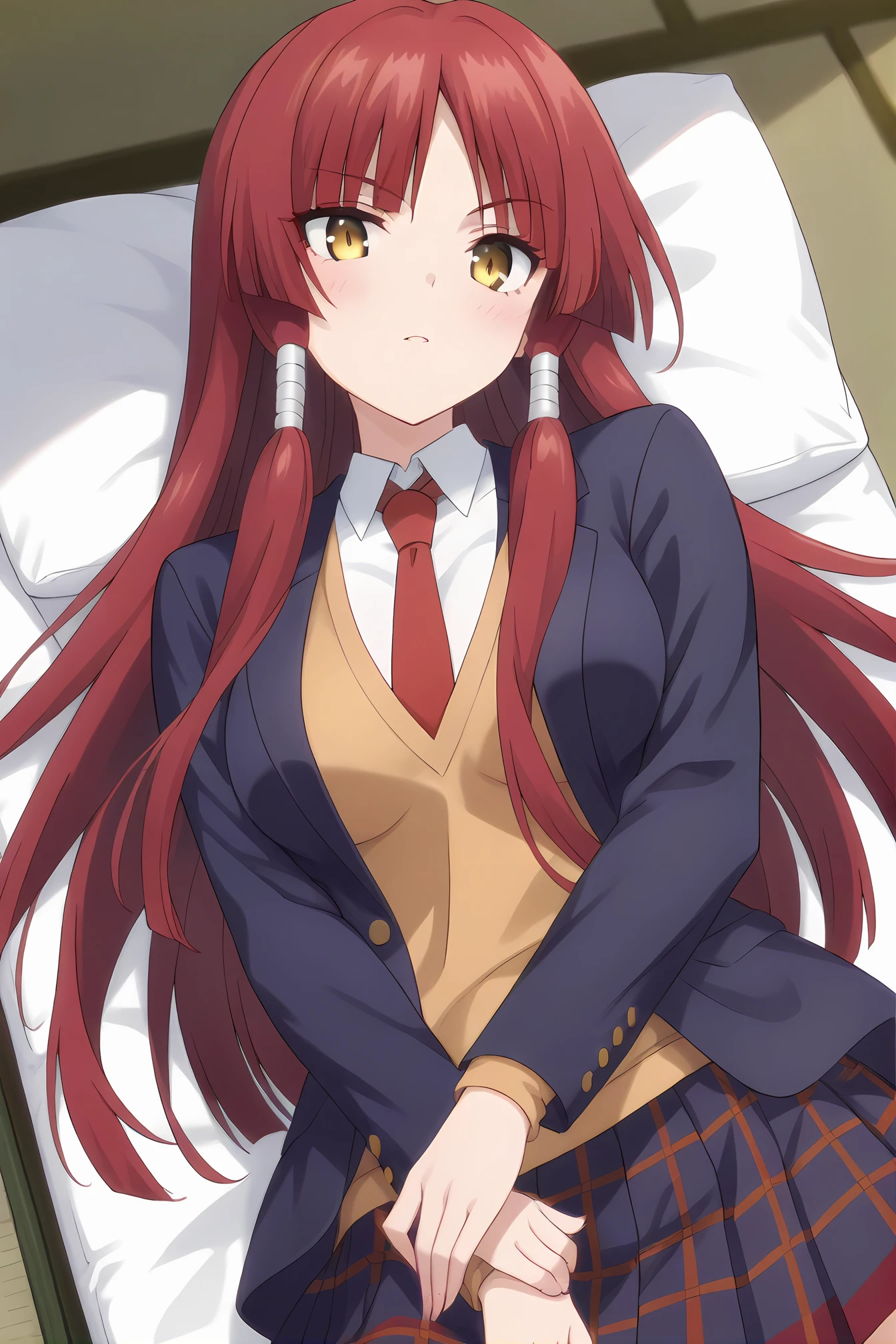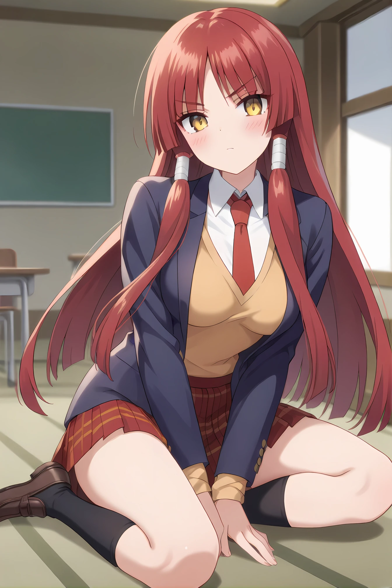 school uniform blazer white shirt yellow sweater red necktie red skirt
