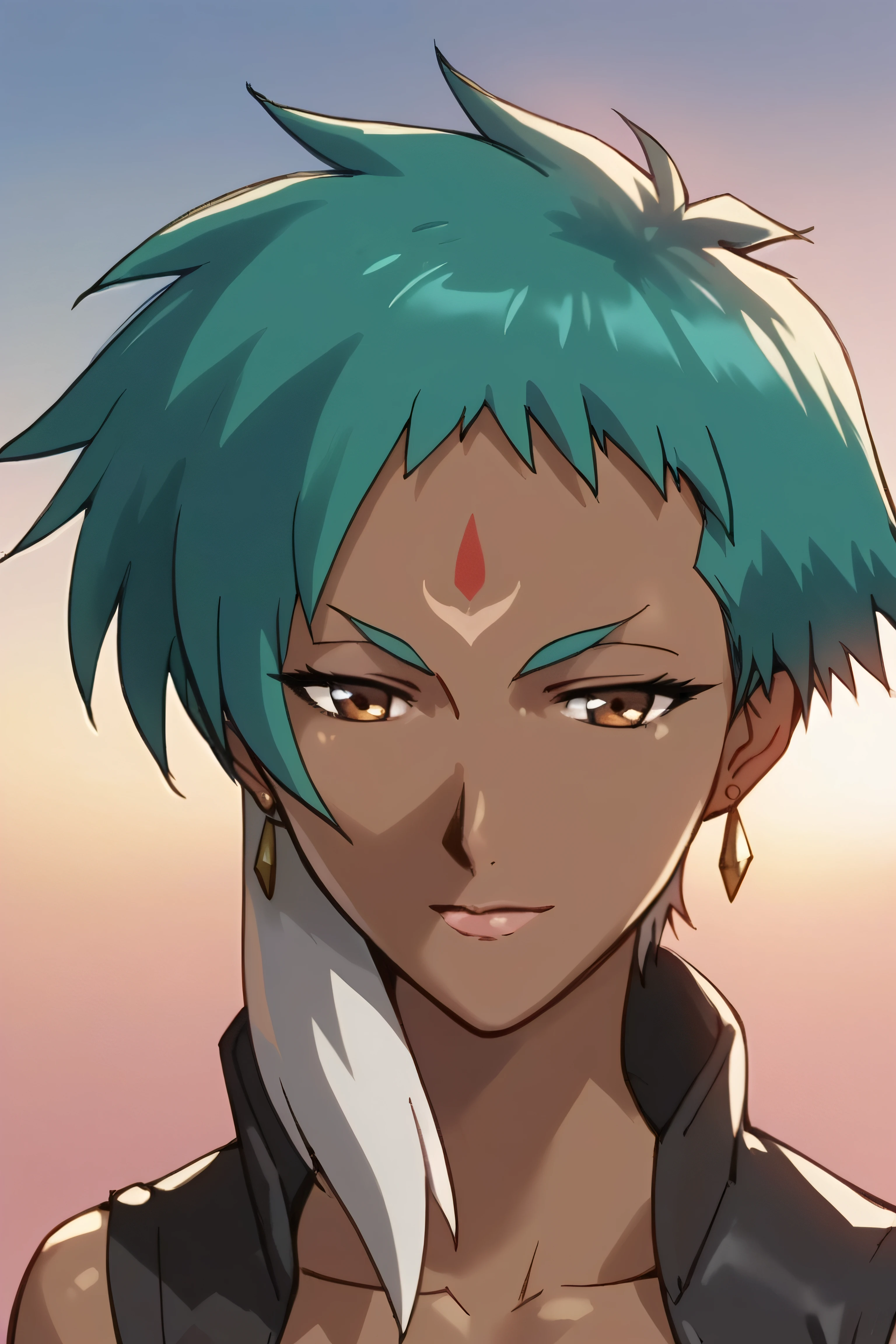 Ender5, 1girl, dark skin, dark-skinned female, facial mark, forehead mark, breasts, cleavage, midriff, short hair, aqua hair, white hair, brown eyes, earrings