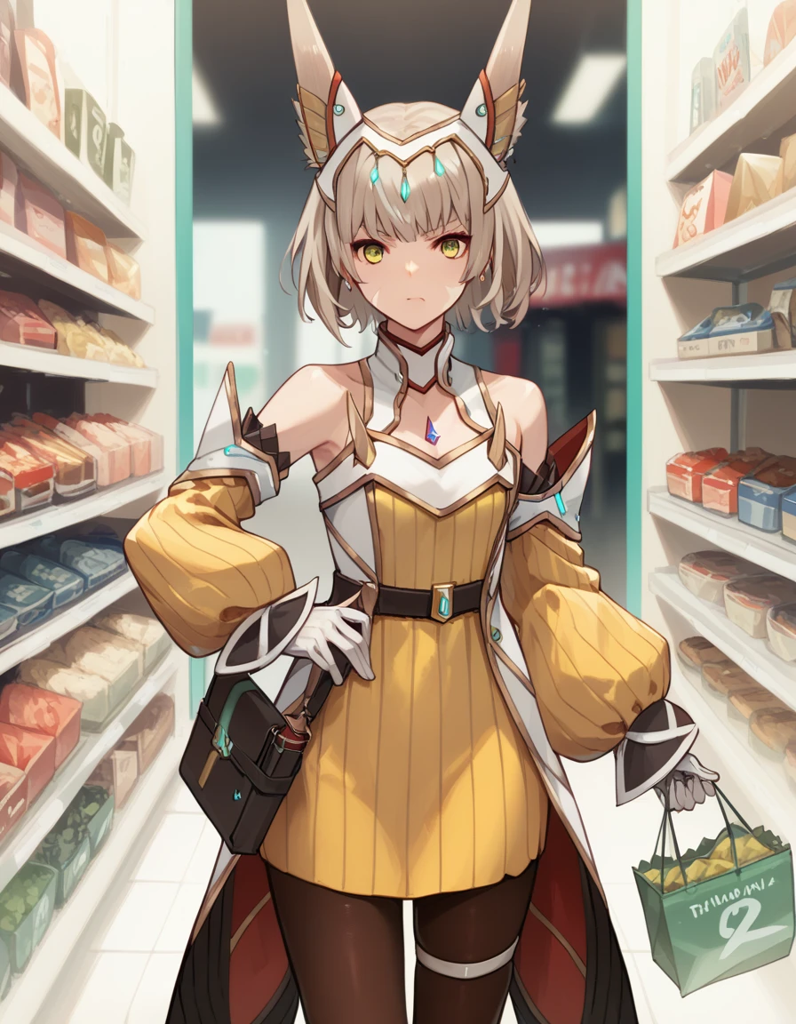 niahroxb3, white gloves, weapon, black pantyhose, detached sleeves, yellow dress