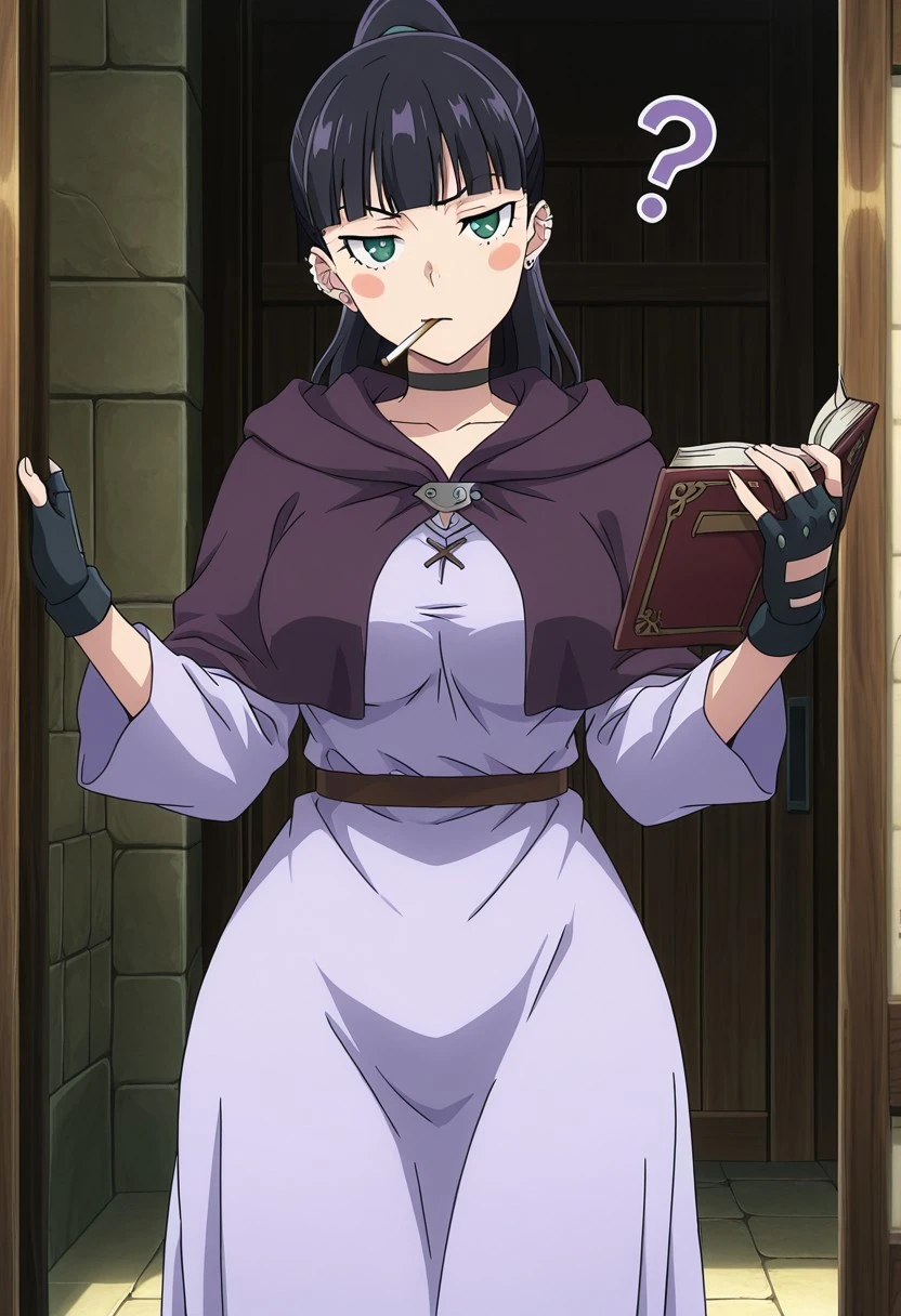LiselotteTunic, 1girl, solo, long hair, black hair, blunt bangs, ponytail, green eyes, blush stickers, large breasts, curvy, wide hips, ear piercing, black choker, black fingerless gloves, light purple tunic dress, long sleeves, dark purple capelet, high heels, black boots, Liselotte Witch Costume