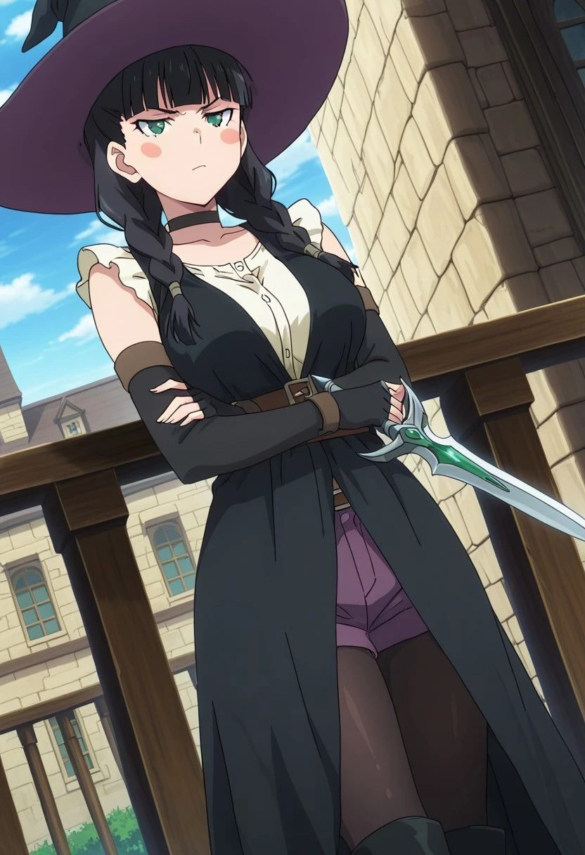 LiselotteWitch, 1girl, solo, long hair, black hair, blunt bangs, twin braids, green eyes, blush stickers, large breasts, curvy, wide hips, black choker, black fingerless gloves, witch hat, jewelry, black elbow gloves, black open-front dress, sleeveless dress, white shirt, sleeveless shirt, purple shorts, black pantyhose, high heels, black boots,