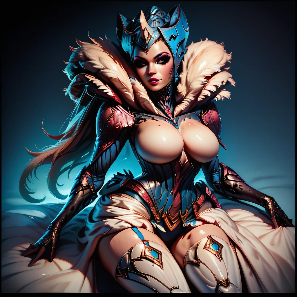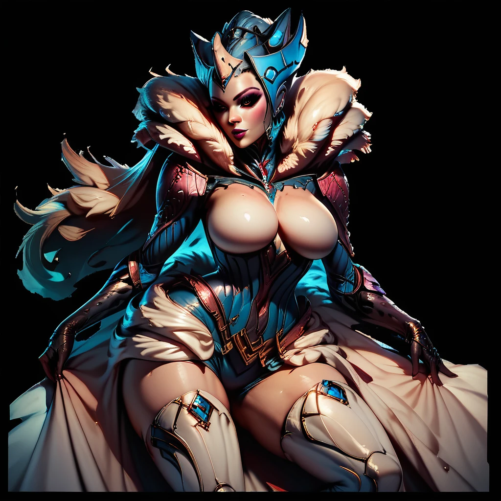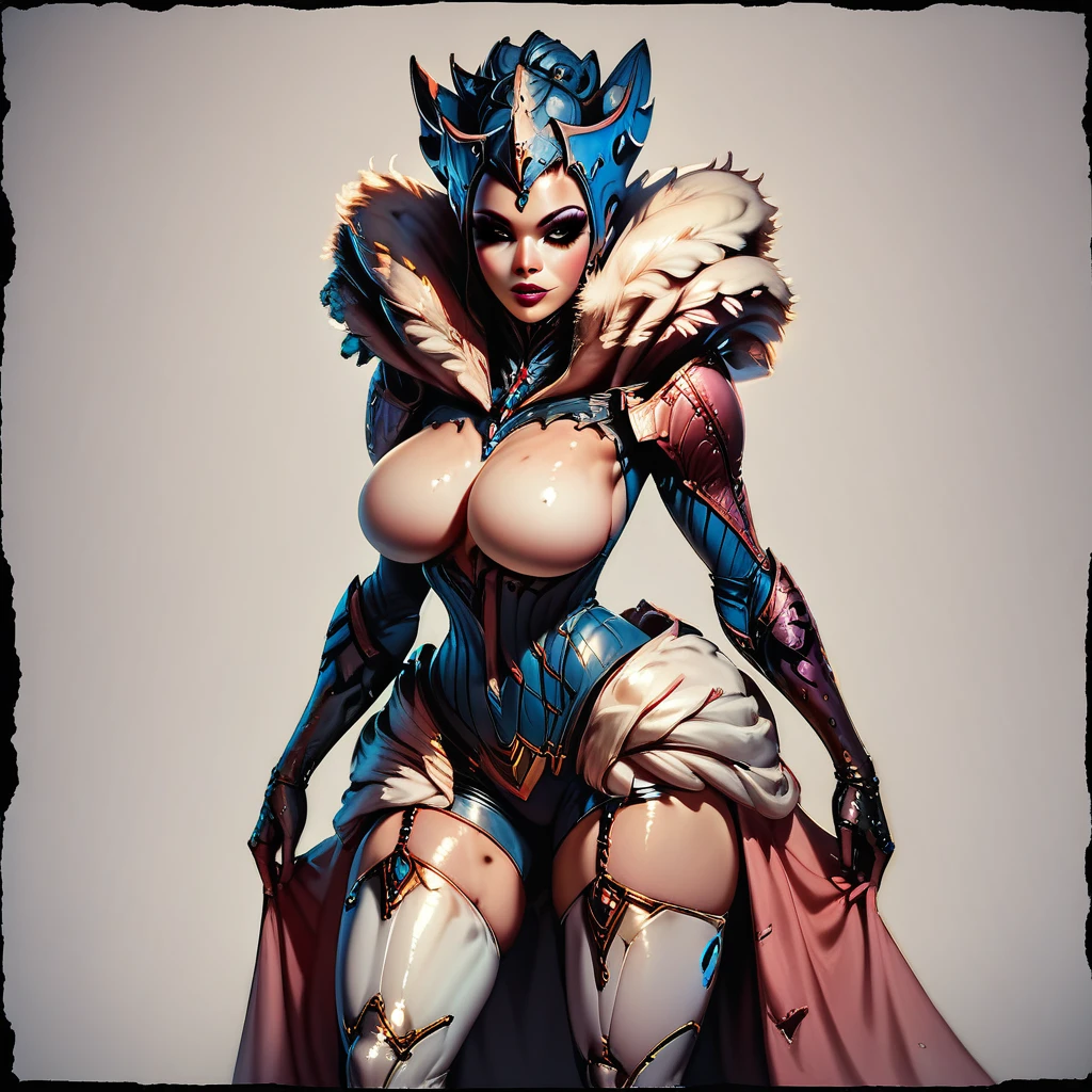 Additional promt: female_human_face, beautiful_face, asymmetrical_long_skirt, white_thighhigh_boots, heels, makeup.