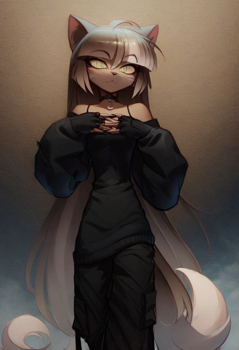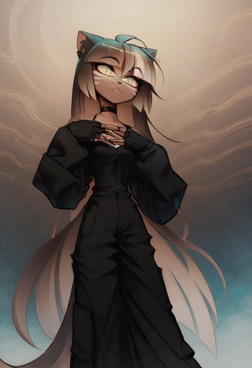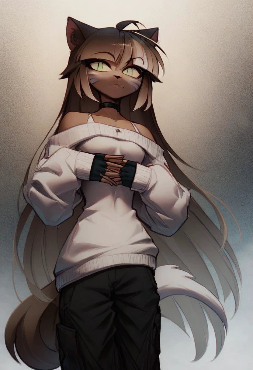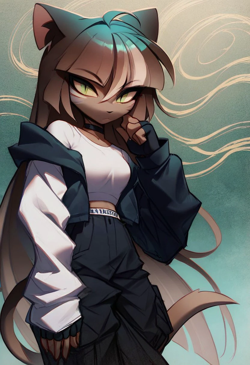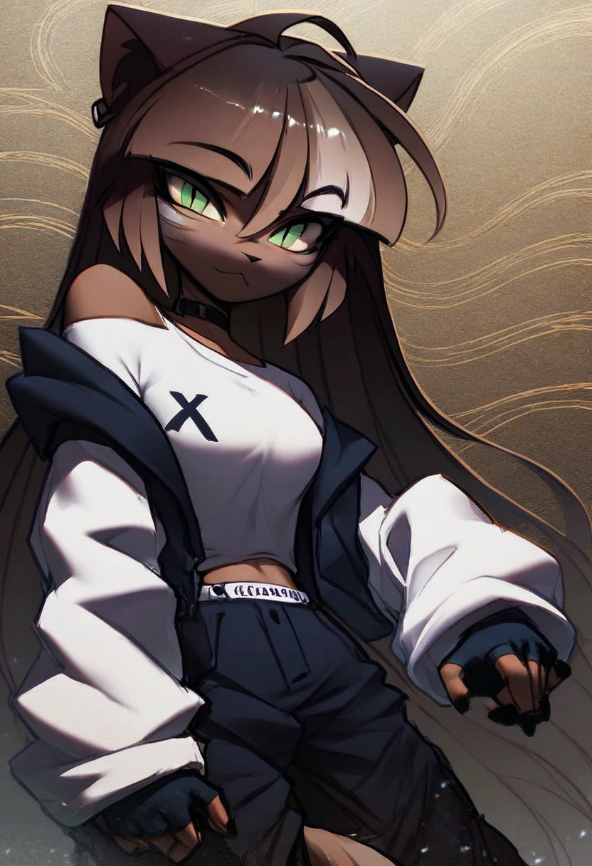 furry, cat ears, slit pupils, green eyes, multicolored hair, brown hair, white hair, dark skin, white markings, tail, gloves, black gloves, fingerless gloves