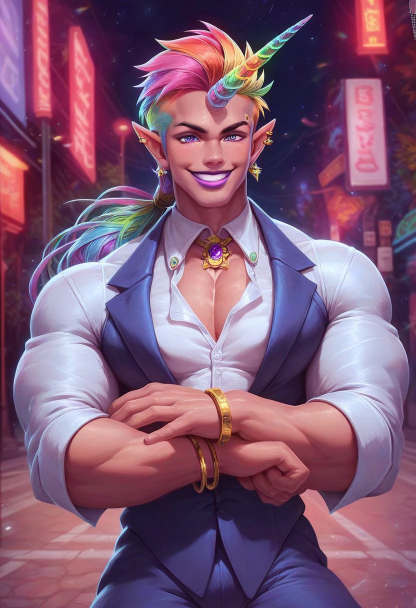 ChironSmite, pixie ears, lipstick, purple lips, feminine jaw, 1boy, solo, pectorals, abs, jewelry, earrings, muscular, nipples, muscular male, piercing, multicolored hair, long hair, bare pectorals, bracelet, (clothing), ponytail