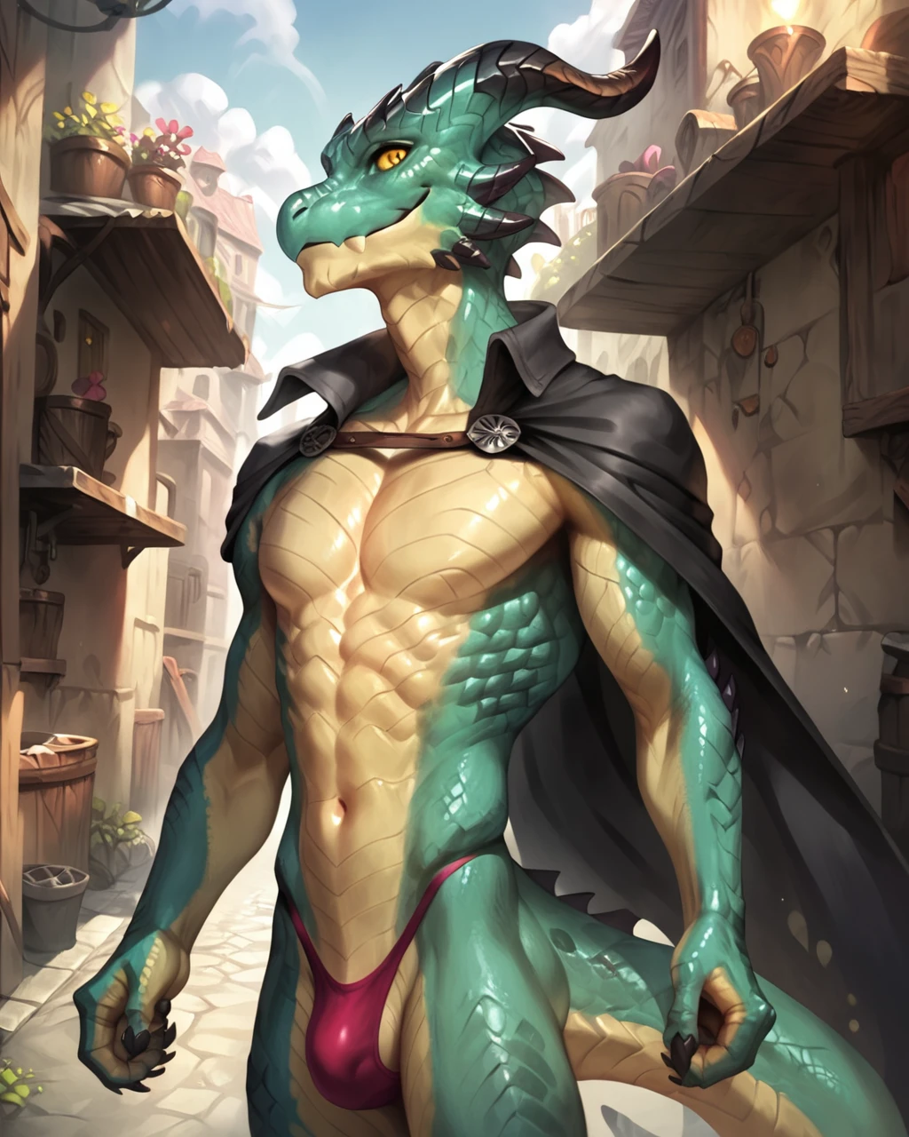 I made this lora to be able to easily reproduce the proper looks of the character (horn shape, color, spikes, etc.). Feel free to use it if you want nice pics with a naughty teal kobold in any kind of situation, as I have no issues with seeing OCs have their own adventures.