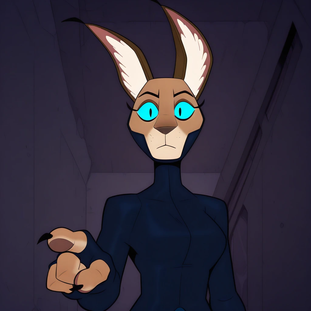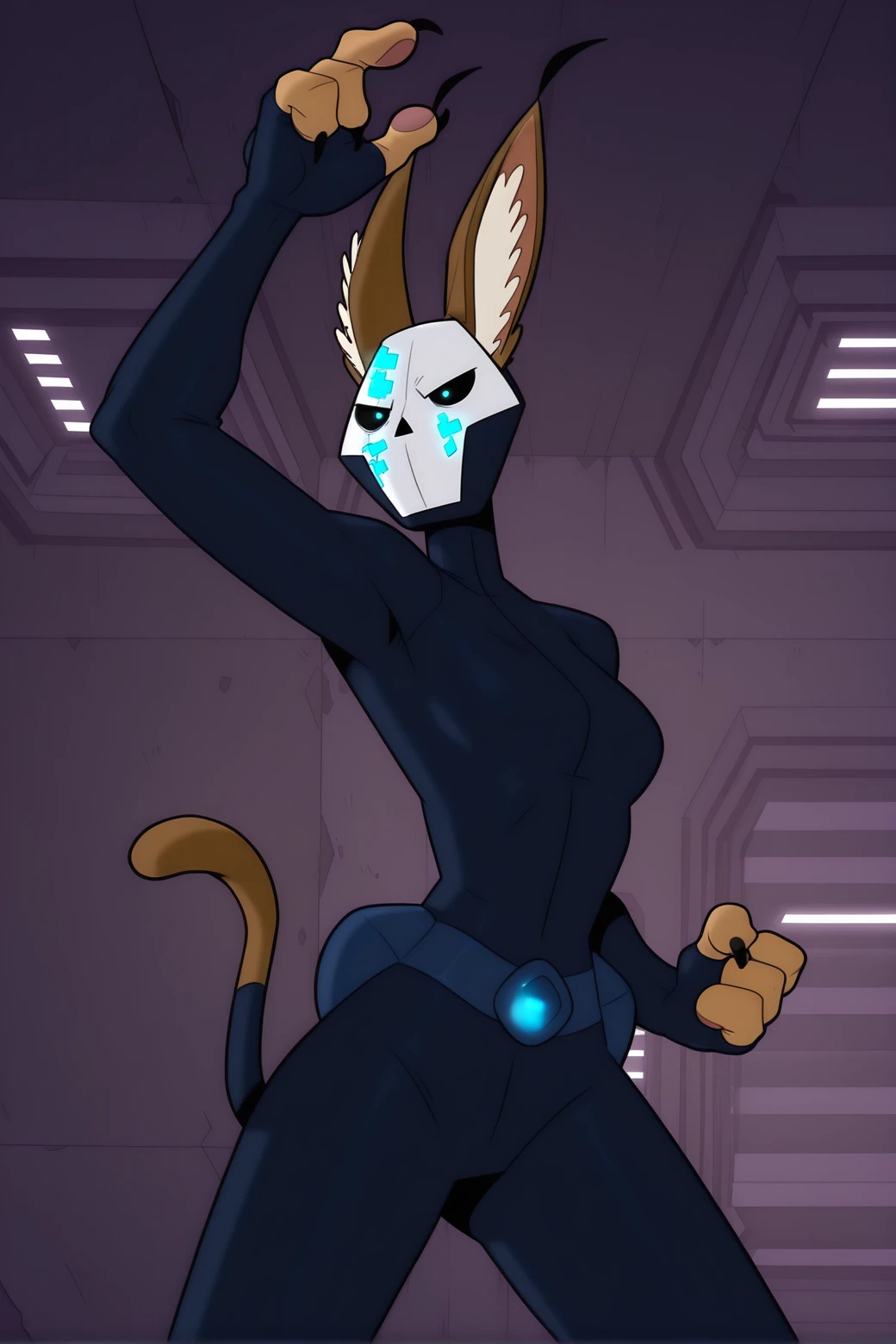K4R4, flat colors, solo, female, anthro, caracal (genus), brown ears, blue eyes, white inner ear fluff, slim, small breasts, black claws, 4 fingers, tail, black skinsuit, fully clothed, long sleeves, tight clothing, blue buckle, black belt pouch, fingerless gloves,