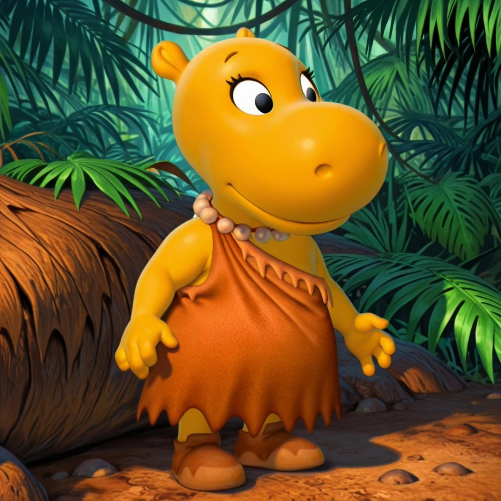 TashaByv2il, anthro, female, yellow skin, black eyes, orange dress, red mary-janes