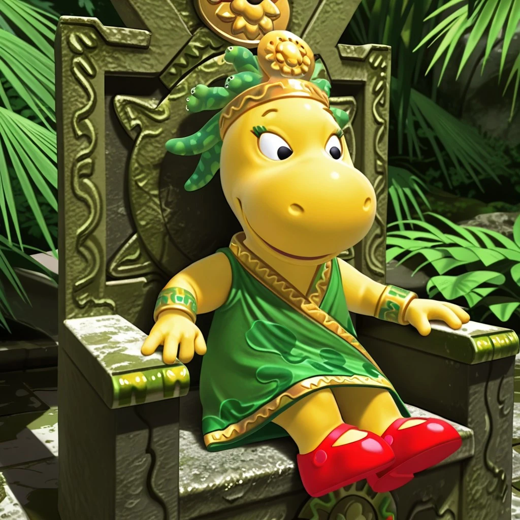green snakehair, gold crown, green dress gold trim, gold bracelets, red mary-janes