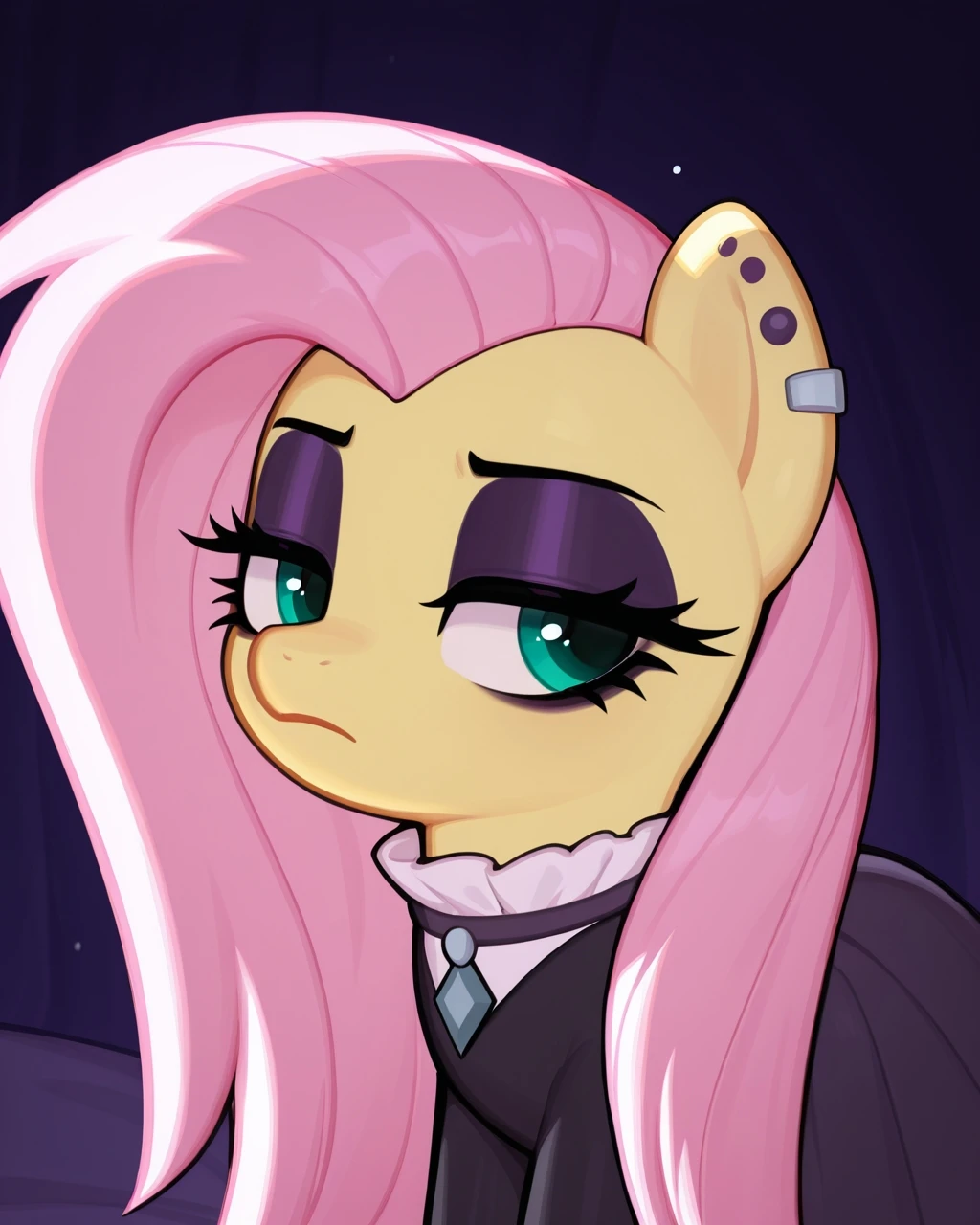 tags: fluttergoth, 1girl, pink hair, piercing, makeup, eyeshadow, solo, long hair, jewelry, yellow skin, ear piercing, earrings, furry female, furry, half-closed eyes, black dress, green eyes, eyelashes, colored skin, blue eyes, dress, purple eyeshadow, aqua eyes