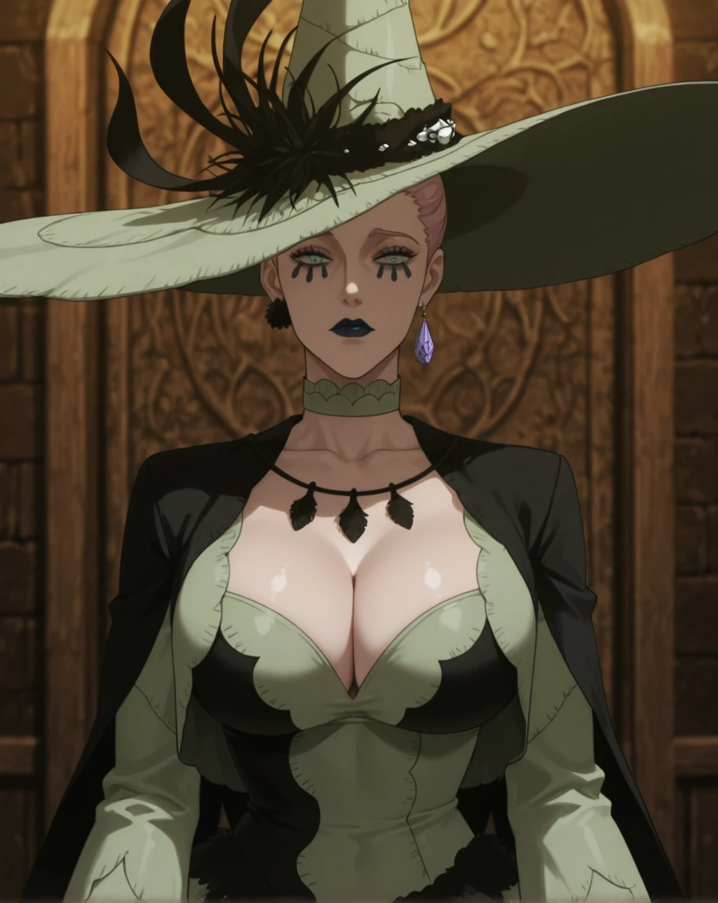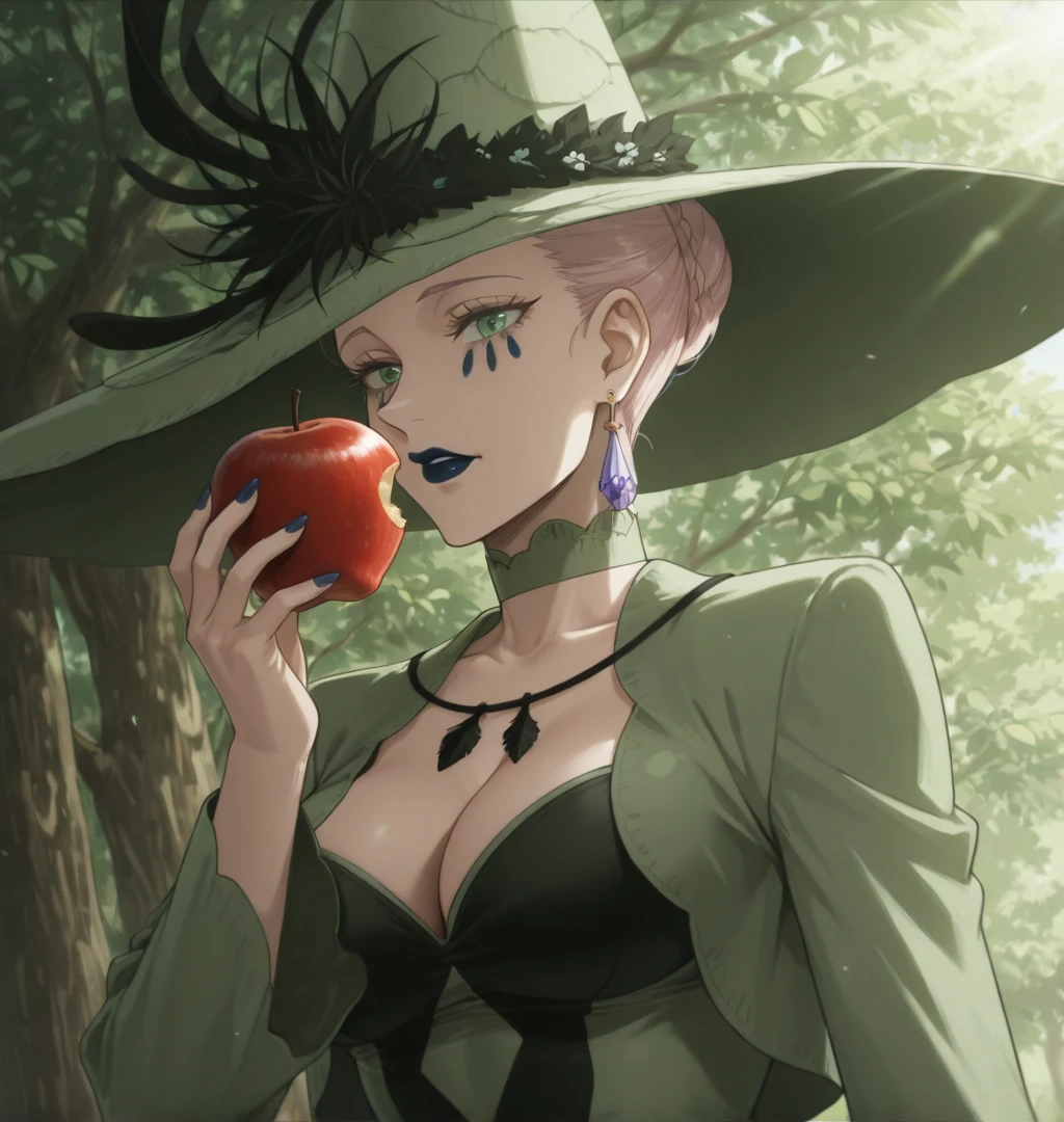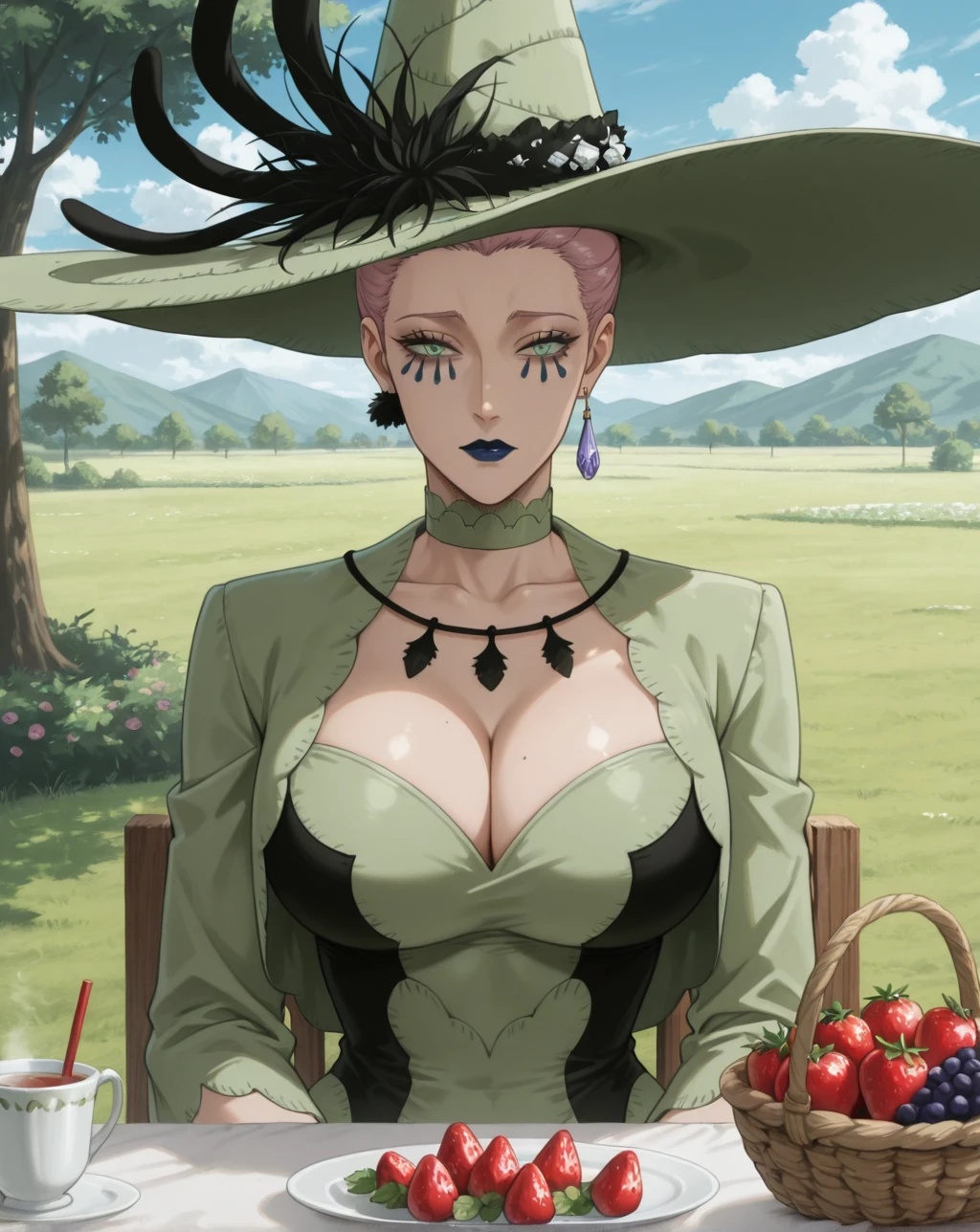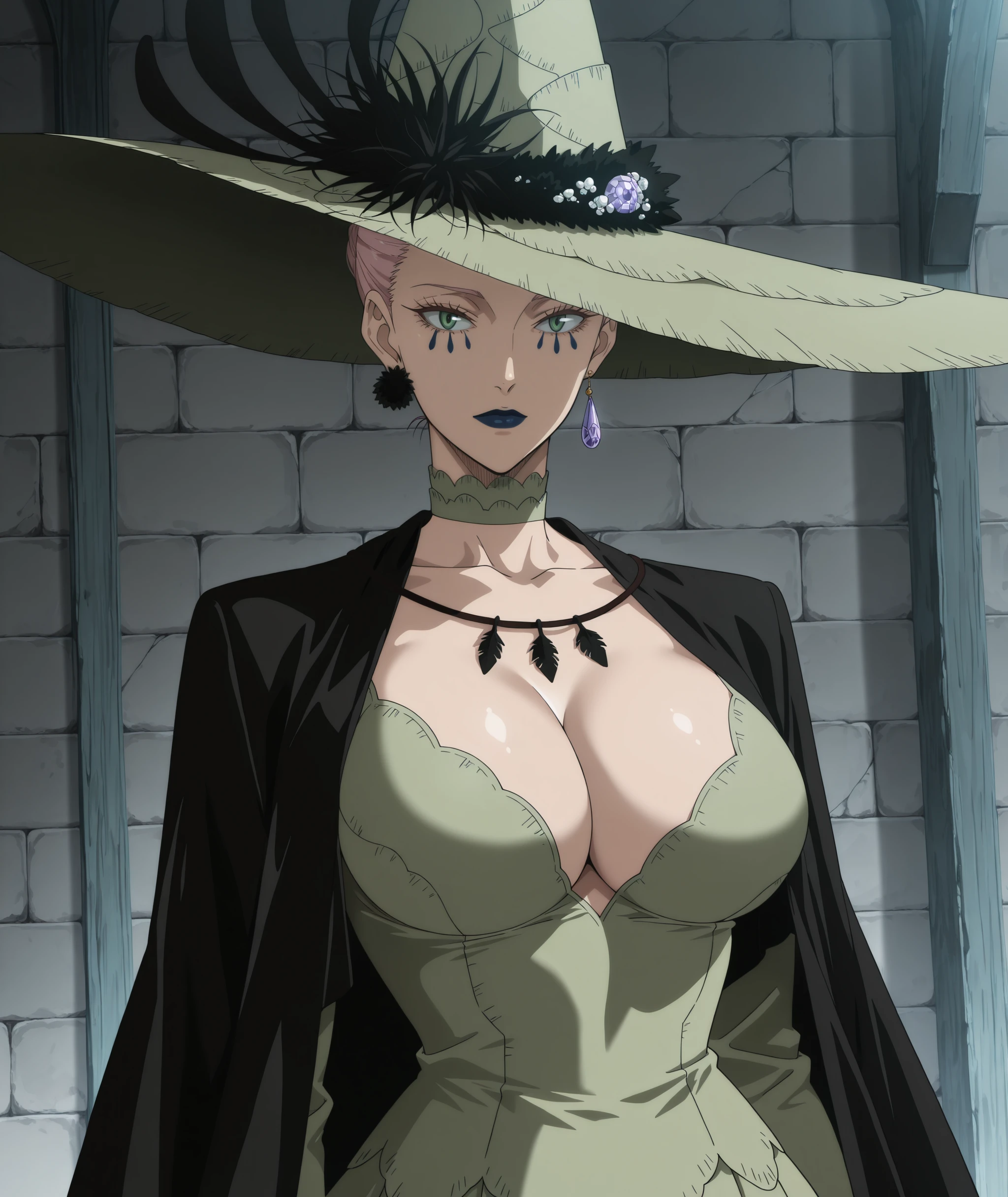 These are the tags used in the Training: Queen of the Witches of Black Clover, light green eyes, tattoo under the eyes, dark blue lipstick, light white skin, mature woman, ?????????????, tall woman, voluptuous, athletic body, light pink hair, jewelry, purple crystal earring, light green witch hat, light green Renaissance dress, Masbird Medieval dress for women, plus size, lace corset, green lace choker, long dark blue nails, full lips, anime screenshot, official art style.