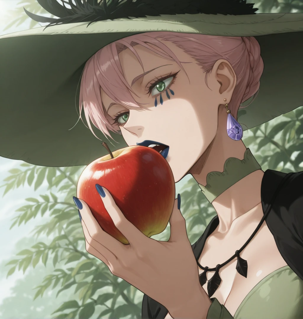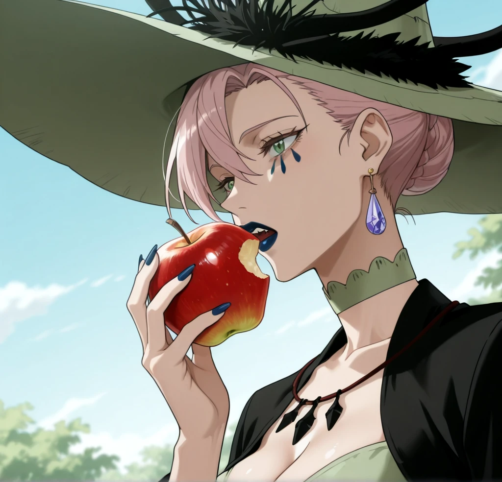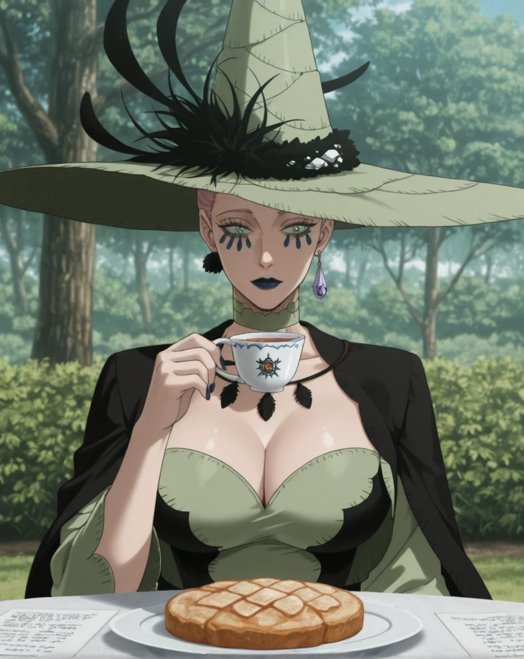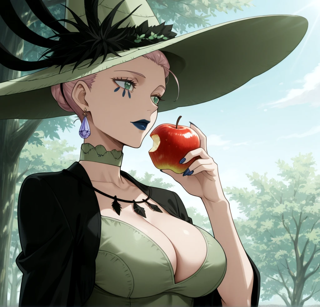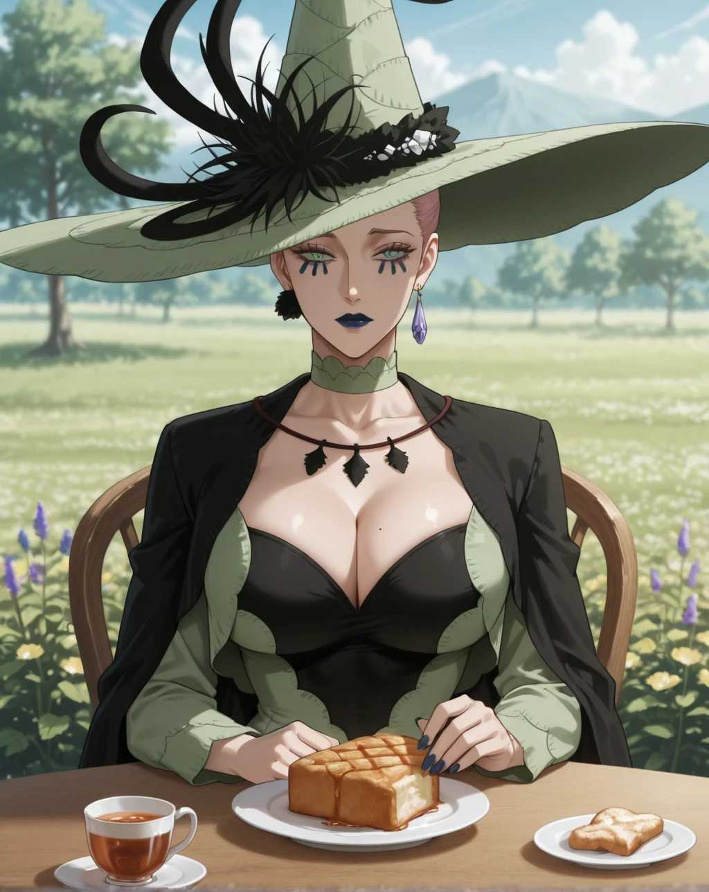 These are the tags used in the Training: Queen of the Witches of Black Clover, light green eyes, tattoo under the eyes, dark blue lipstick, light white skin, mature woman, ?????????????, tall woman, voluptuous, athletic body, light pink hair, jewelry, purple crystal earring, light green witch hat, light green Renaissance dress, Masbird Medieval dress for women, plus size, lace corset, green lace choker, long dark blue nails, full lips, anime screenshot, official art style.