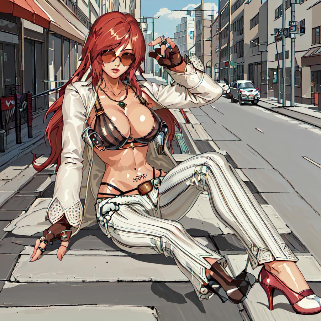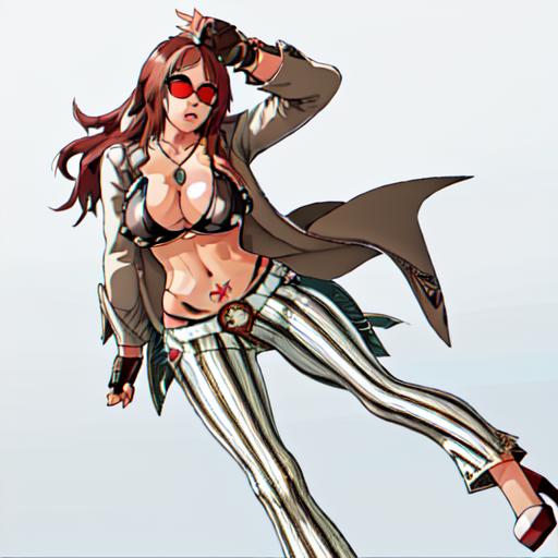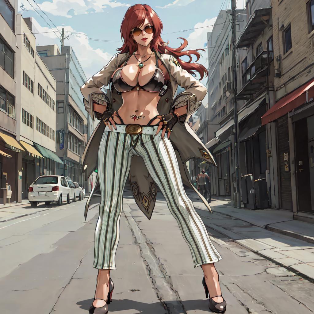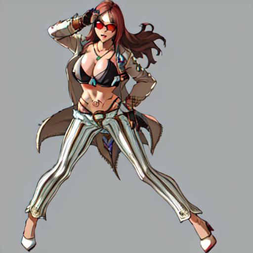 Prompt 1 : Katarina_Alves, 1girl, solo, long hair, large breasts, navel, cleavage, jewelry, underwear, panties, jacket, shoes, midriff, belt, pants, fingerless gloves, necklace, high heels, tattoo, sunglasses, ring, navel piercing, striped pants