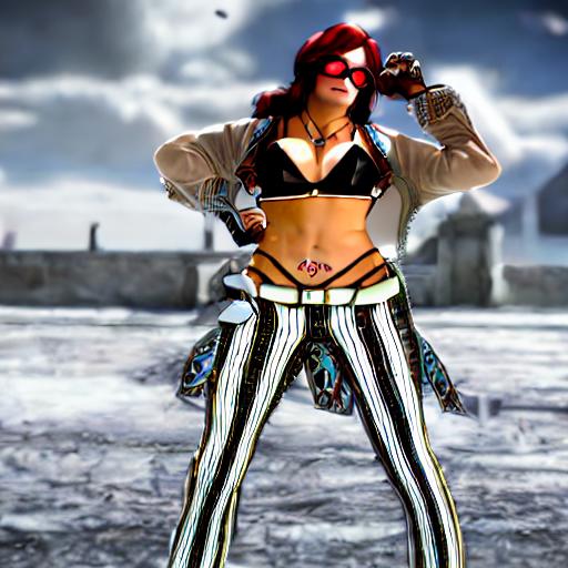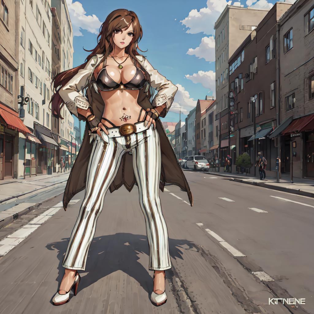 Prompt 2 : Katarina_Alves, 1girl, solo, long hair, large breasts, navel, cleavage, jewelry, underwear, panties, jacket, shoes, midriff, belt, pants, fingerless gloves, necklace, high heels, tattoo, ring, navel piercing, striped pants, brown eyes