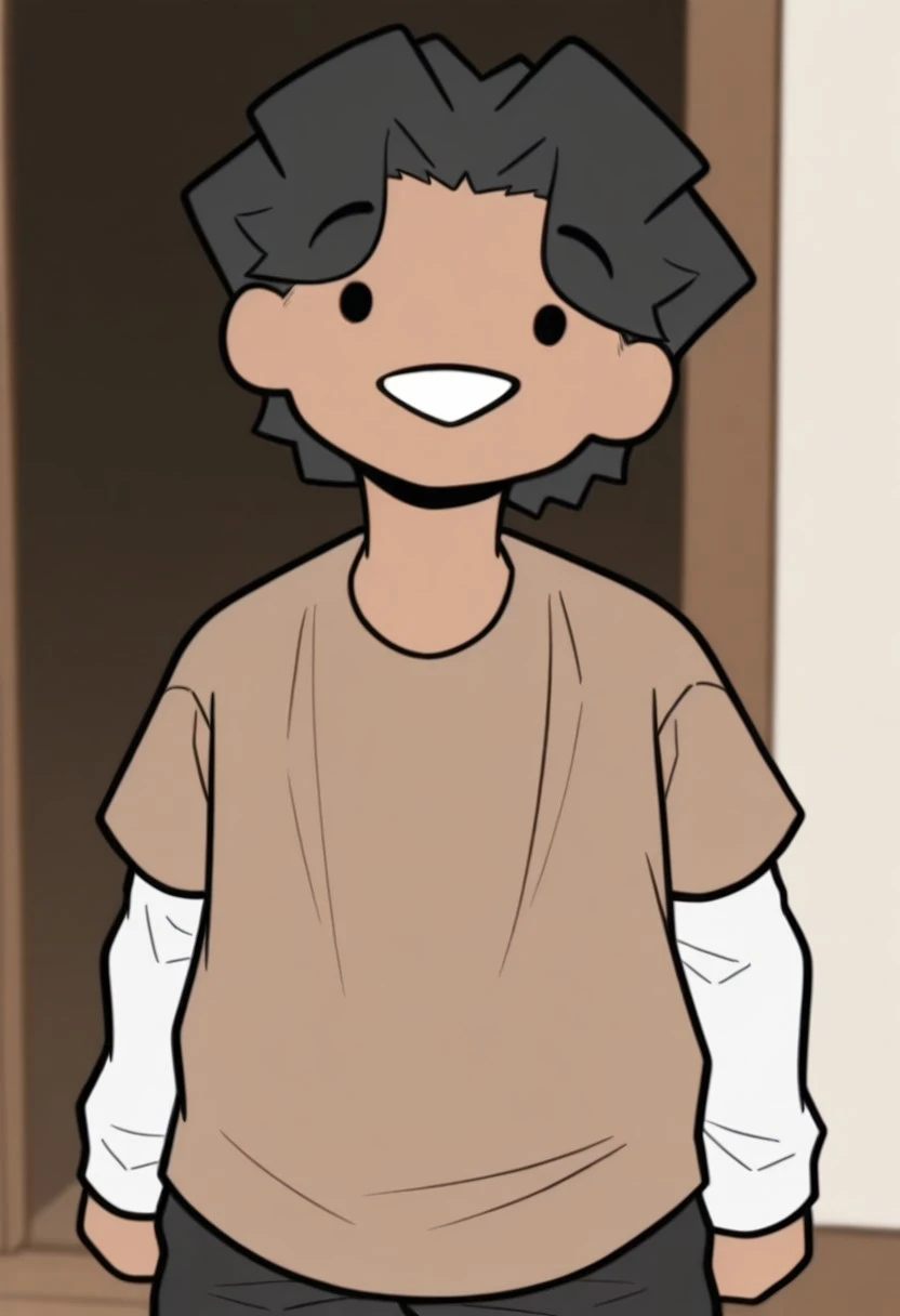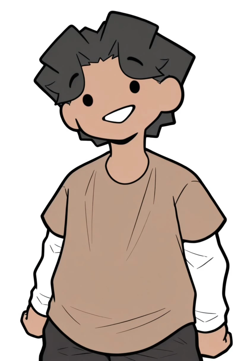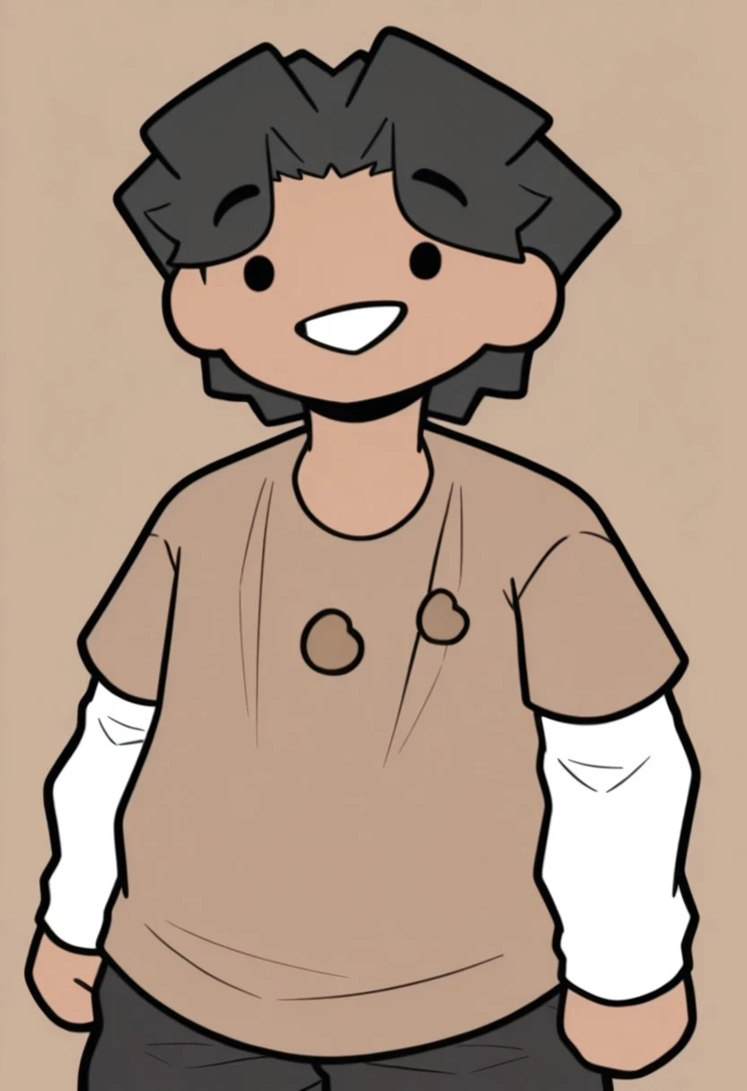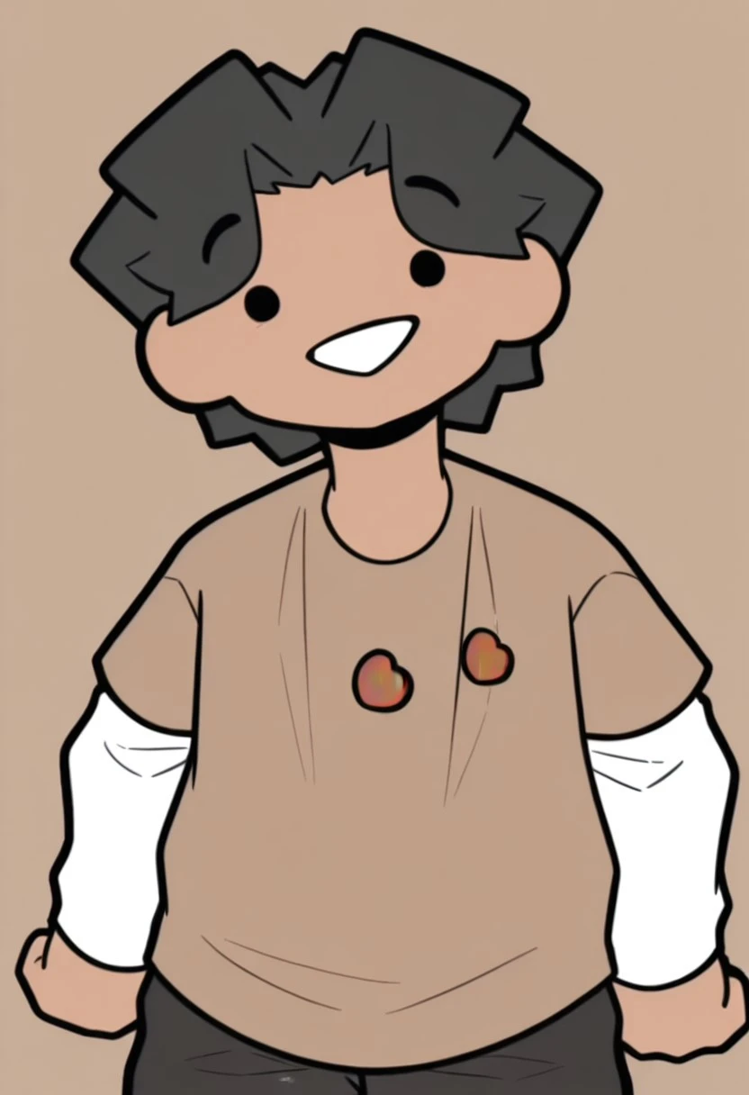 BeanYT Illus, solo, 1boy, dark skin, black hair, dot eyes, black eyes, brown shirt, white shirt underneath, white sleeves, black pants