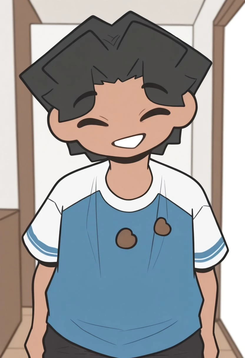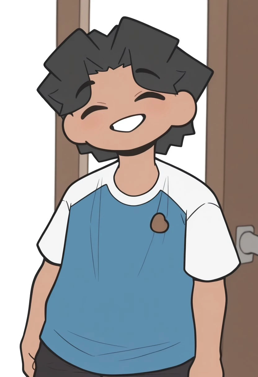 BeanYT Illus, solo, 1boy, dark skin, black hair, dot eyes, black eyes, blue and white shirt, bean logo, black pants