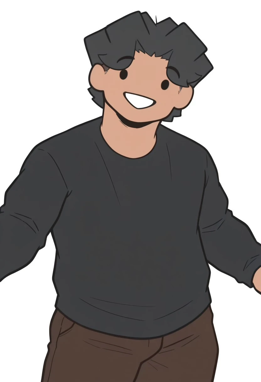 BeanYT Illus, solo, 1boy, dark skin, black hair, dot eyes, black eyes, black shirt, brown pants