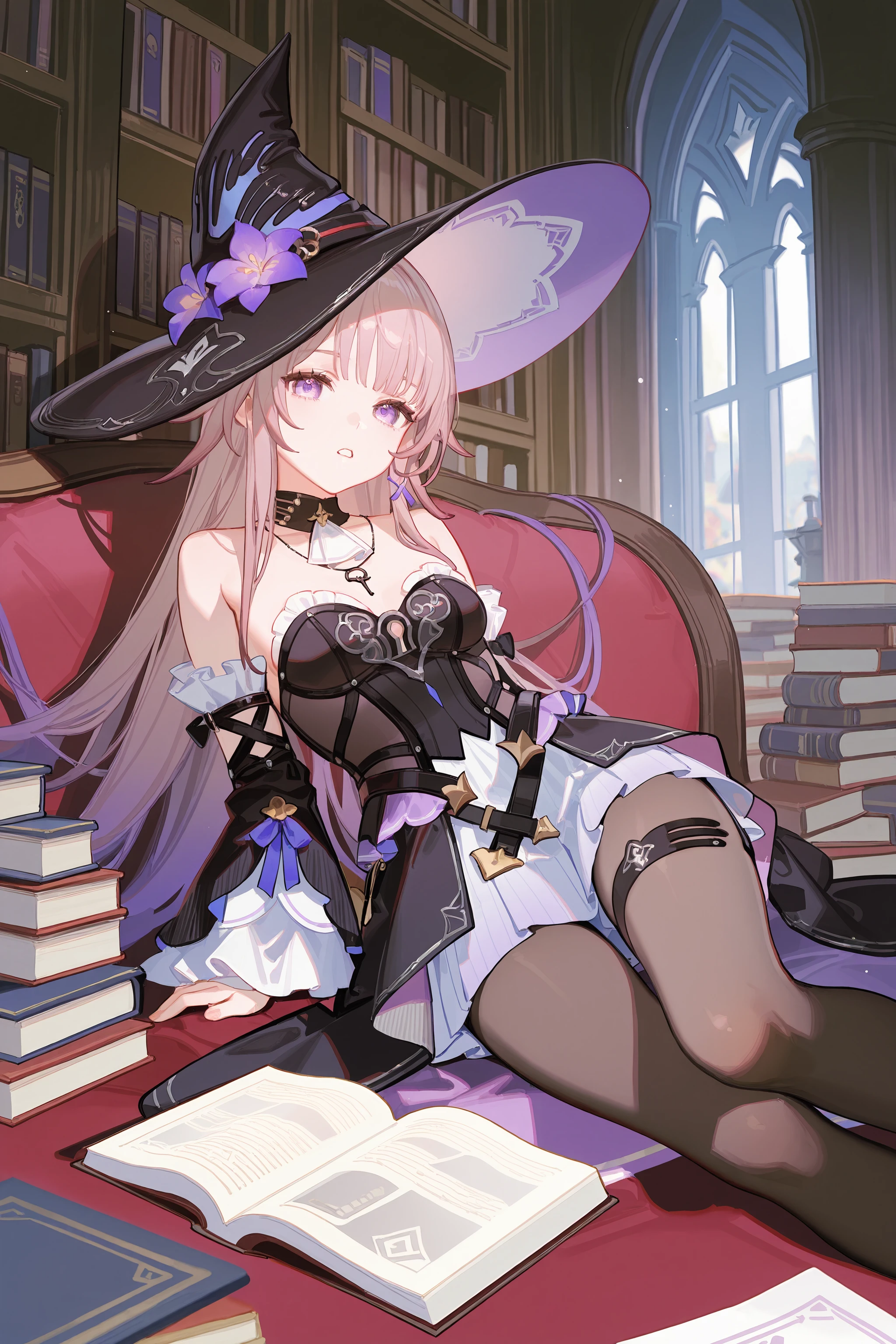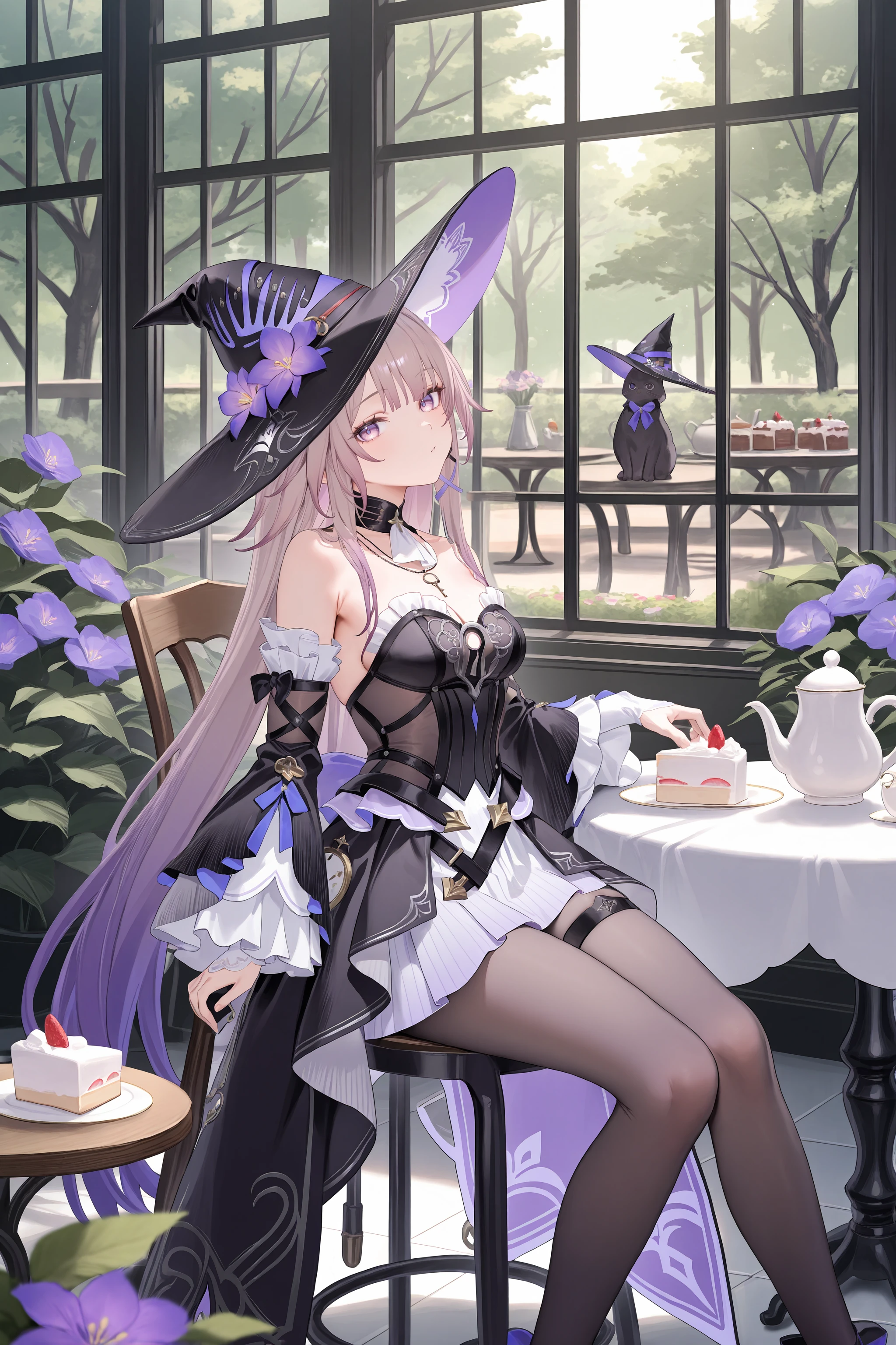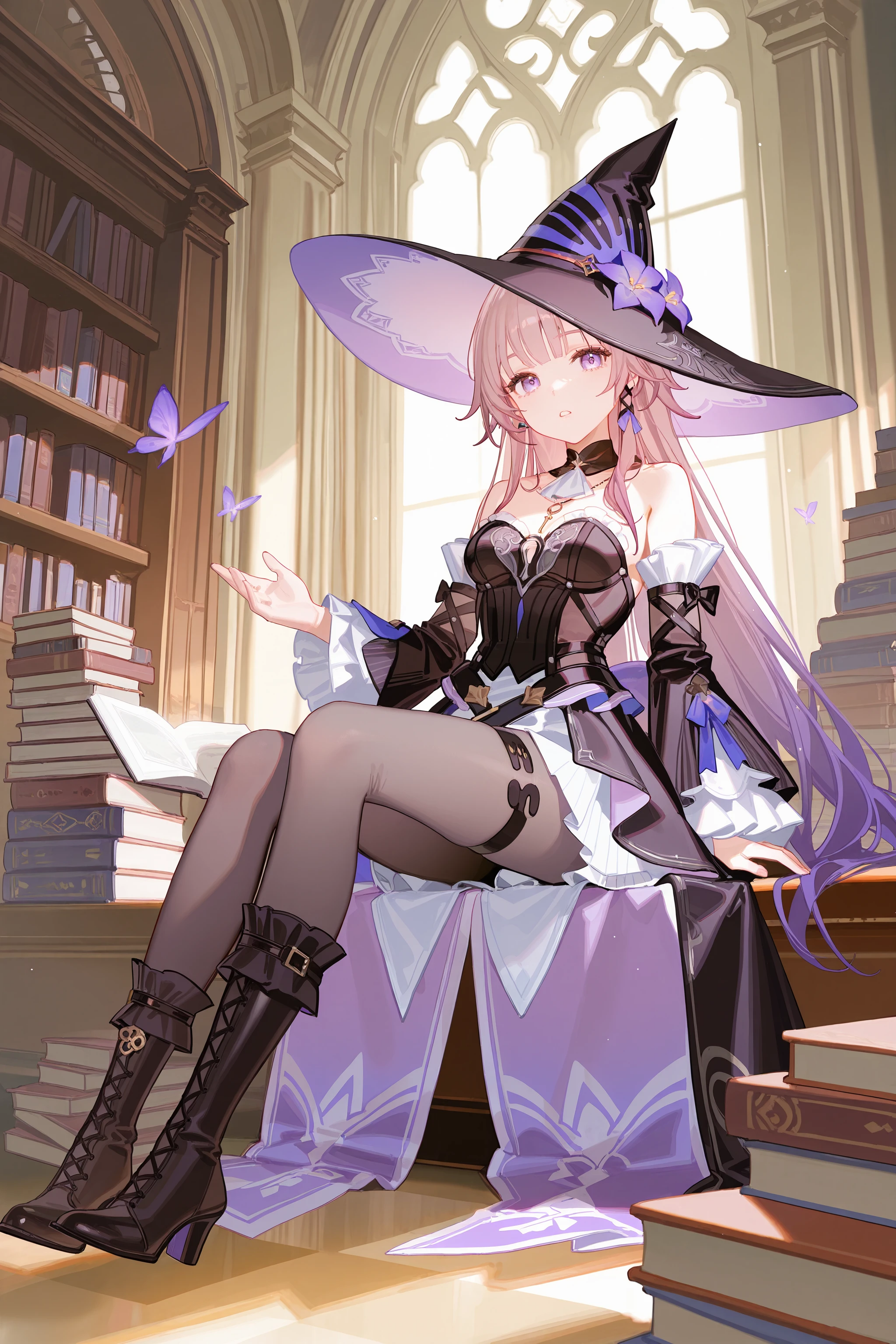 For The Herta: herta \(honkai: star rail\), gradient hair, witch hat, black strapless dress, grey pantyhose, thigh strap, detached sleeves, uneven knee boots, detached collar, key necklace