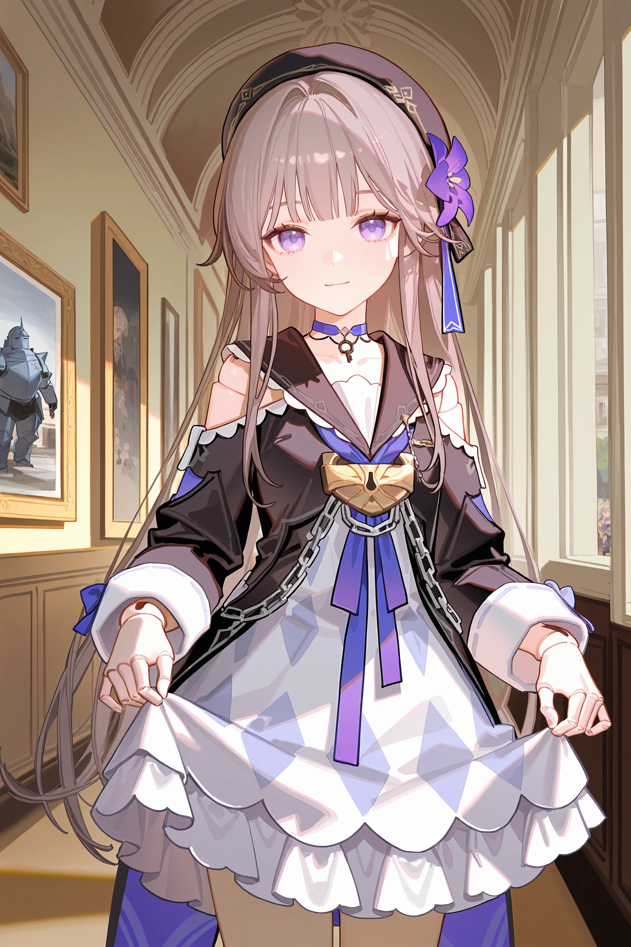 Additional prompts for default costume (Version 3 and above): beret, white dress, black jacket, fold-over boots, sailor collar, key necklace, chain, shoulder cutout