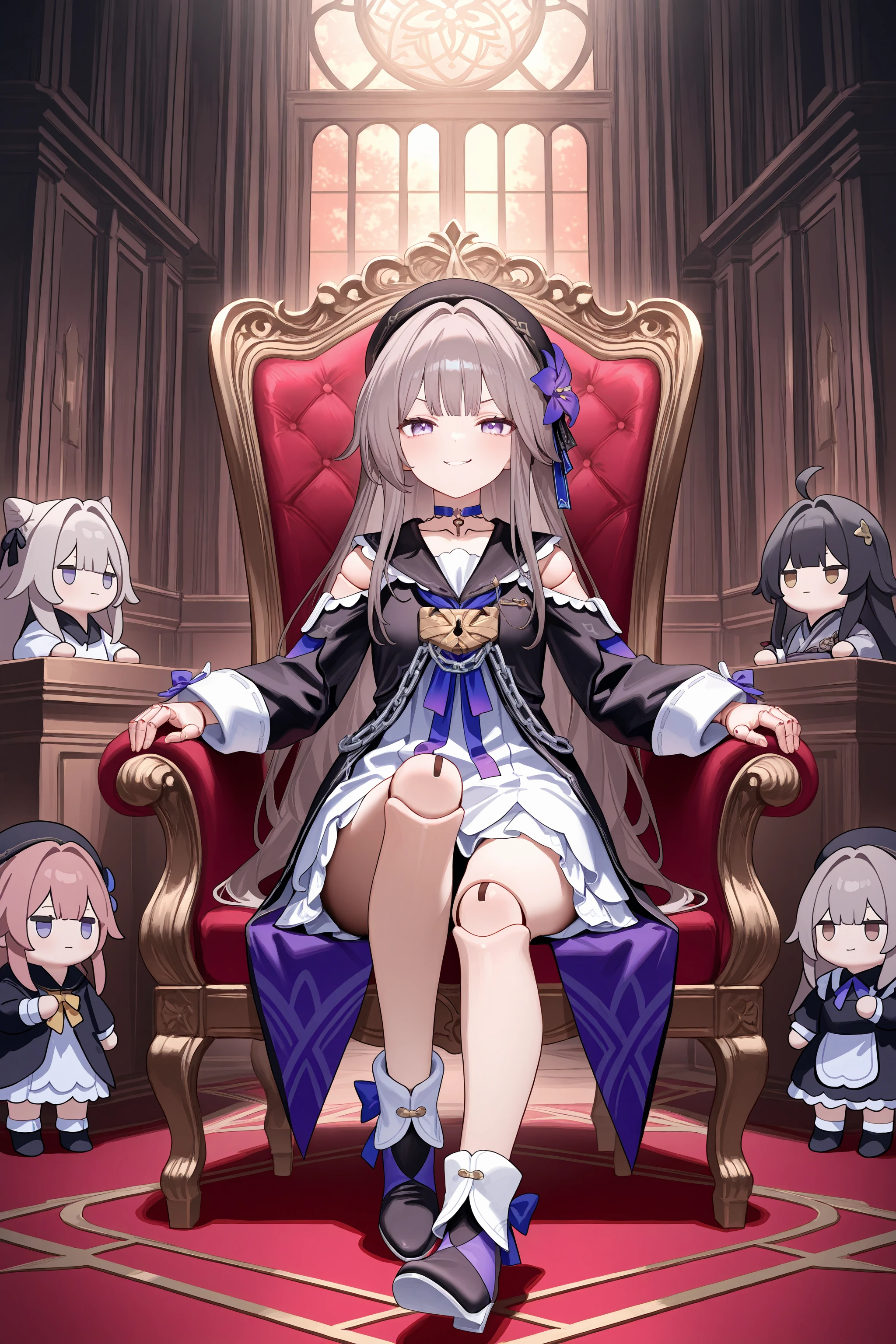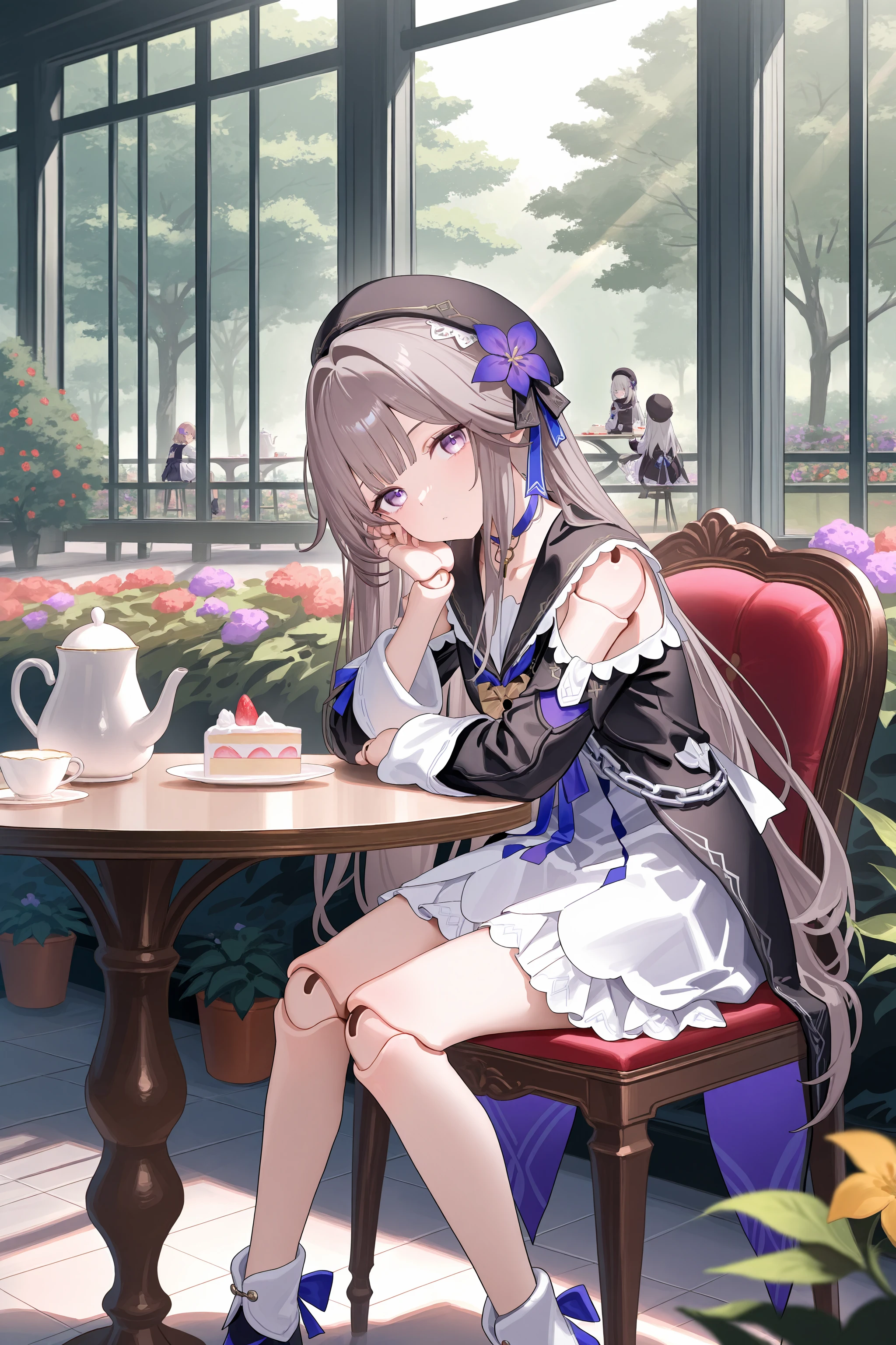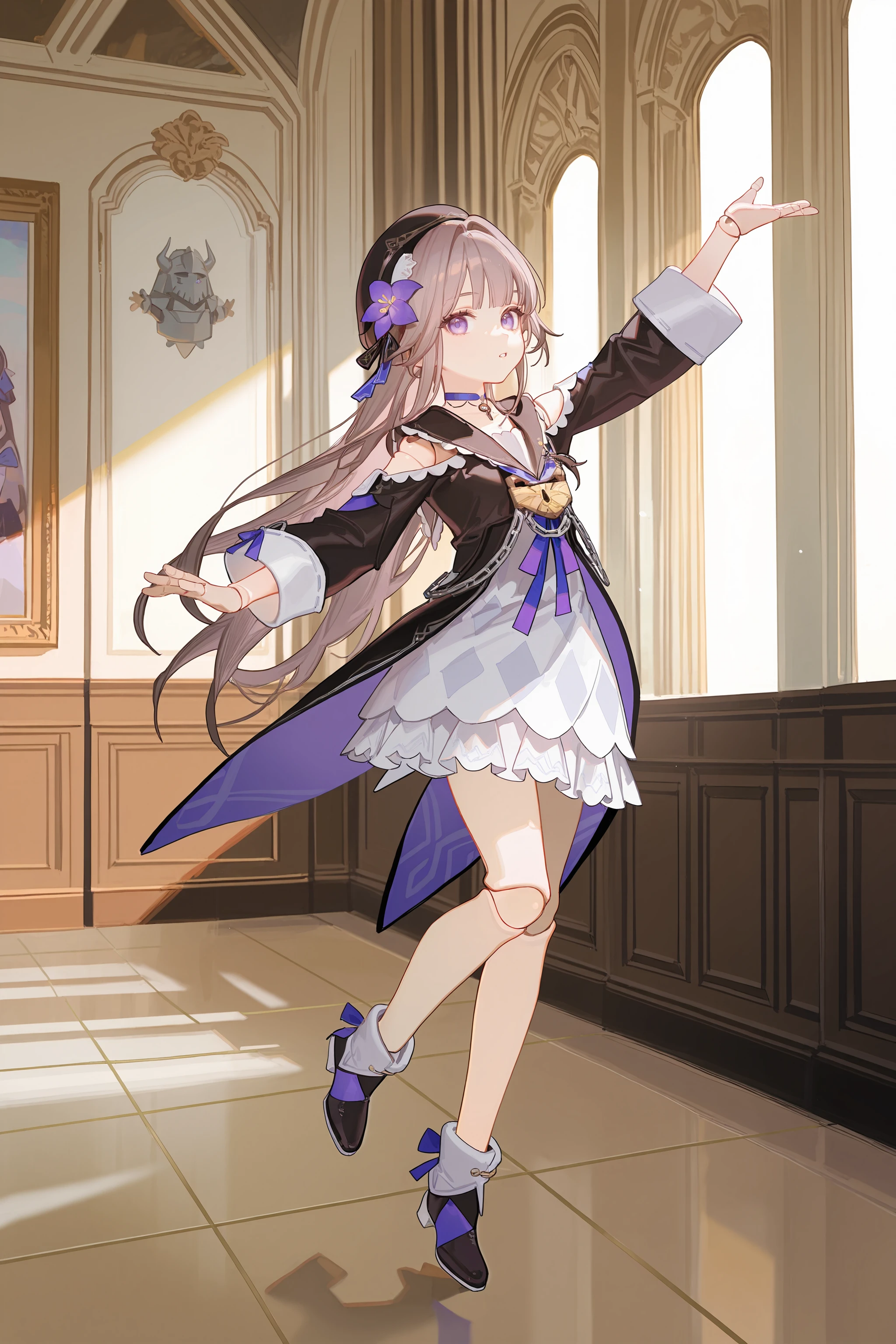 For Herta: herta \(honkai: star rail\), doll joints, aged down, beret, hair flower, white dress, black sailor dress, fold-over boots, key choker, chain, shoulder cutout