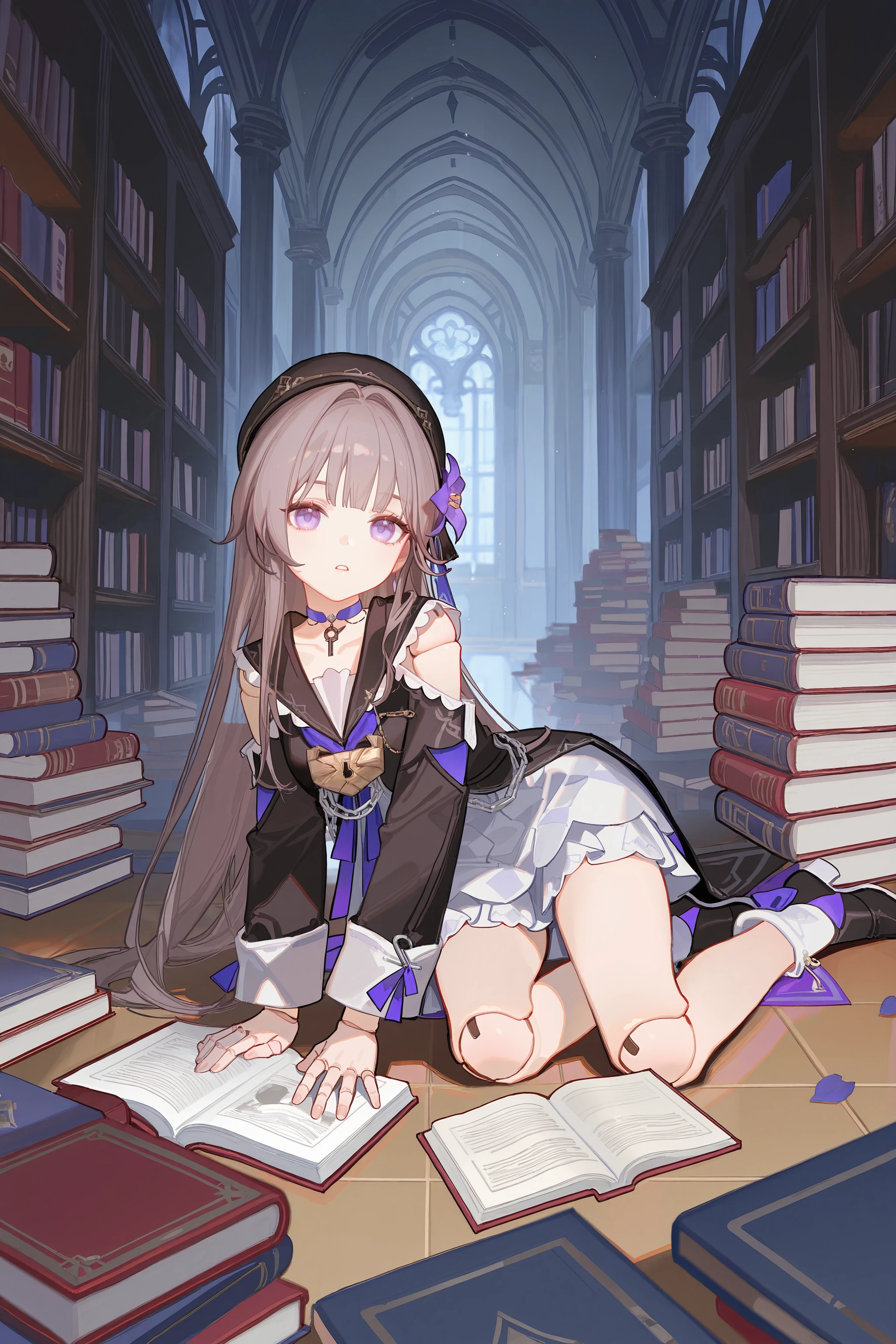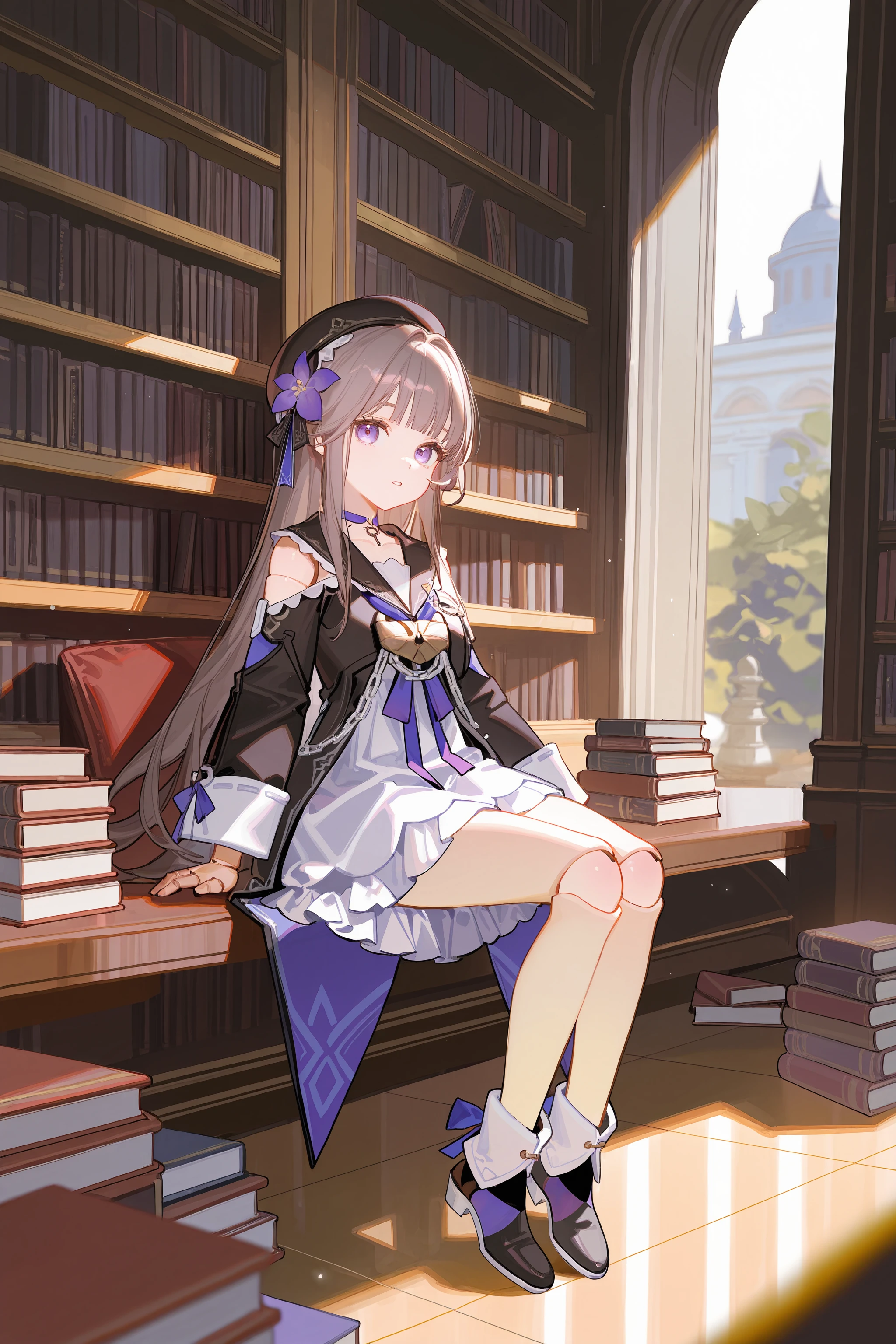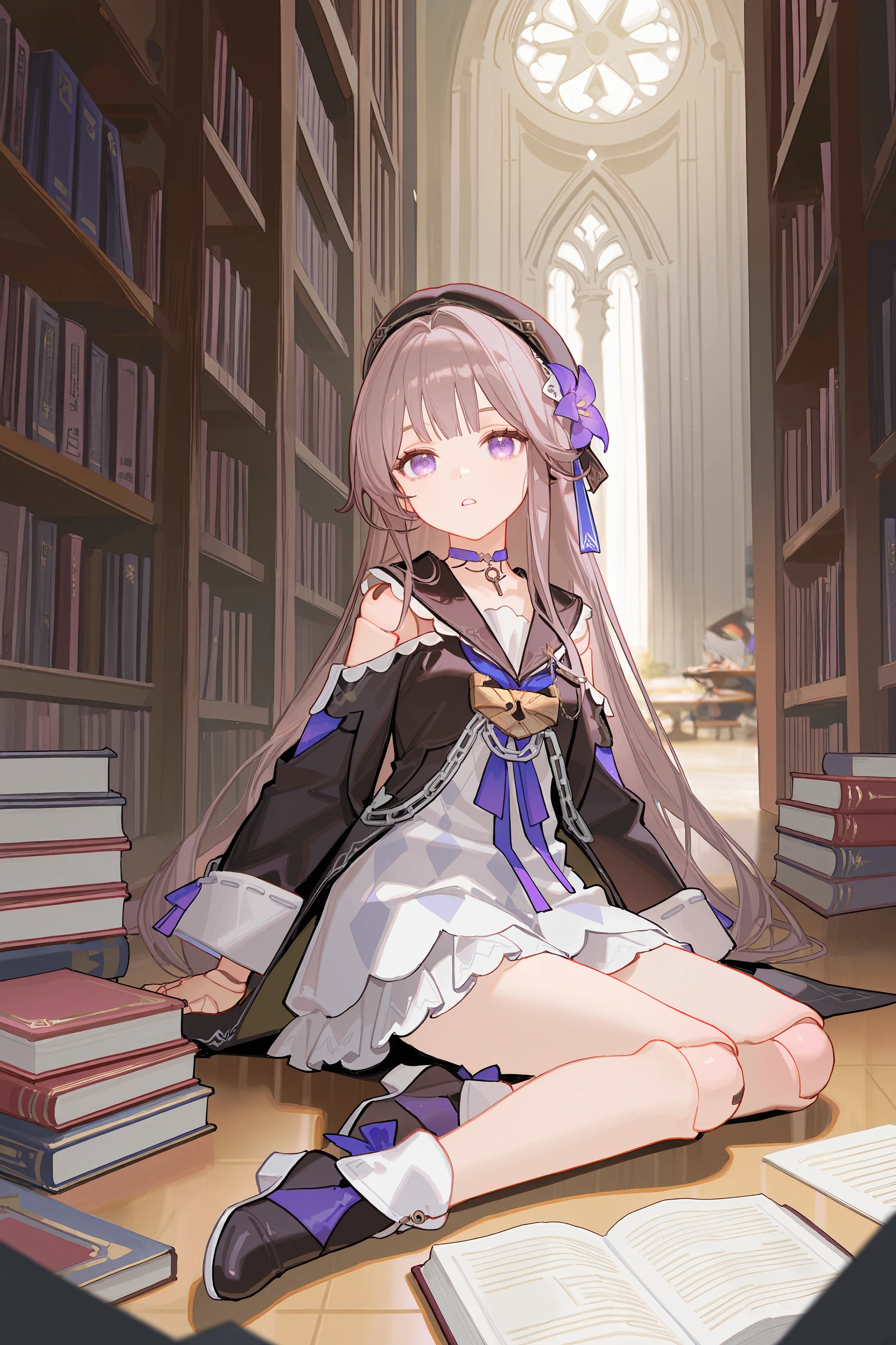 For Herta: herta \(honkai: star rail\), doll joints, aged down, beret, hair flower, white dress, black sailor dress, fold-over boots, key choker, chain, shoulder cutout