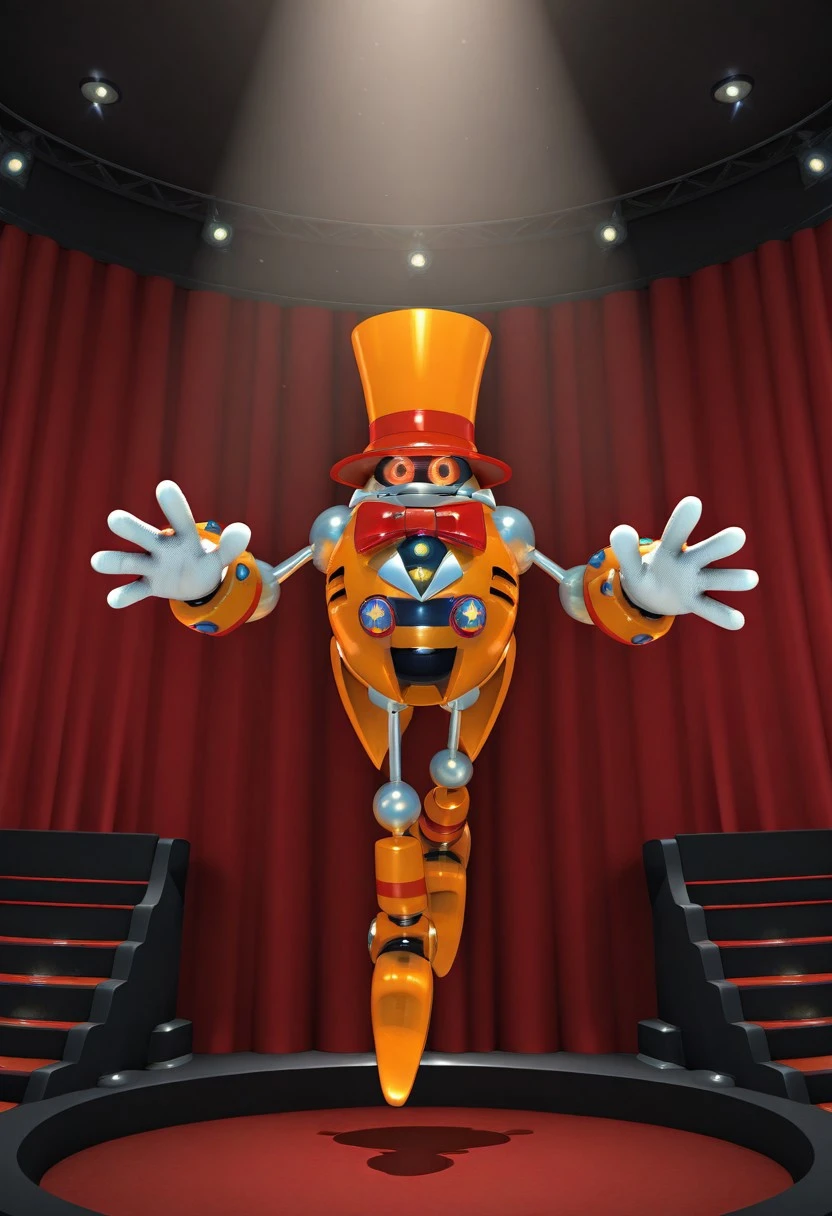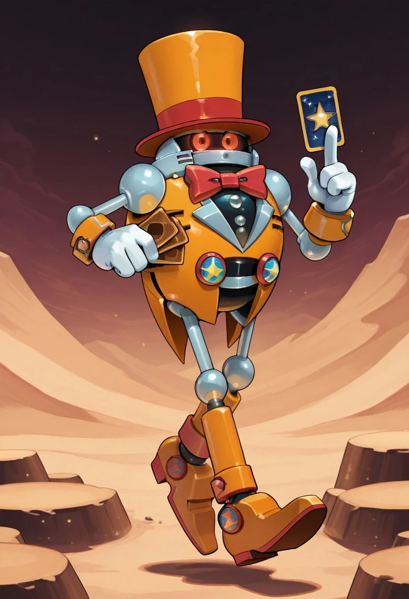 Heavy Magician, robot, gray metal skin, red eyes, orange top head, orange shirt, red bow tie, orange shoes, white gloves