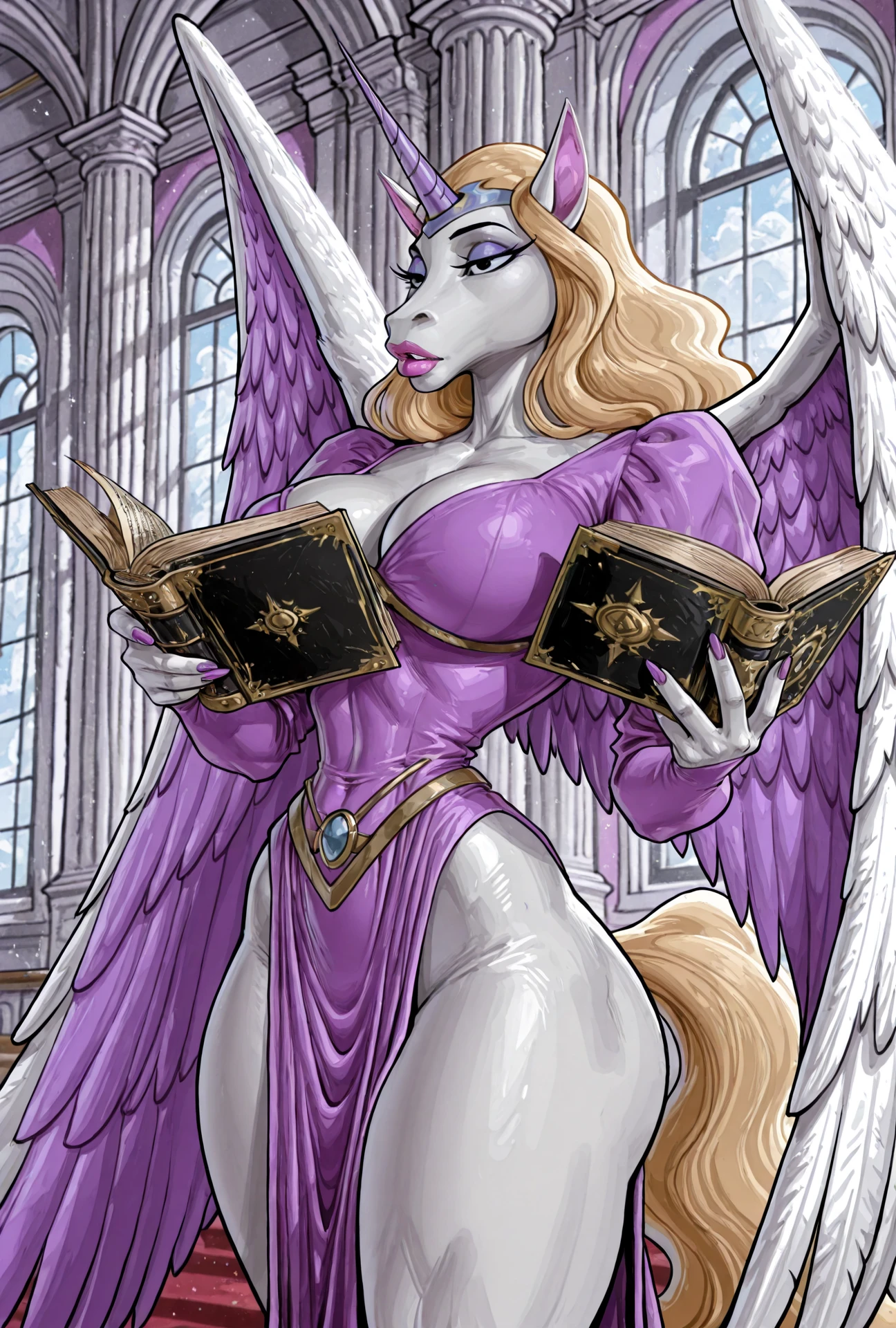 1girl, anthro unicorn, big breasts, curvy, feathered wings, single horn, pointy ears, blonde hair, blonde tail, black eyes,Optional: