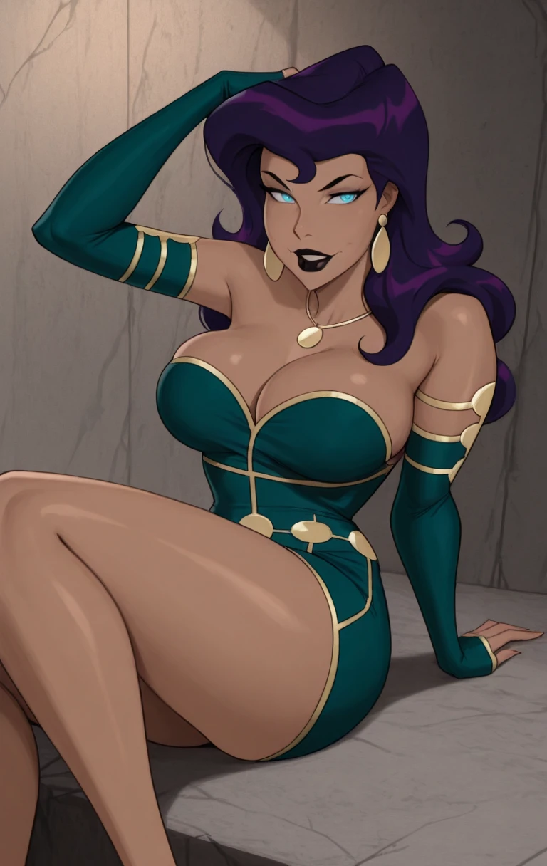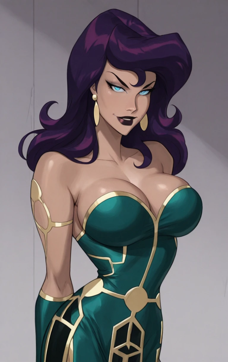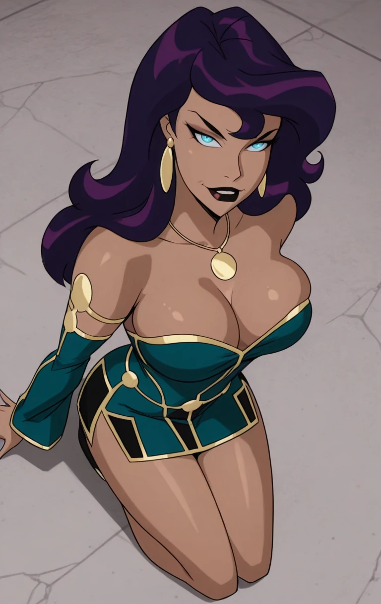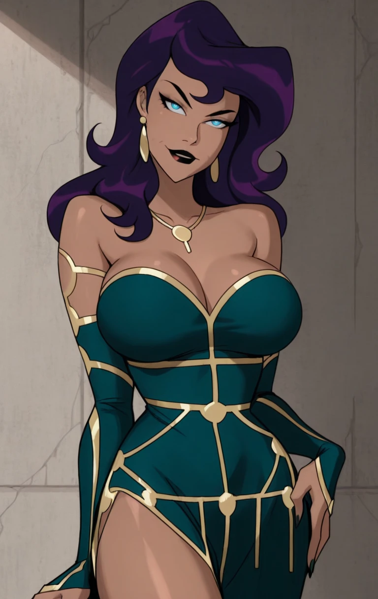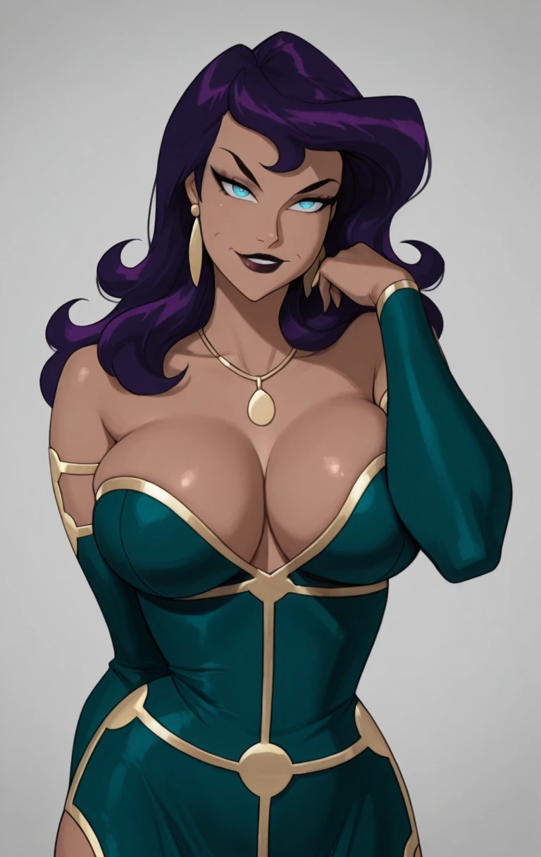 1girl, solo, 1girl, solo, long hair, breasts, looking at viewer, blue eyes, dress, jewelry, bare shoulders, purple hair, earrings, colored skin, colored sclera, green dress,necklace, dark skin,earrings, off shoulder, dark-skinned female,c1rc3c,