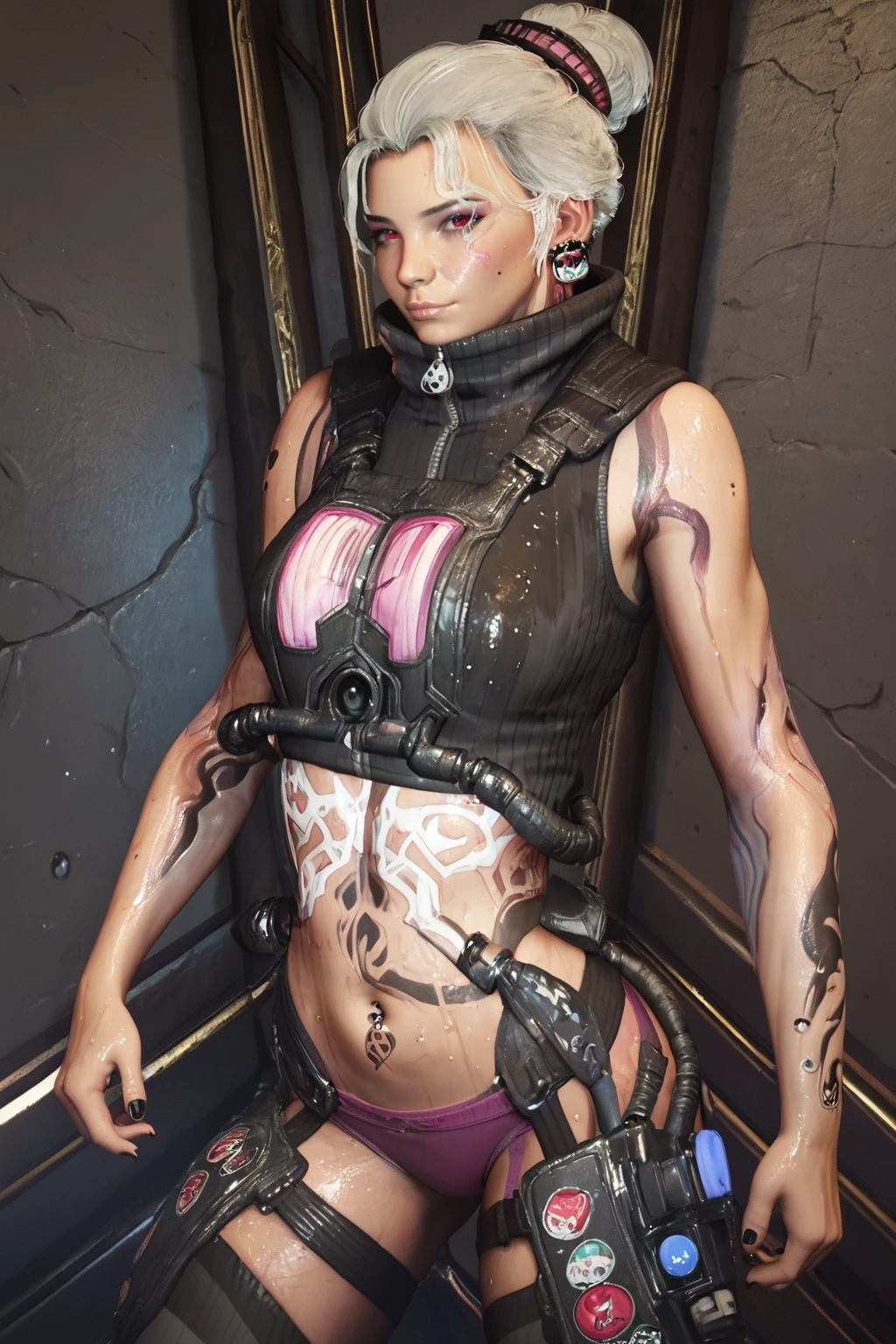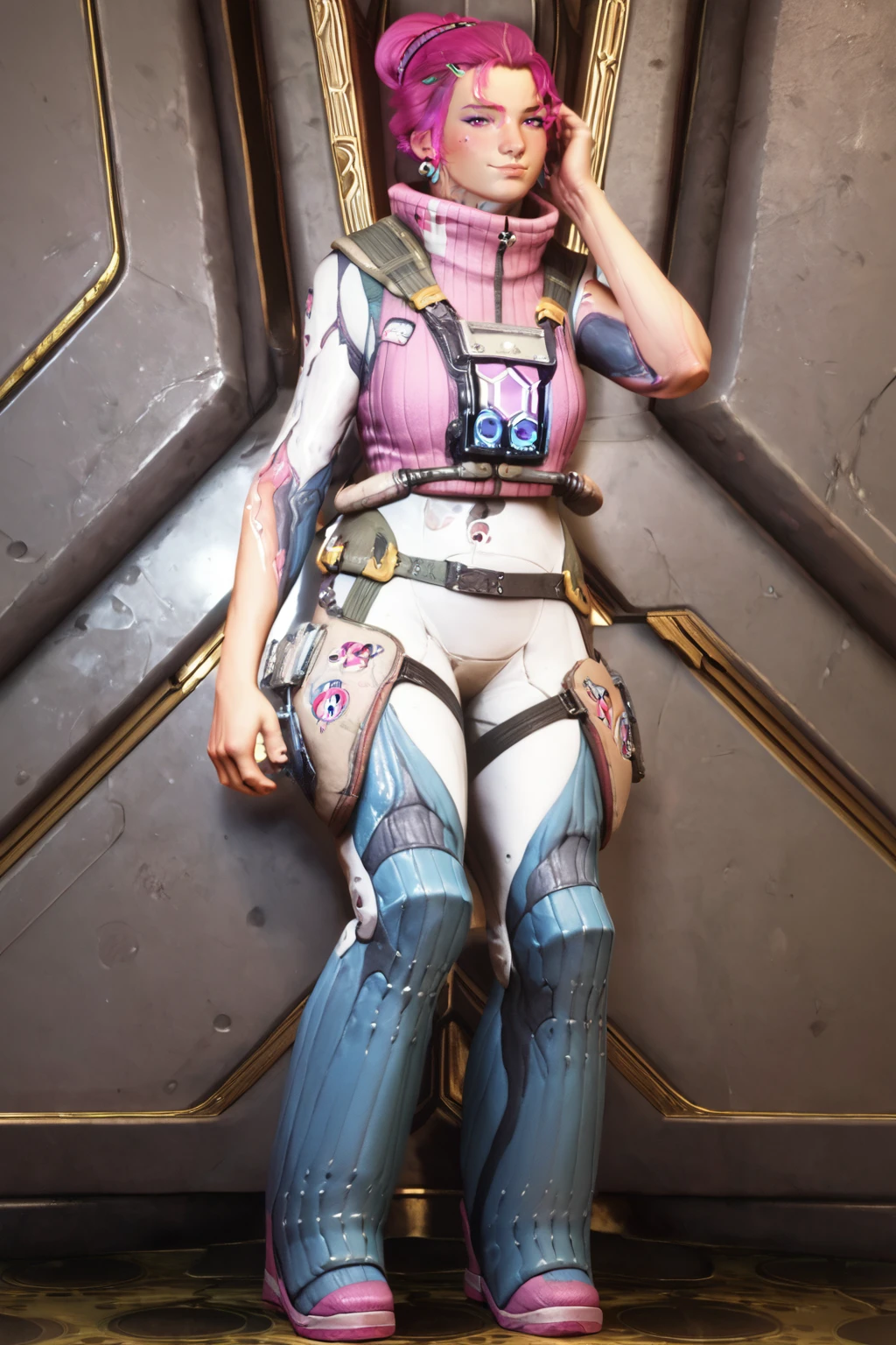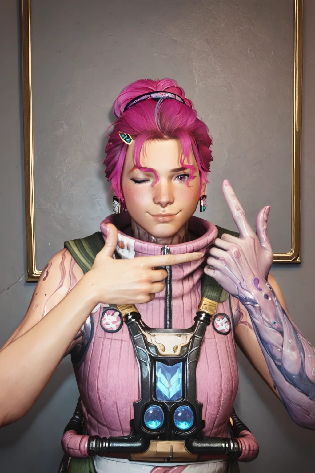 realistic, kaya, 1girl, hair bun, classic outfit, pink hair, pink eyes, pink turtleneck
