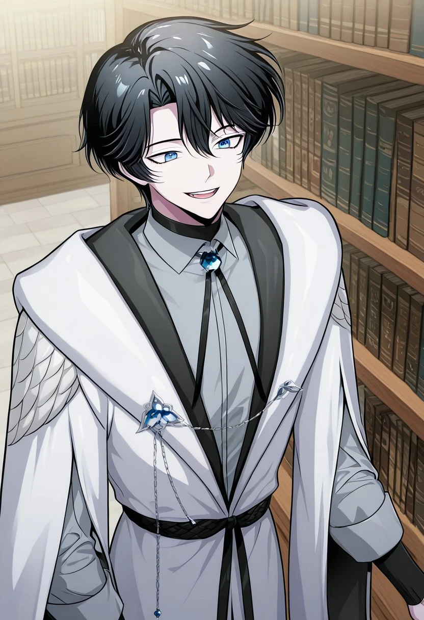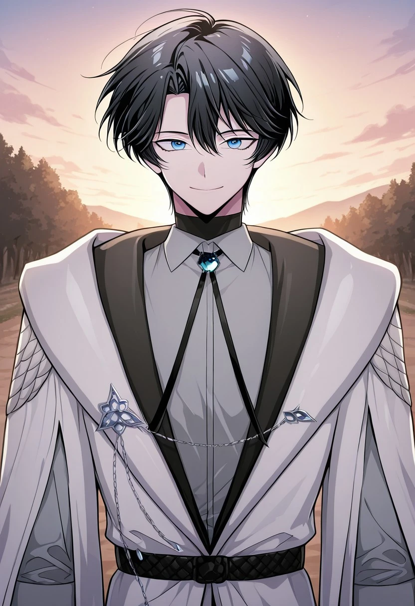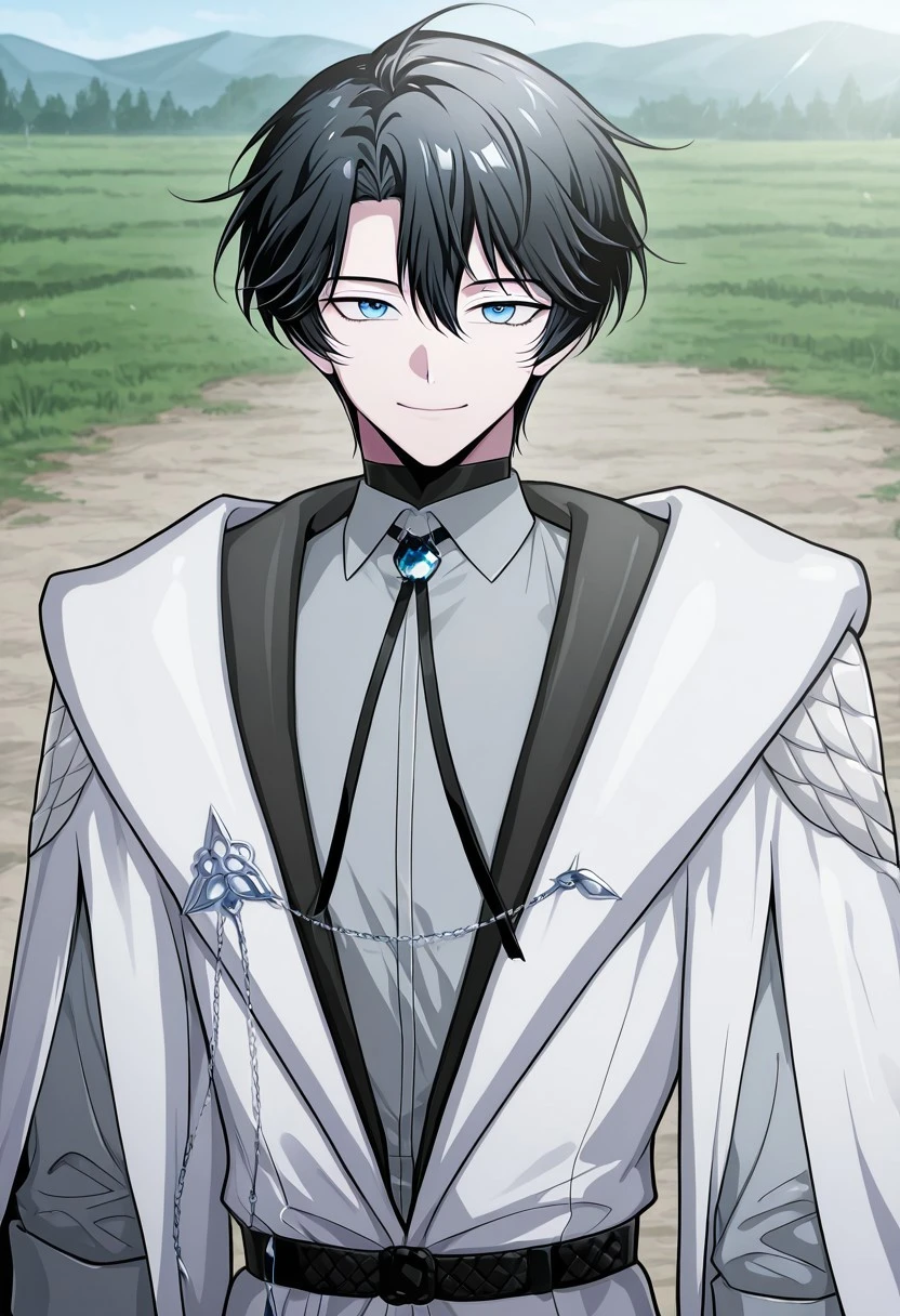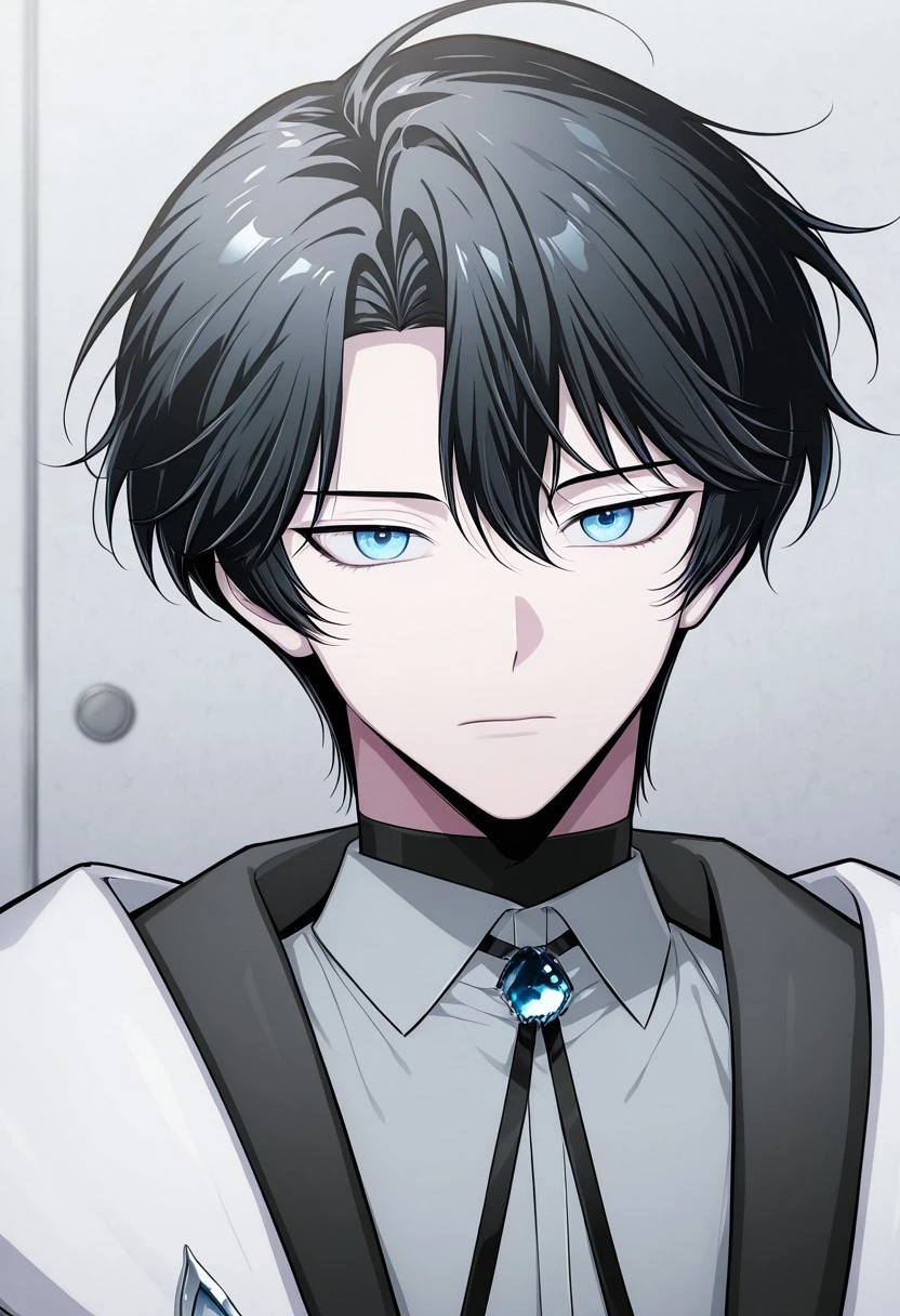 1boy, male focus, solo, blue eyes, black hair, black sweater, turtleneck, white shirt, open shirt, blue cape, brooch, shirt tucked in, black pants, boots, black footwear,