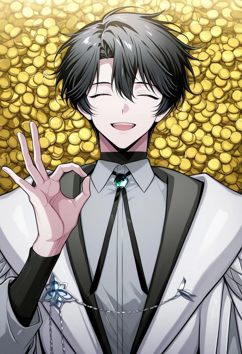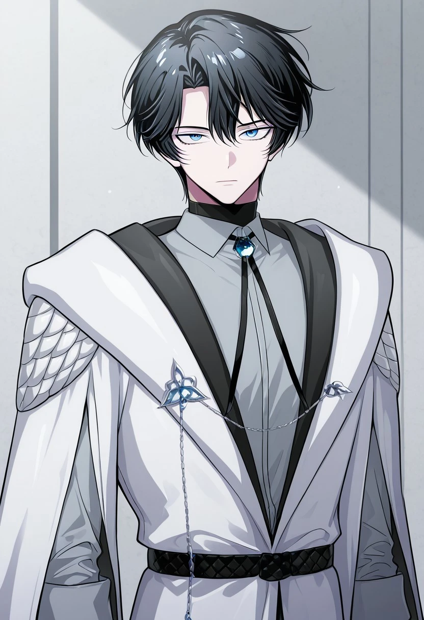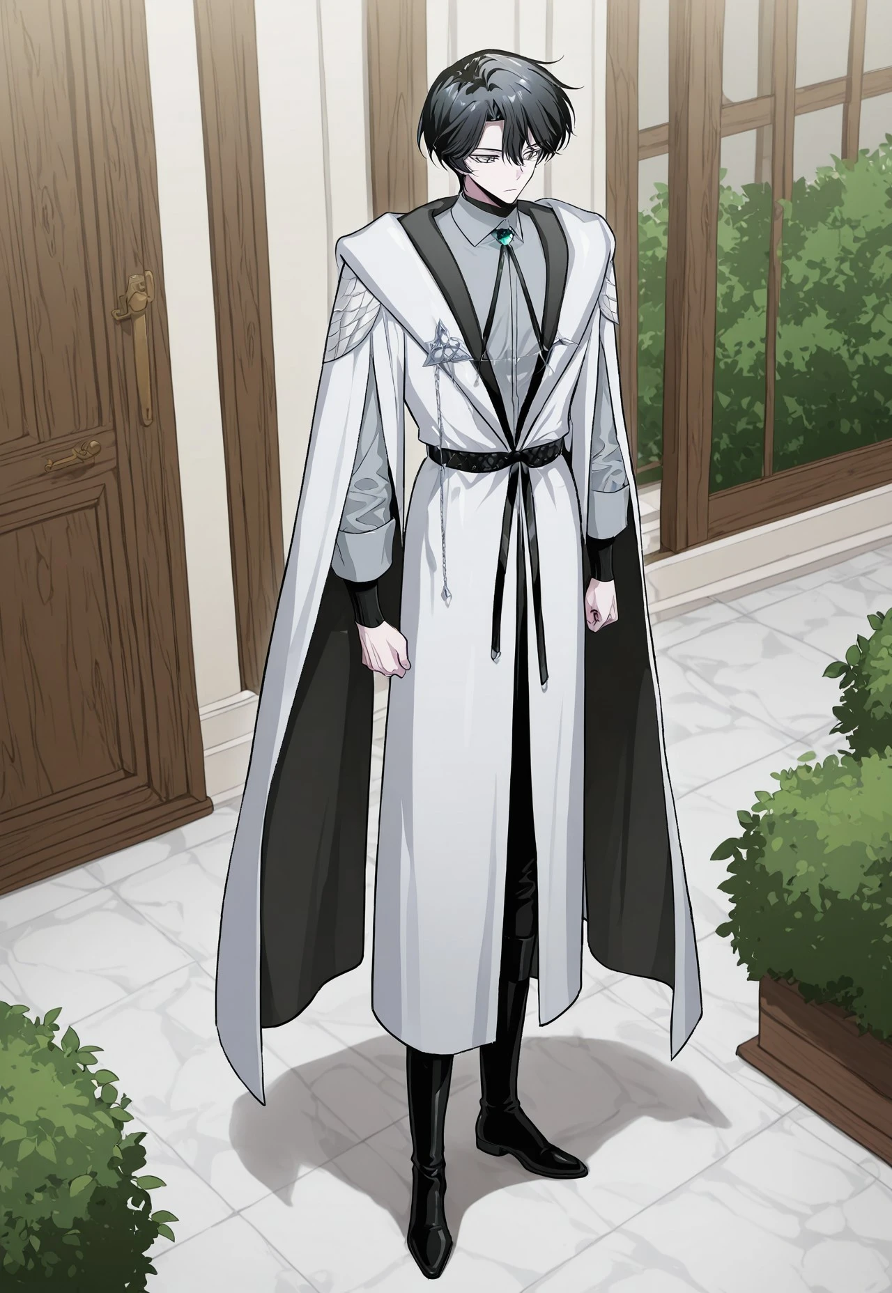 1boy, male focus, solo, blue eyes, black hair, black sweater, turtleneck, grey shirt, collared shirt, bolo tie, brooch, white coat, hood, belt, black pants, boots, black footwear,