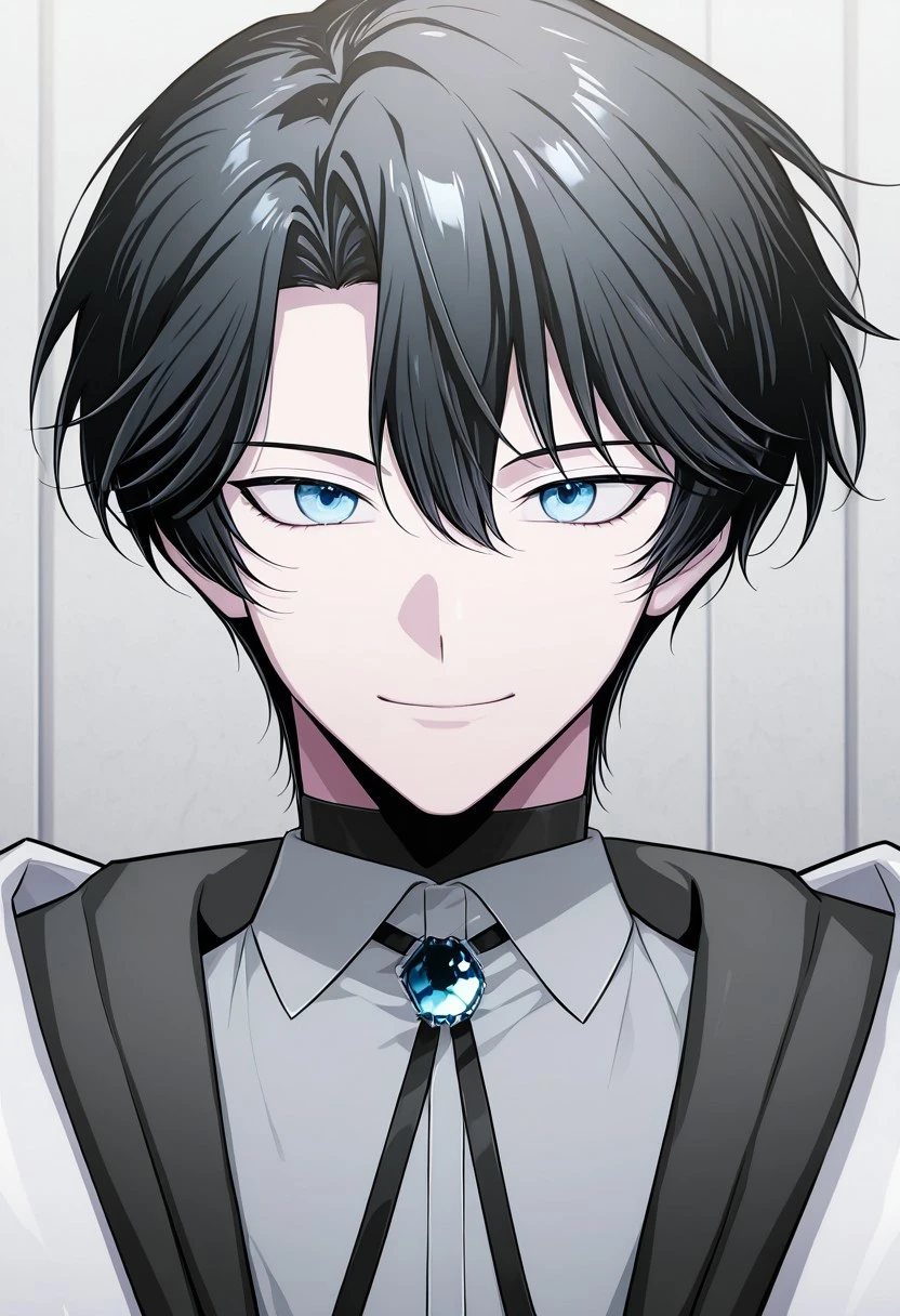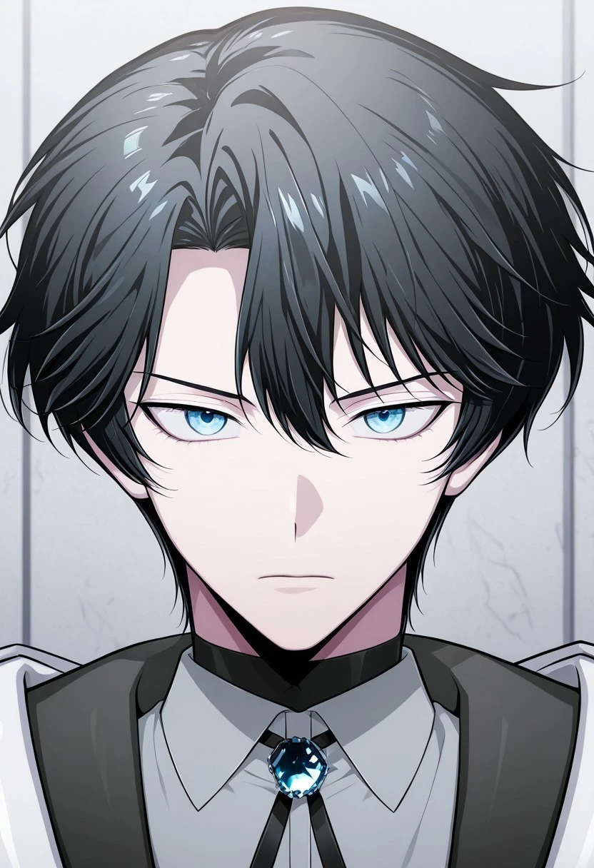 1boy, male focus, solo, blue eyes, black hair, black sweater, turtleneck, grey shirt, collared shirt, bolo tie, brooch, shirt tucked in, black pants, boots, black footwear,