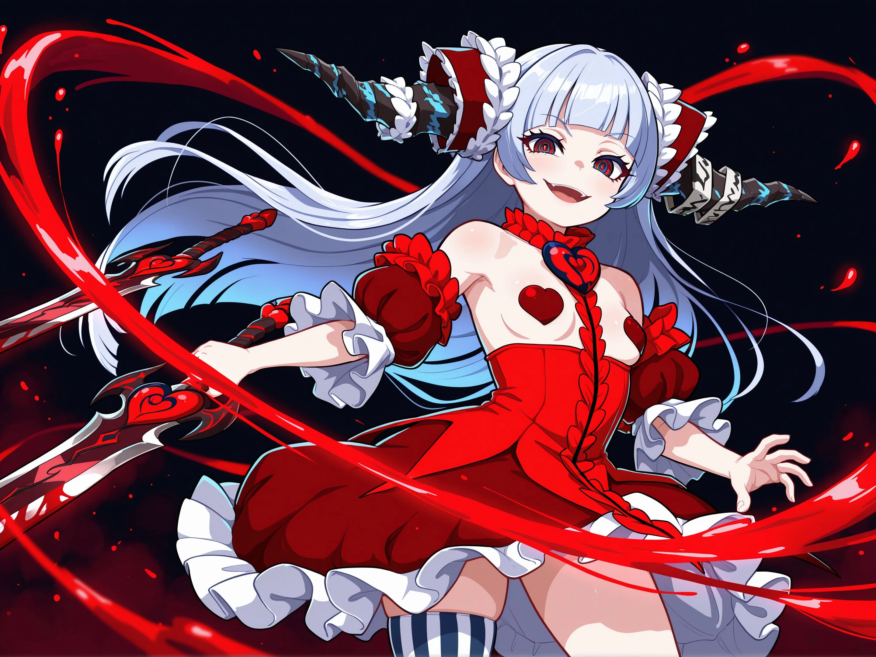 DiaboliqueOrigine: dorigin, hair ornament, hair bow, horns, heart brooch, red dress, frills, bare shoulders, detached sleeves, puffy sleeves, heart pasties, single thighhigh, vertical stripes, asymmetrical legwear, high heels