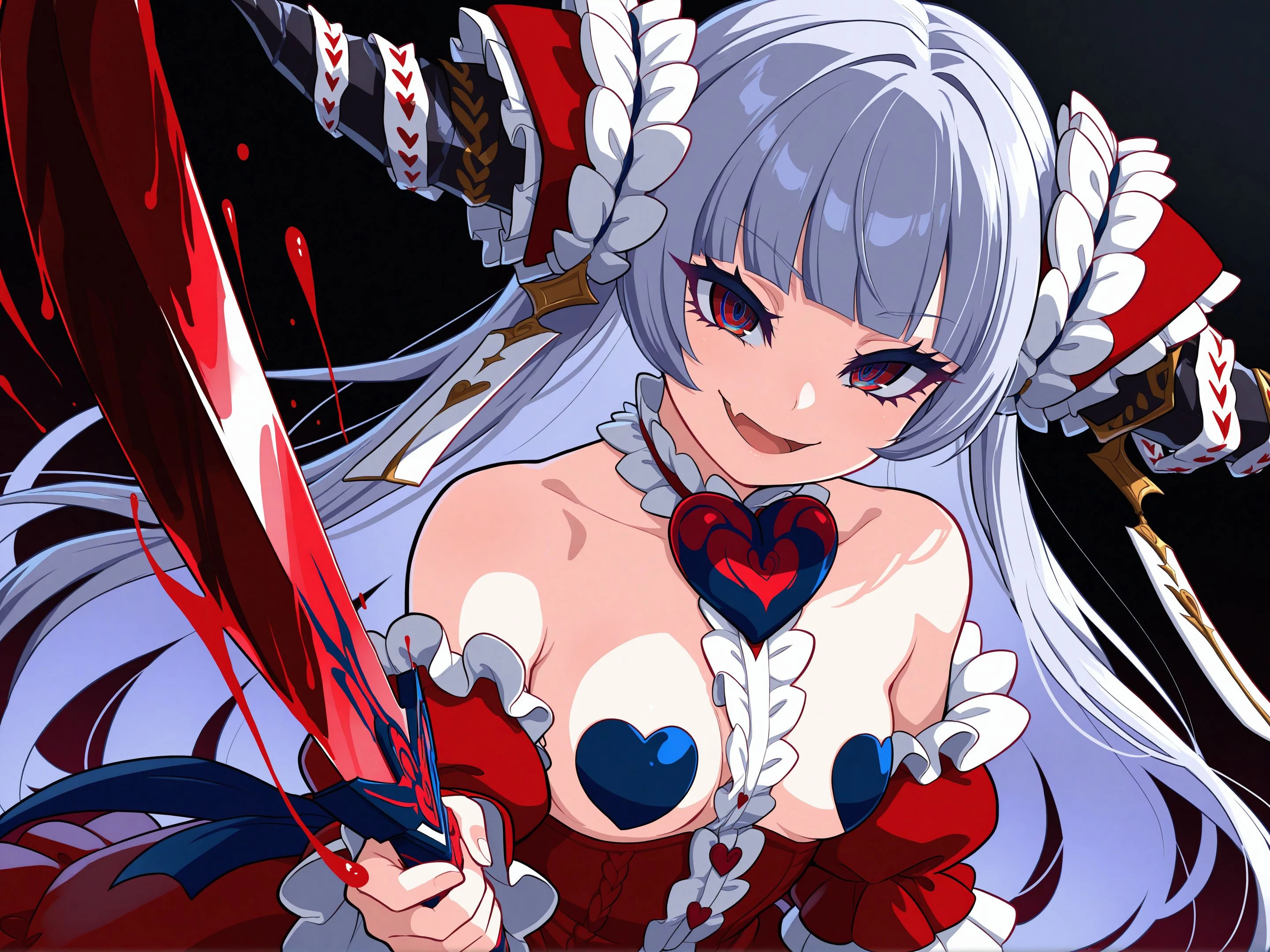 eyelashes, multicolored eyes, blue eyes, brown eyes, red eyes, yellow eyes, purple eyes, gradient hair, gray hair, blunt bangs, shiny hair,