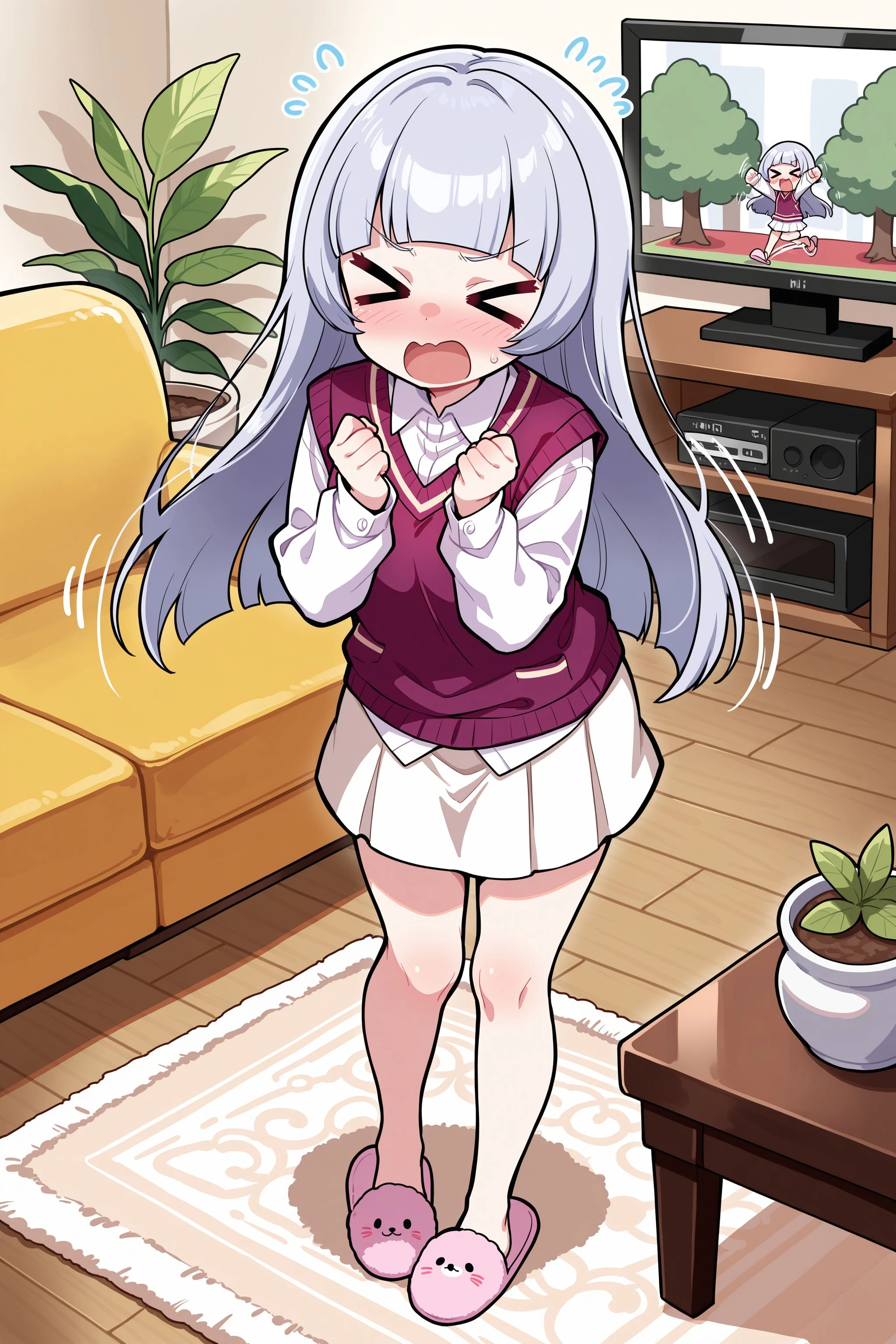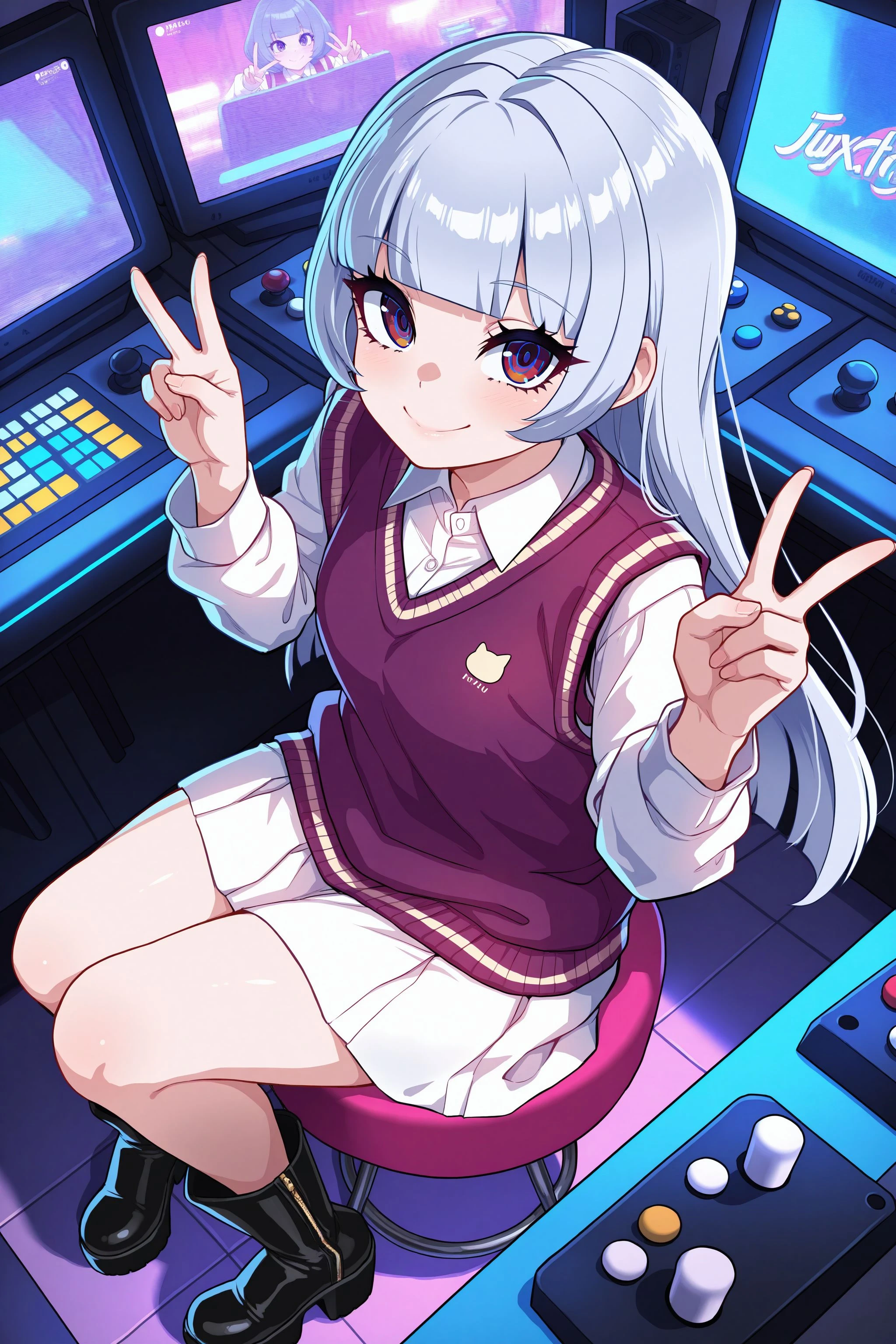 HolidayCasual: hcasual, collared shirt, white shirt, long sleeves, sweater vest, purple vest, miniskirt, white skirt, black footwear, boots