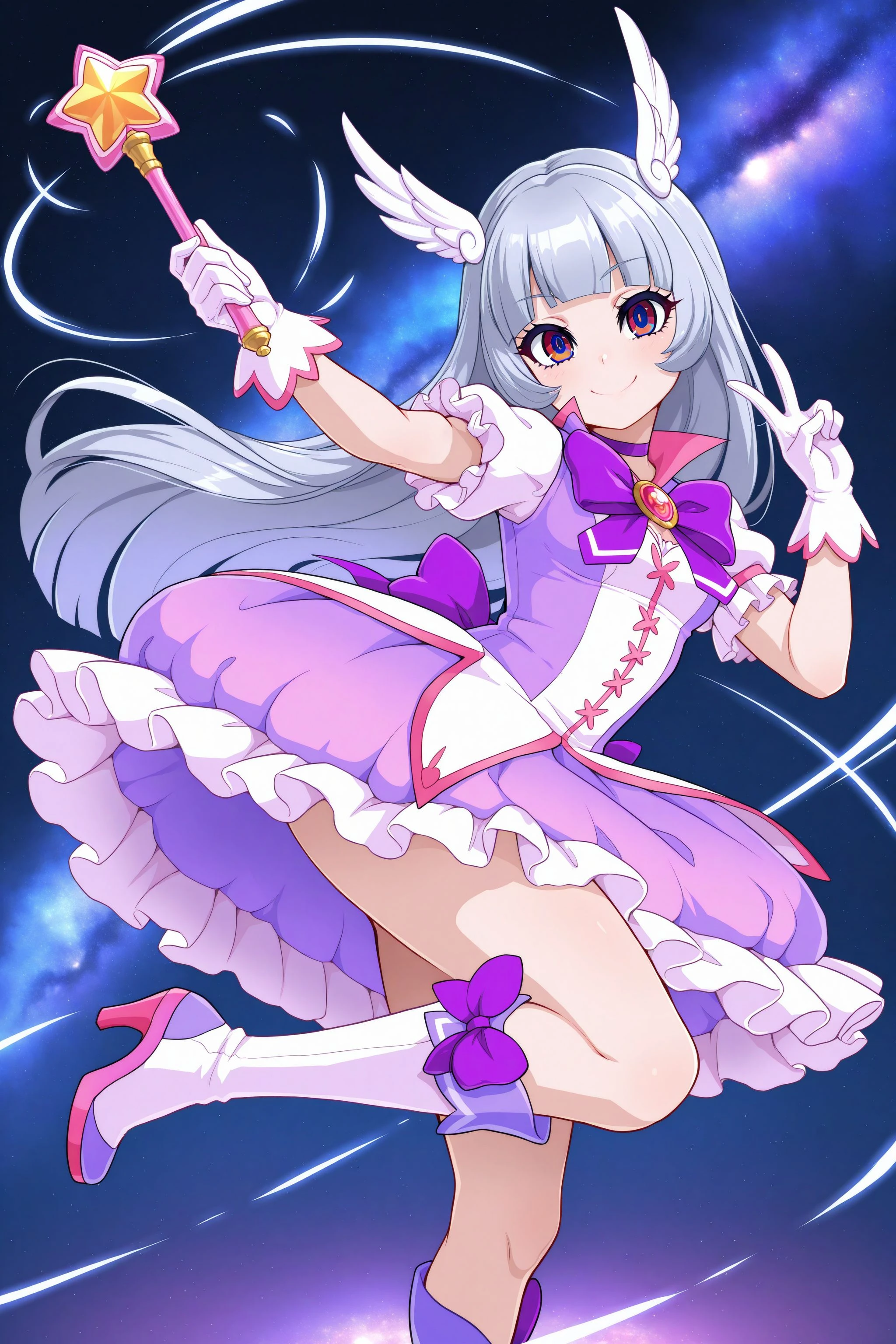 Magica2019: magica2019, wing hair ornament, choker, purple dress, bowtie, brooch, purple bow, short sleeves, frills, white gloves, knee boots, purple footwear. heels