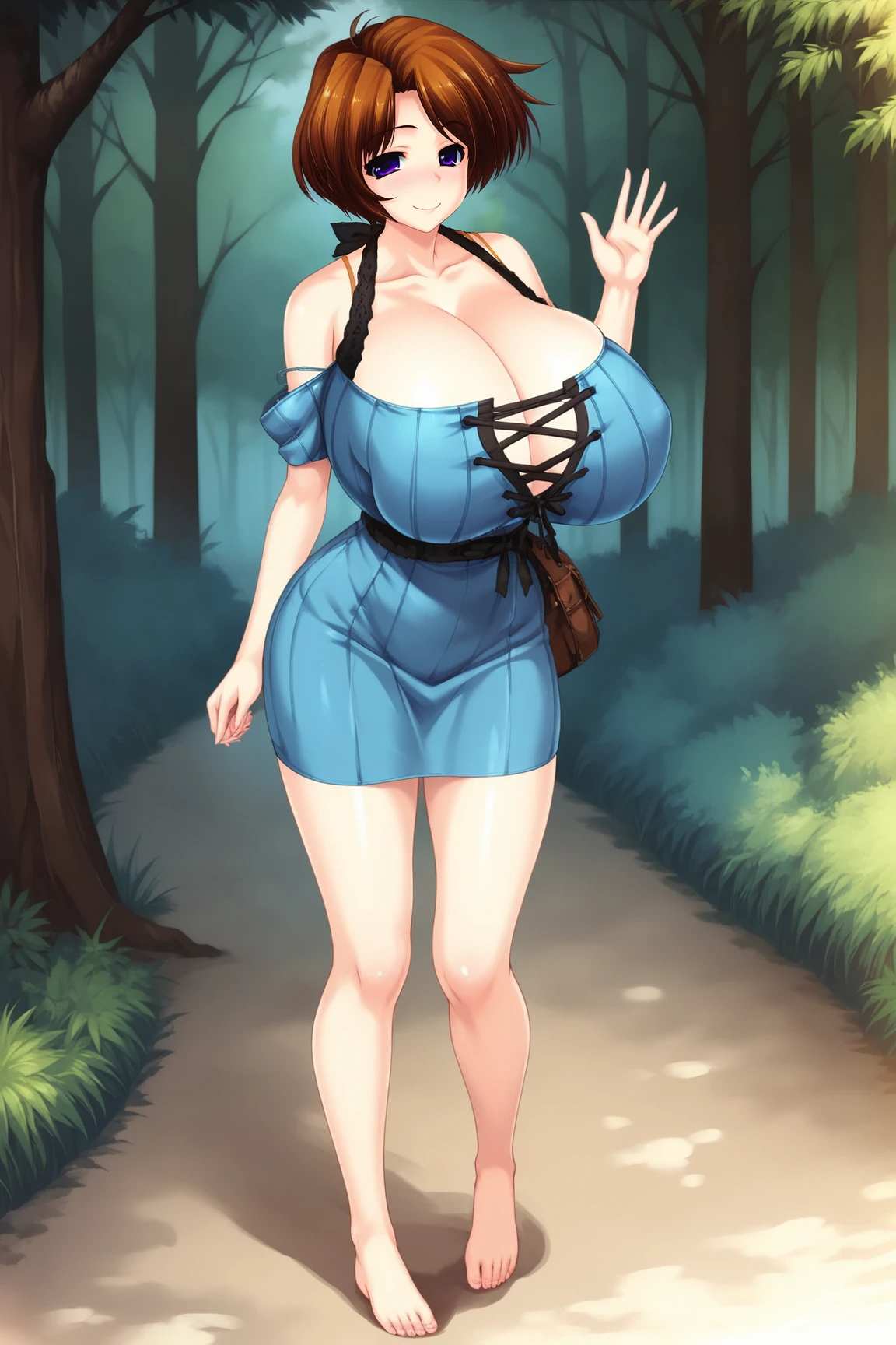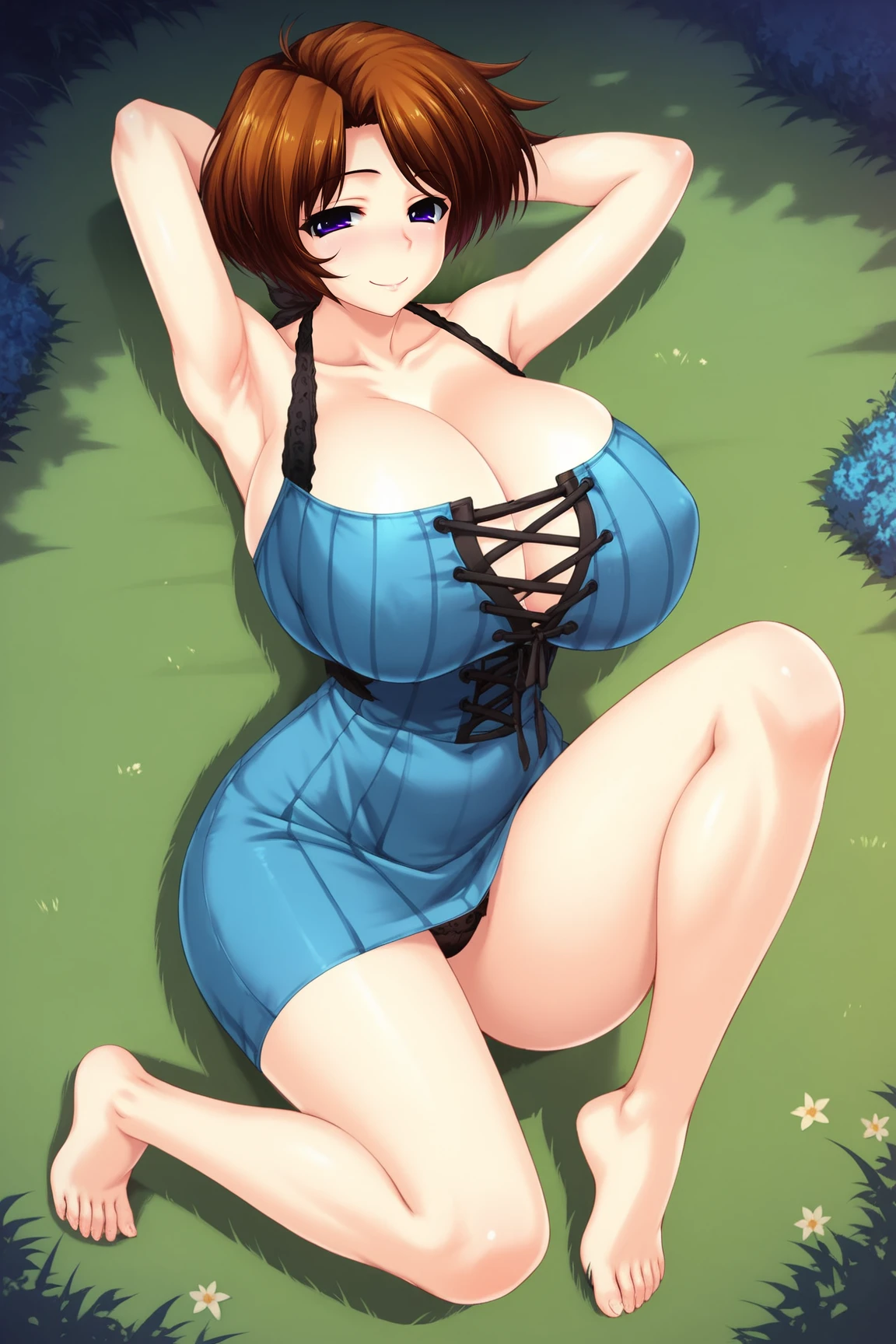 MinatoKurasakiSRPXL, purple eyes, brown hair, short hair, huge breasts, bare shoulders, cleavage, blue dress, cross-laced clothes, miniskirt, blue skirt, barefoot