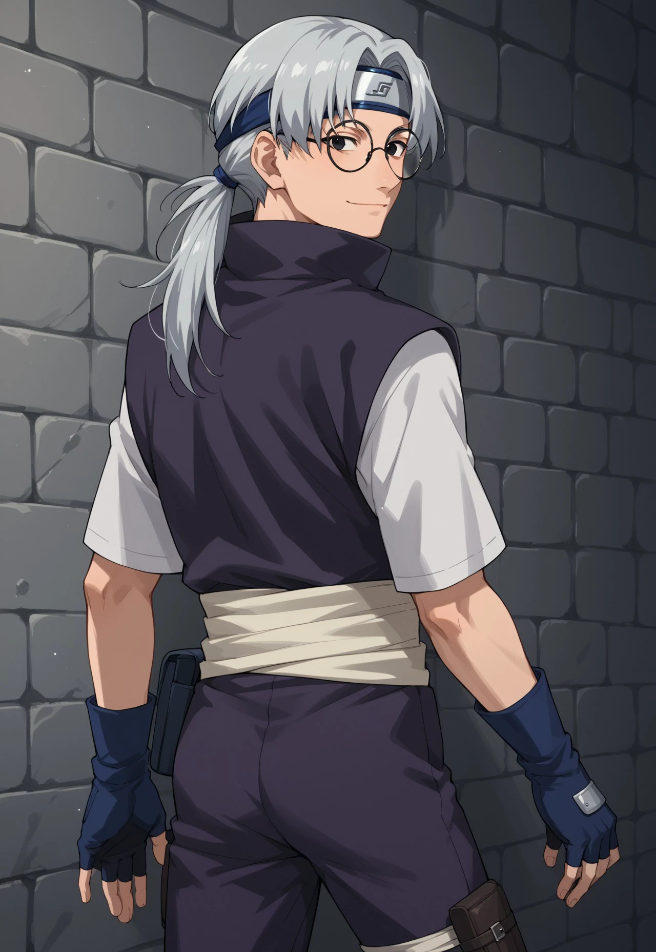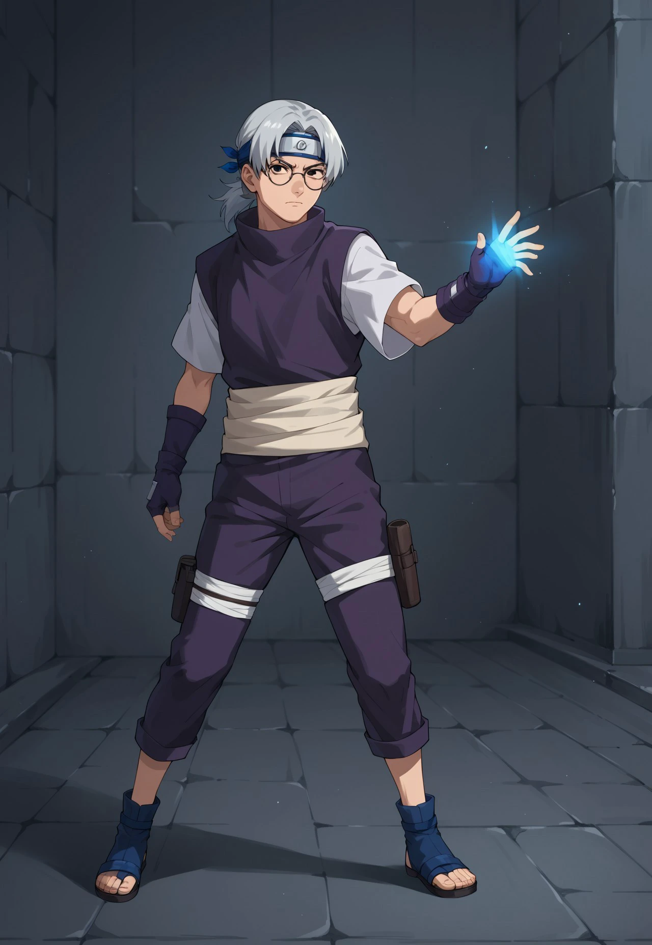 forehead protector, headband, purple shirt with white sleeves, purple pants, blue shoes, sandals, gloves, fingerless gloves, butt pack, leg pouch, waist sash