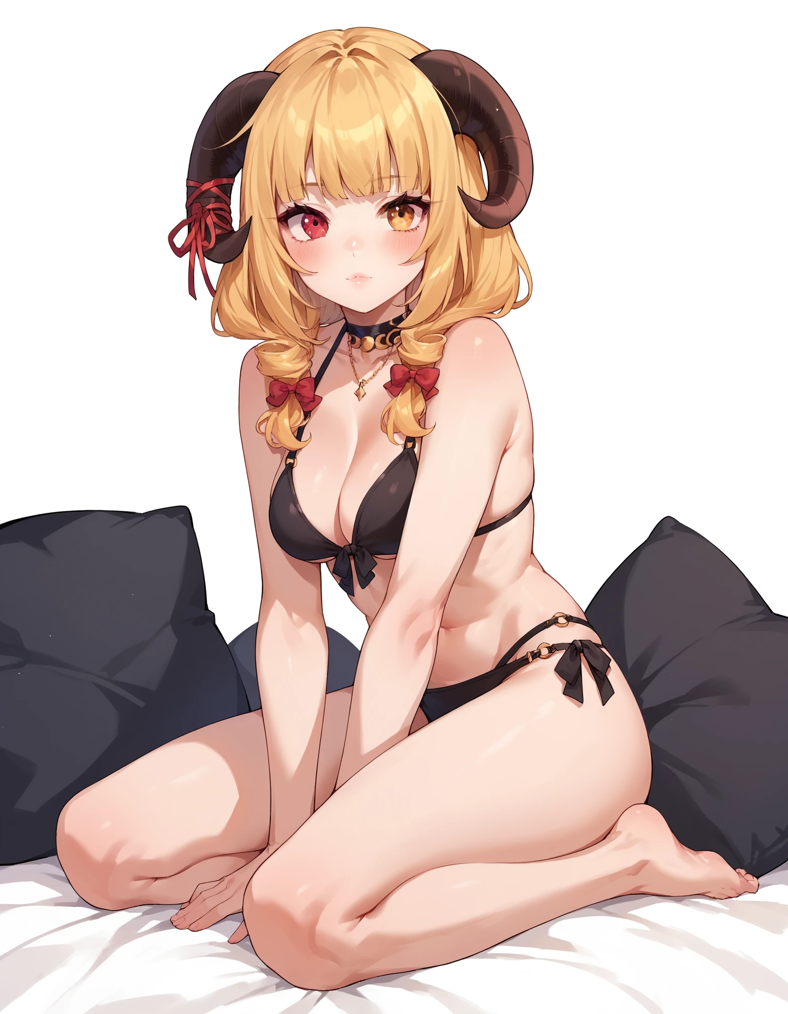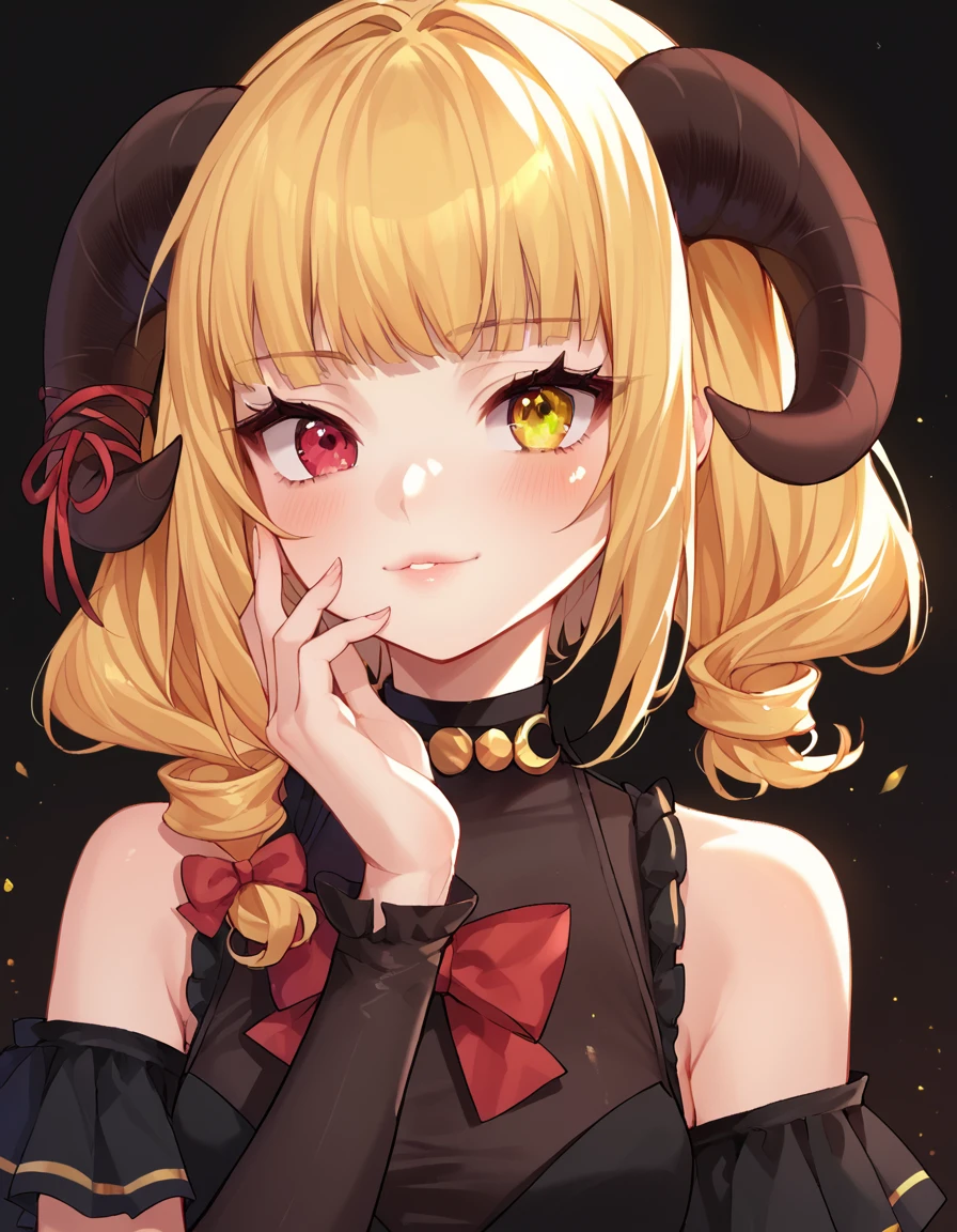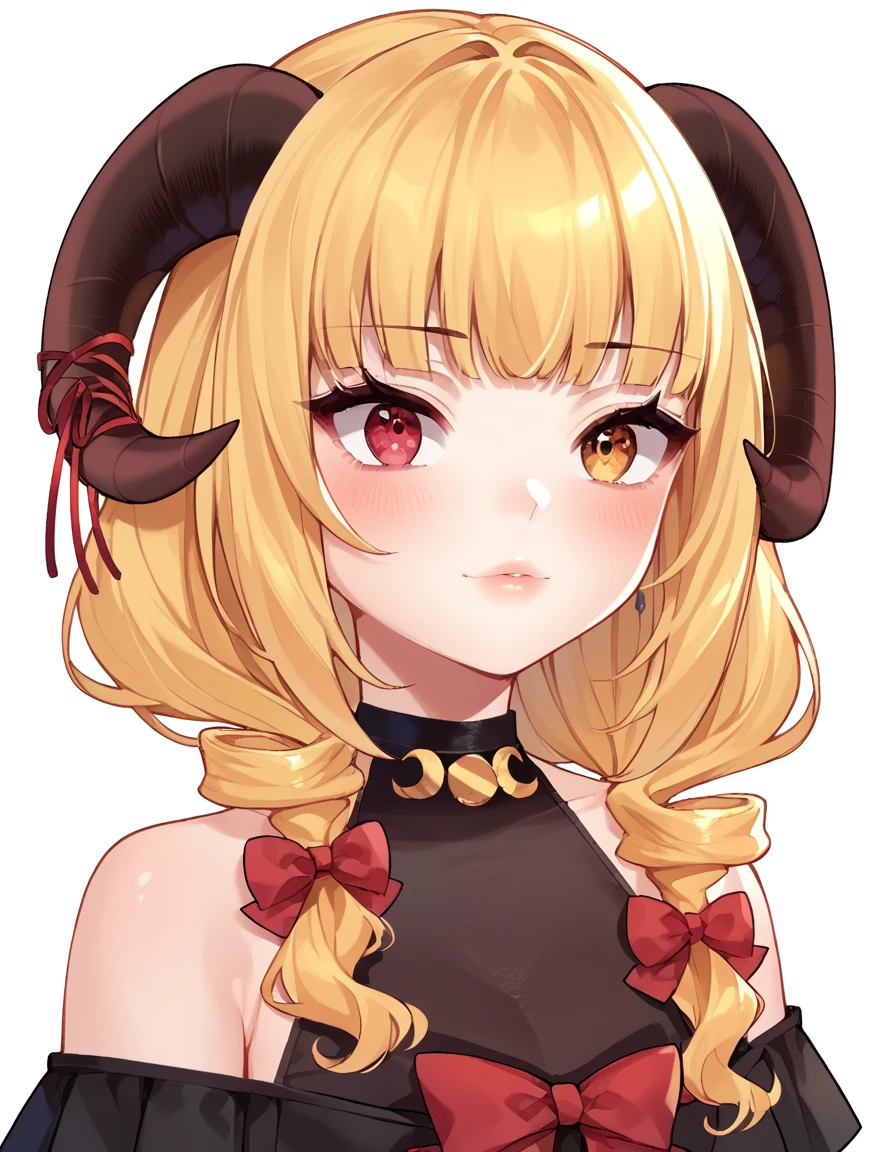 jinja,1girl ,solo ,blond hair , horns ,heterochromia,red eyes,yellow eyes