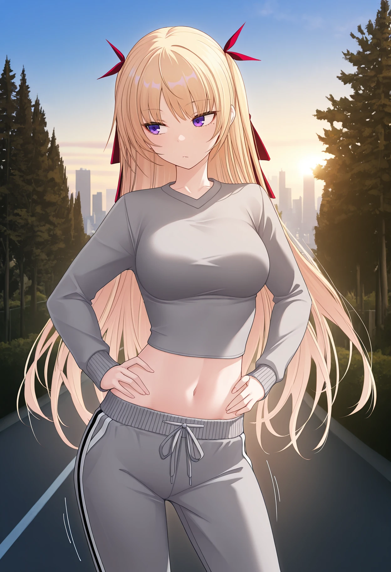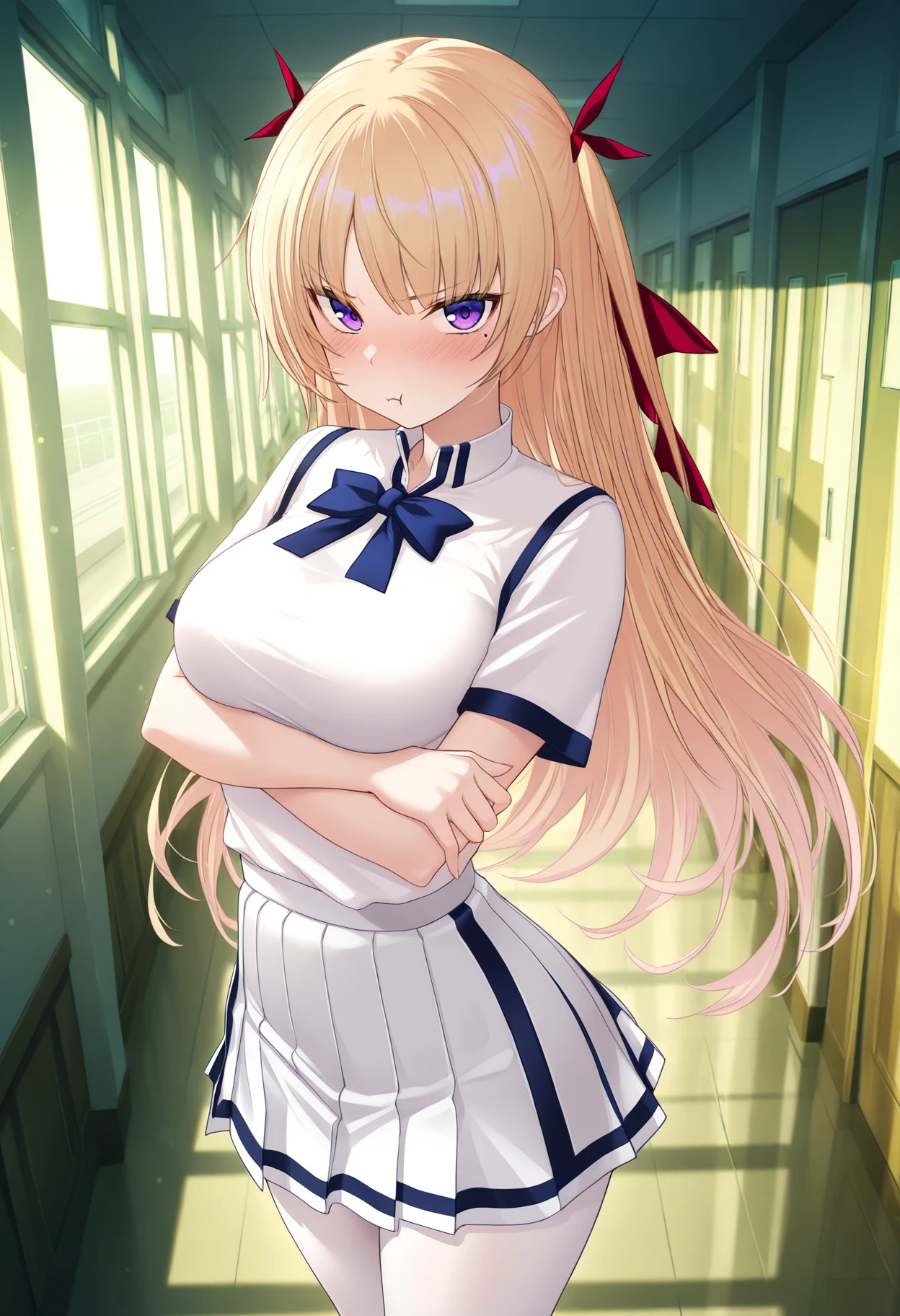 KJOchris, blonde hair, purple eyes, hair ornament, two-side up, long hair, single mole under eye,