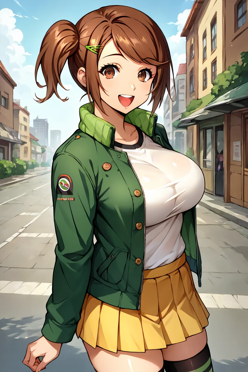 bodysuit, gloves, bare shoulders, navel, underwear, bare thighs, green thighhighs, large breasts, brown hair, swept bangs, side ponytail, brown eyes,